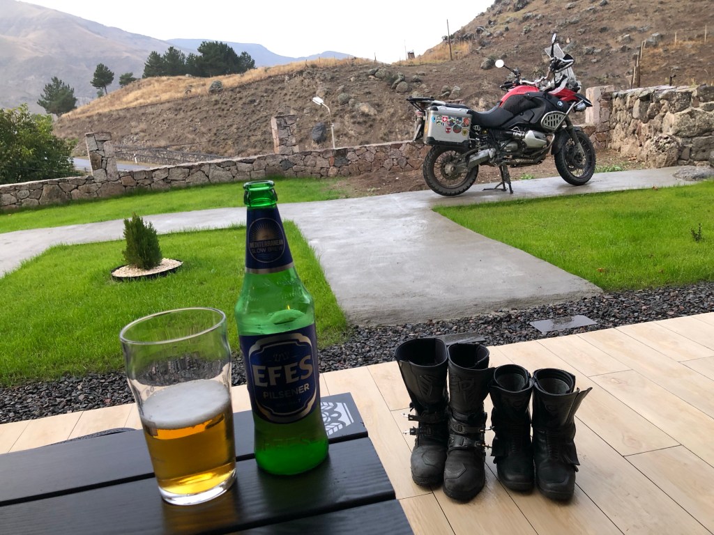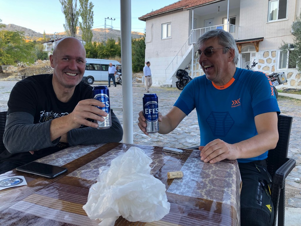 Ein gemeinsames Stiefelbier mit Roland (Österreicher & Harley-Fahrer). Das Efes-Bier musste aus einem nahe gelegenen Hotel geholt werden, durfte aber in der Pension getrunken werden.
