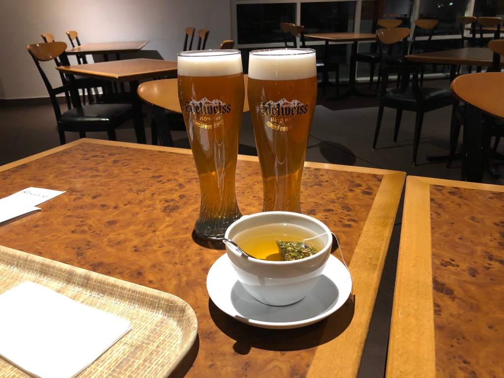 Eiskaltes Erdinger Weißbier und Kräutertee
