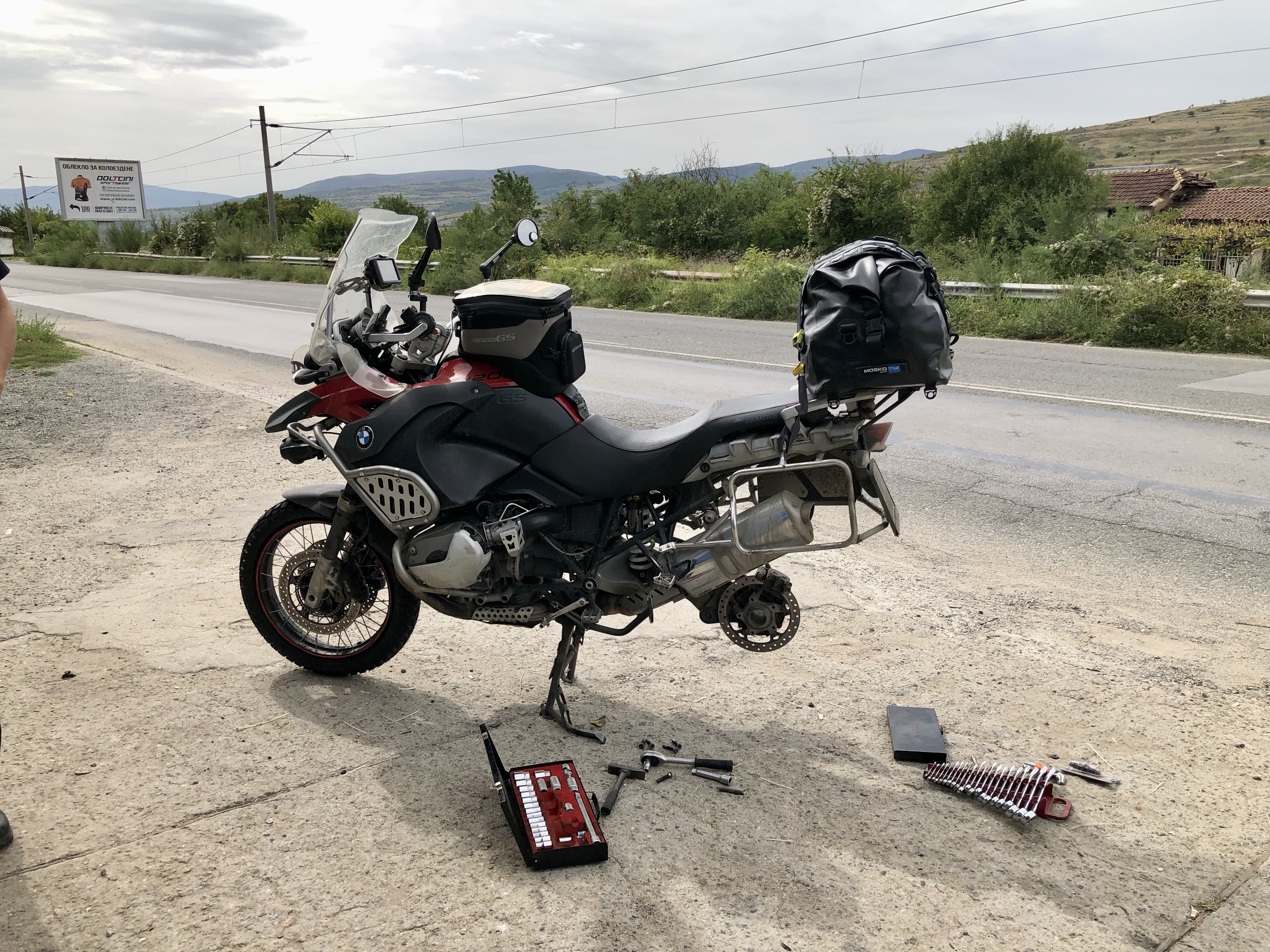 …. irgendwas mit den neuen Reifen passte nicht. Der Garmin-Luftdruck-Checker zeigte immer weniger und weniger hinten und vorne an. Sehr bedenklich, waren die Gummis doch ganz neu und gefahren waren wir nach dem Wechsel auch nicht. Zwei Plattfüsse? Aber was soll´s, wir steuerten eine Reifenwerkstatt in Dscherman an. Gepäck runter und Reifen abmontiert, gleich war klar, die undichten Stellen war bei den gebogenen neu eingebauten Ventilen, die wir uns aufschwatzen liessen. Es kostete dem Mechaniker eine halbe Stunde Arbeit und leider auch eine halbe Stunde weniger von seiner Mittagspause. Wir waren dankbar, dass der Fehler so rasch gefunden war und daher liessen wir uns beim Trinkgeld auch nicht lumpen.