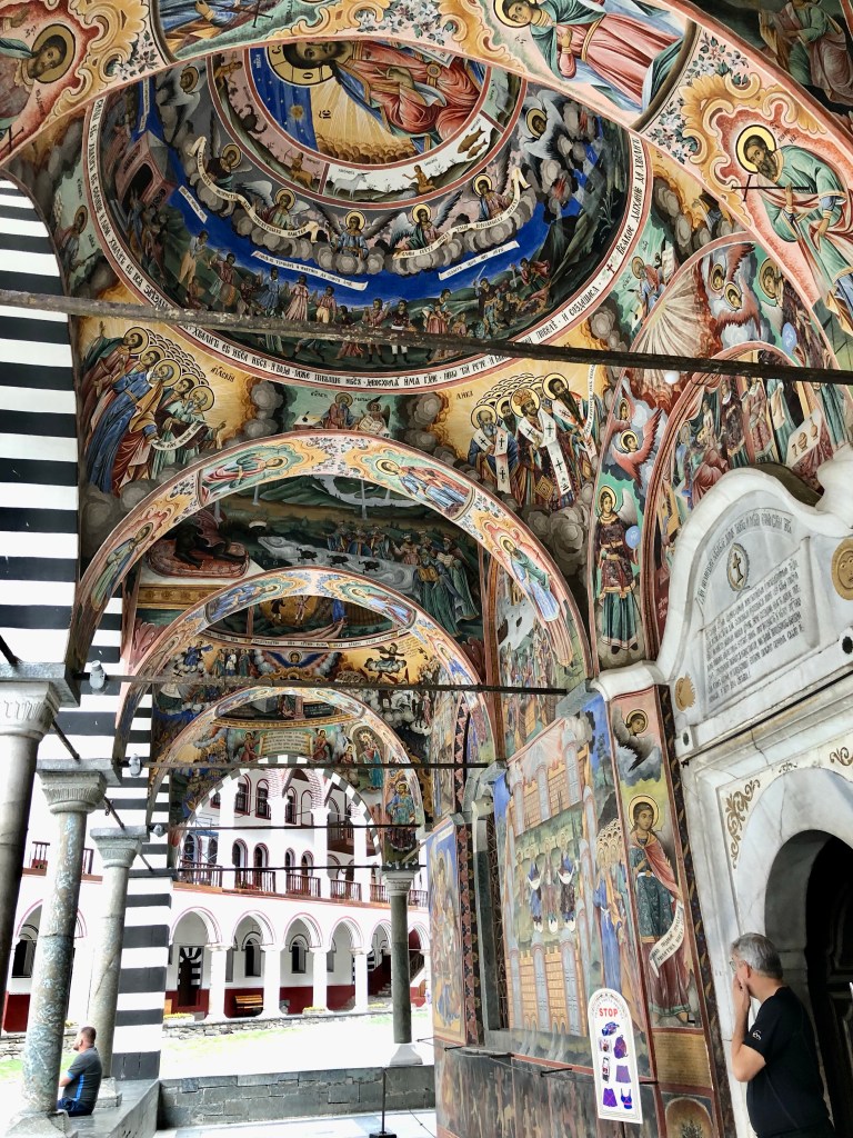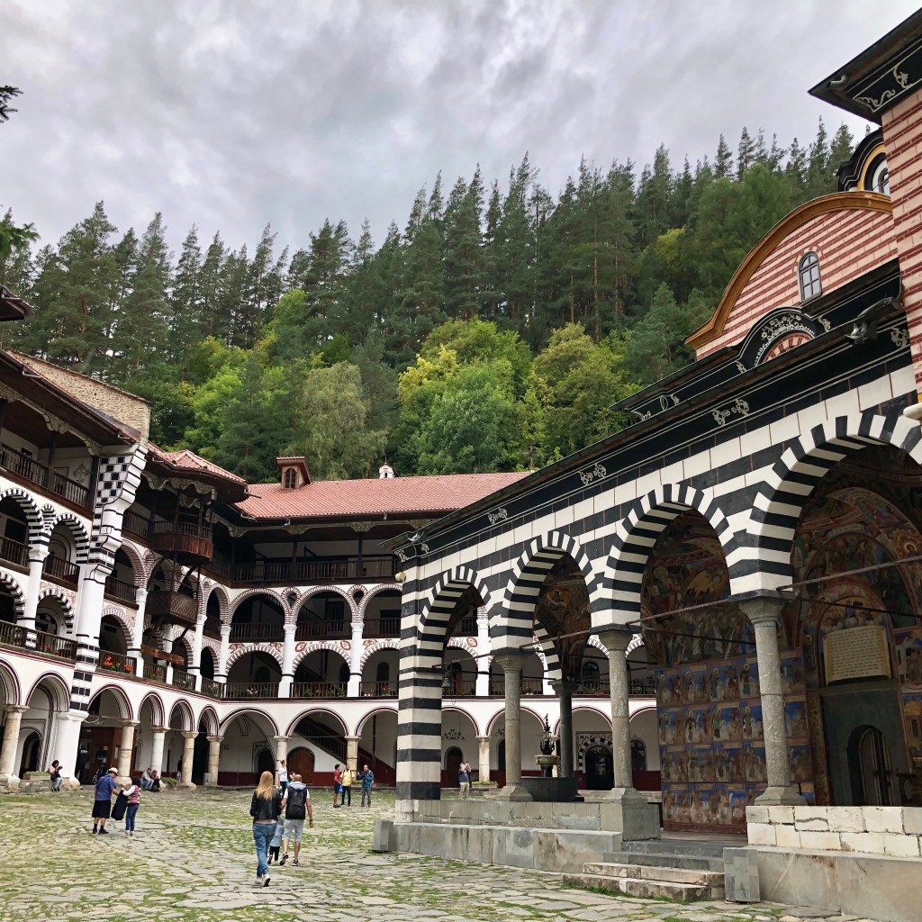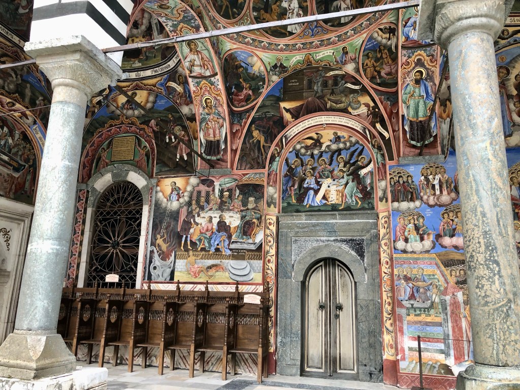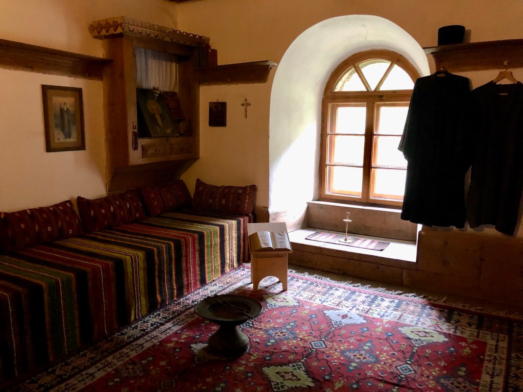 Beruhigt und mit dem richtigen Reifendruck ging es weiter rein in die Rhodopen zum Rila Kloster, eine der bedeutendsten Sehenswürdigkeiten Bulgariens. Der Ursprung geht auf das 10 Jahrhundert auf eine Einsiedelei des heiligen Iwan von Rilski zurück. Eine wechselhafte Geschichte, wie könnte es auch anders sein, war auch diesem UNESCO-Welterbe beschert, aber es hatte immer eine wichtige Rolle in der bulgarischen Geschichte. Gemeinsam mit einigen Klöstern auf dem Berg Athos galt es als das Zentrum der Bulgarischen Aufklärung im 19. Jahrhundert. Prächtige Wandmalereien schmücken den Bau vom Baumeister Pavel Ivanovitsch (1834-37). Die hier tätige Samokower Malschule war danach richtungsweisend für die Malereien in zahlreiche bulgarische Klöster. Durch eine Postkarte im Shop wurde ich auf einen schönen osmanisch wirkenden Prunkraum aufmerksam, den wir nach längerem Nachfragen bei einer Spezialführung im Ethnografischen Museum auch besichtigen konnten. Die Besichtigung dieses Museums und der Räume wird scheinbar nicht aktiv angeboten, aber es hat sich gelohnt. Wunderschöne Teppiche, Gürtelschnallen und folkloristische Kostüme gab es dort zu bestaunen. Kein Wunder, dass all diese Kostbarkeiten im dritten Stock unter höchsten Sicherheitsvorkehrungen aufbewahrt werden. Natürlich wurde gut aufgepasst, dass kein Foto in den Innenräumen gemacht wurde 😦