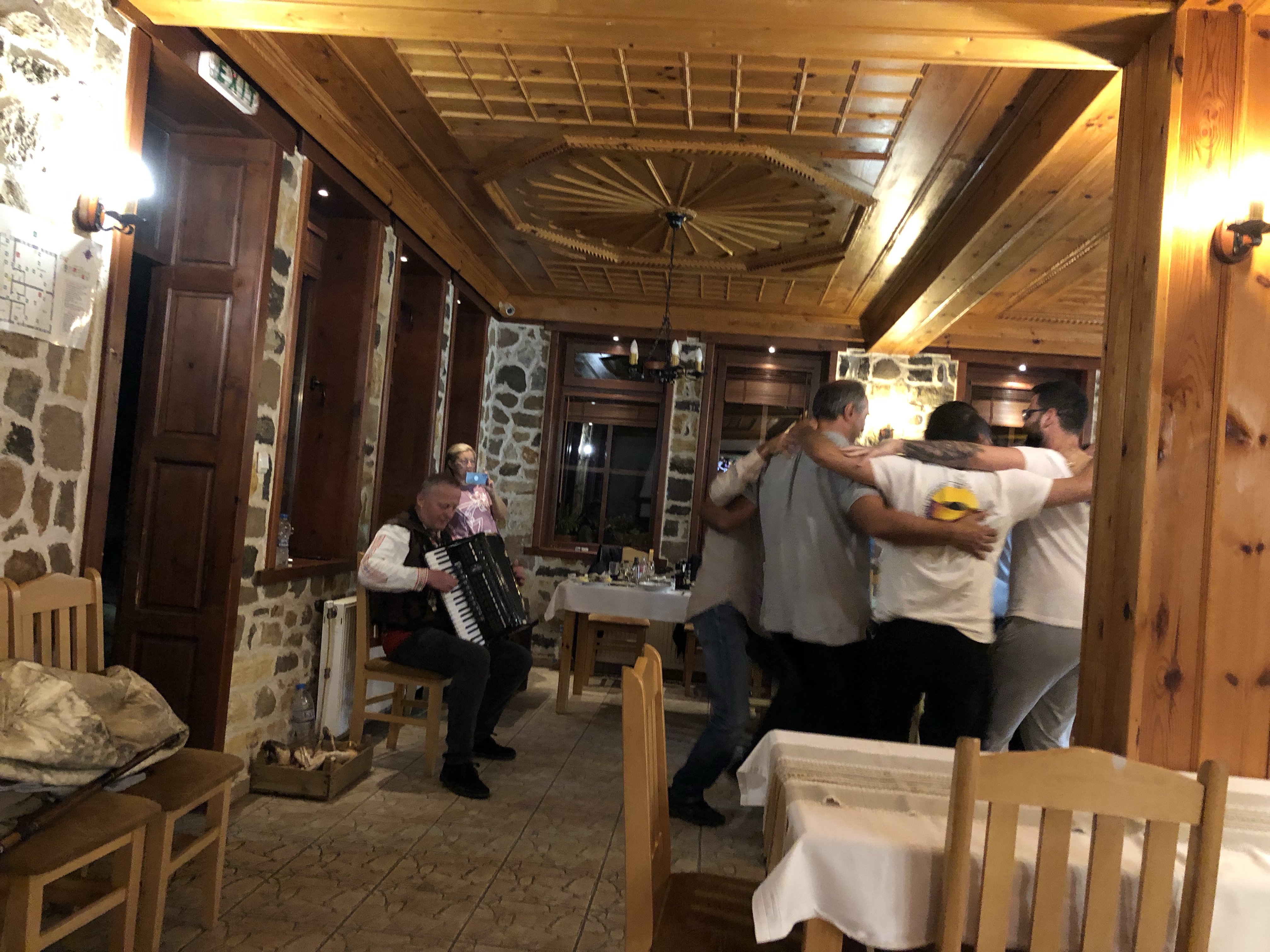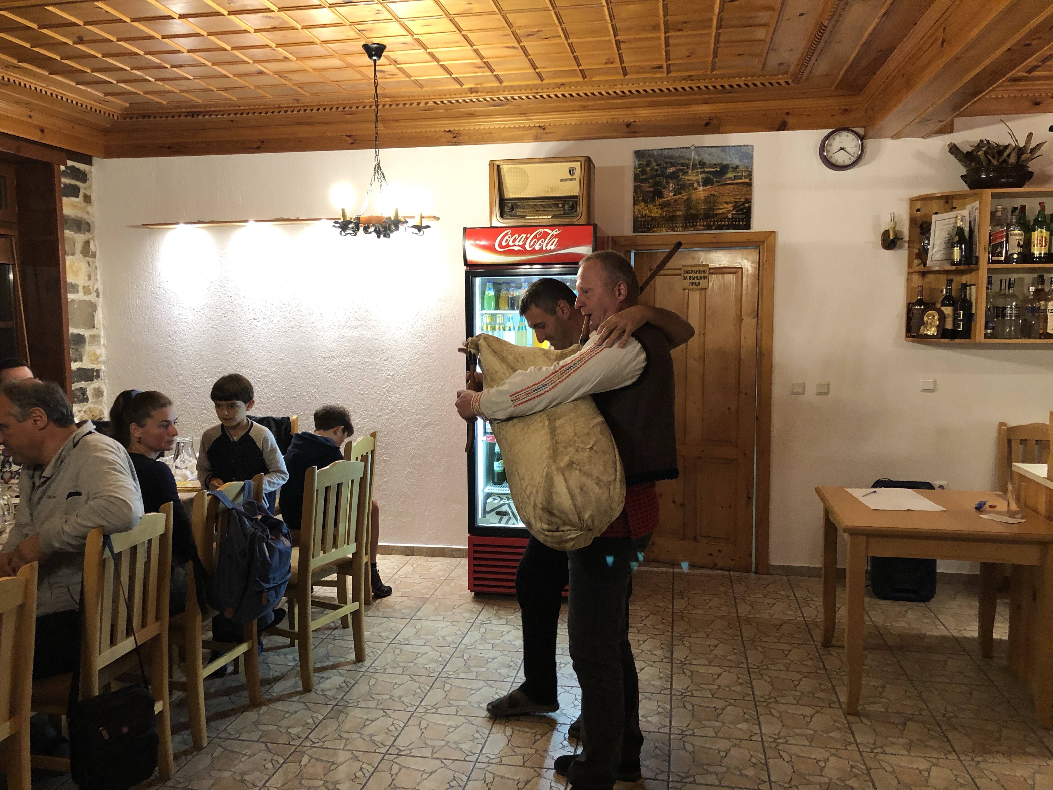 Osmanische Einflüsse bei den Häusern, beim Handwerk und beim Essen sind in den Rhodopen all gegenwärtig. Shiroka Laka ist das so ein richtiger touristischer vorzeige Ort. Auf der Strasse 8683 schlängelten wir uns ziemlich alleine noch weiter bis Arda, wo wir eine alte türkische Brücke vermuteten. Eine kleine Bogenbrück gab es im Ort, aber diese erreichte bei weitem nicht die 56m Spannweiter der Teufelsbrücke von Ardino, die wir bei der Recherche gesehen hatten. Macht nichts, nun wir waren tief in den Rhodopen gelandet, in einem kleinen Ort fast am Ende der Straße. Nach den letzten 28km Kurvenspass war es Zeit in der urigen Pension einzuchecken. Dort liess sich das herannahende Hagelgewitter und der heftige Regen bei guter Hausmannskost, Raki ruschia und traditioneller Hausmusik gut aussitzen. Mit so einem tollen Samstag-Abend-Programm hatten wir nicht gerechnet.