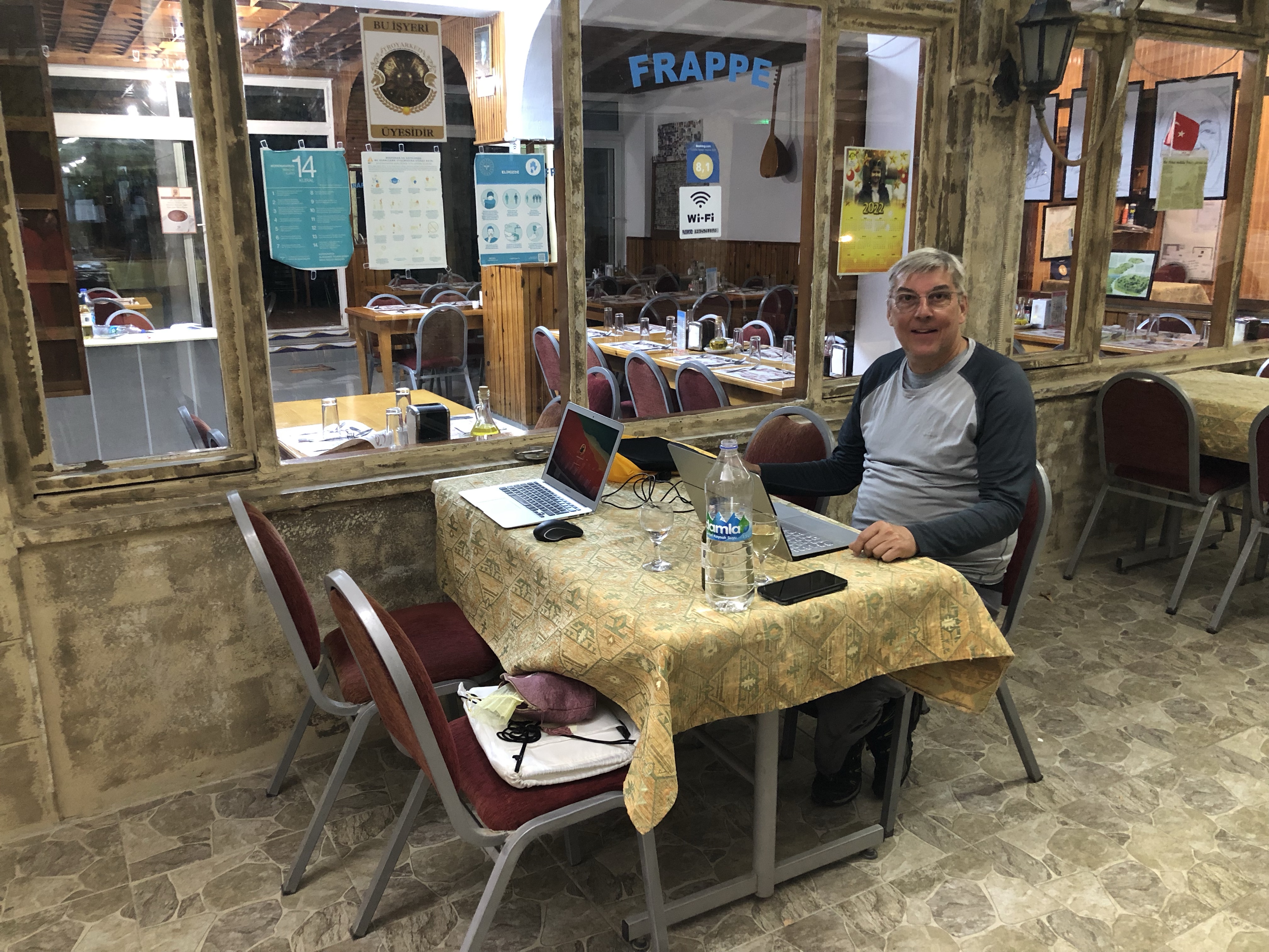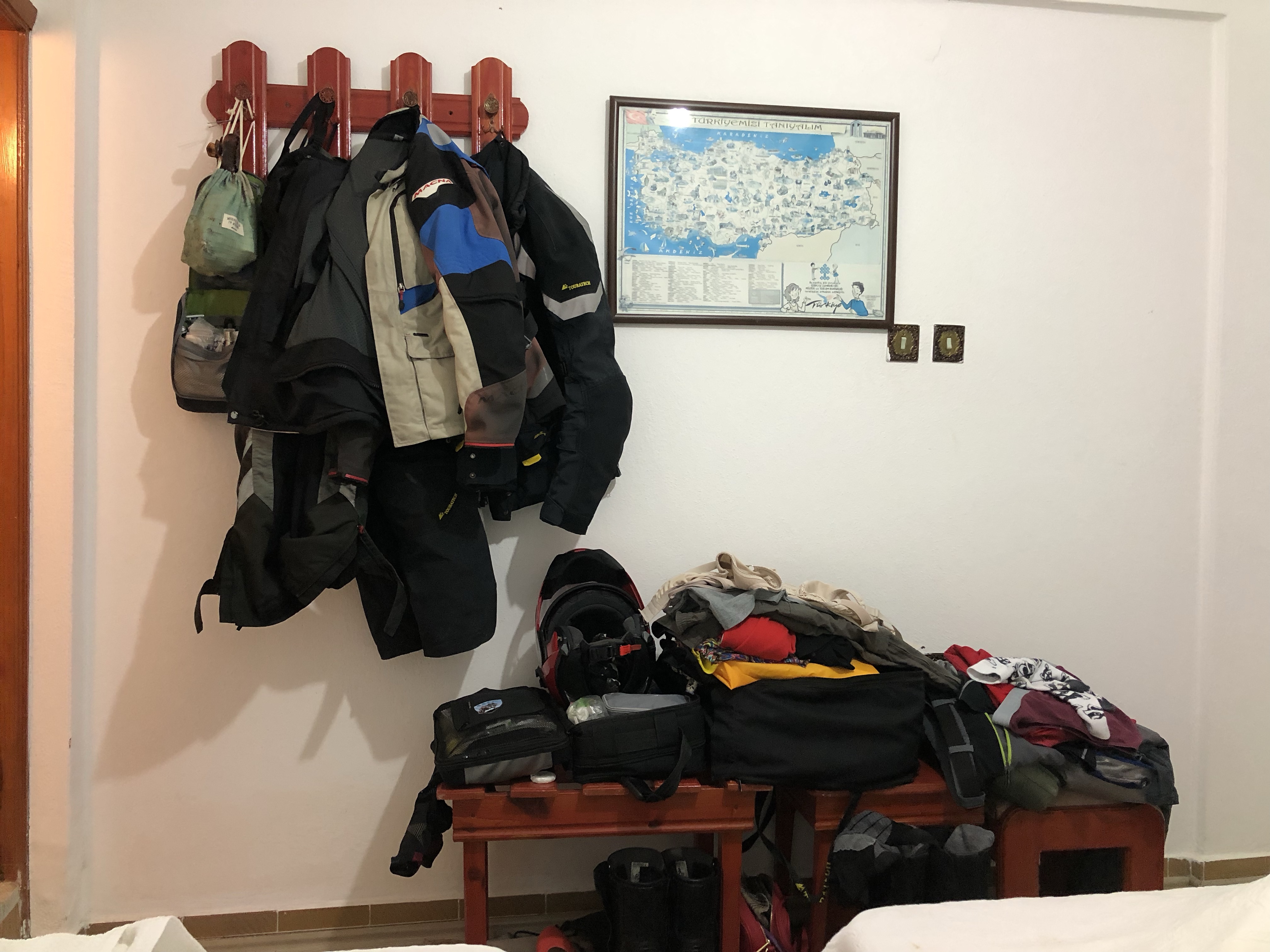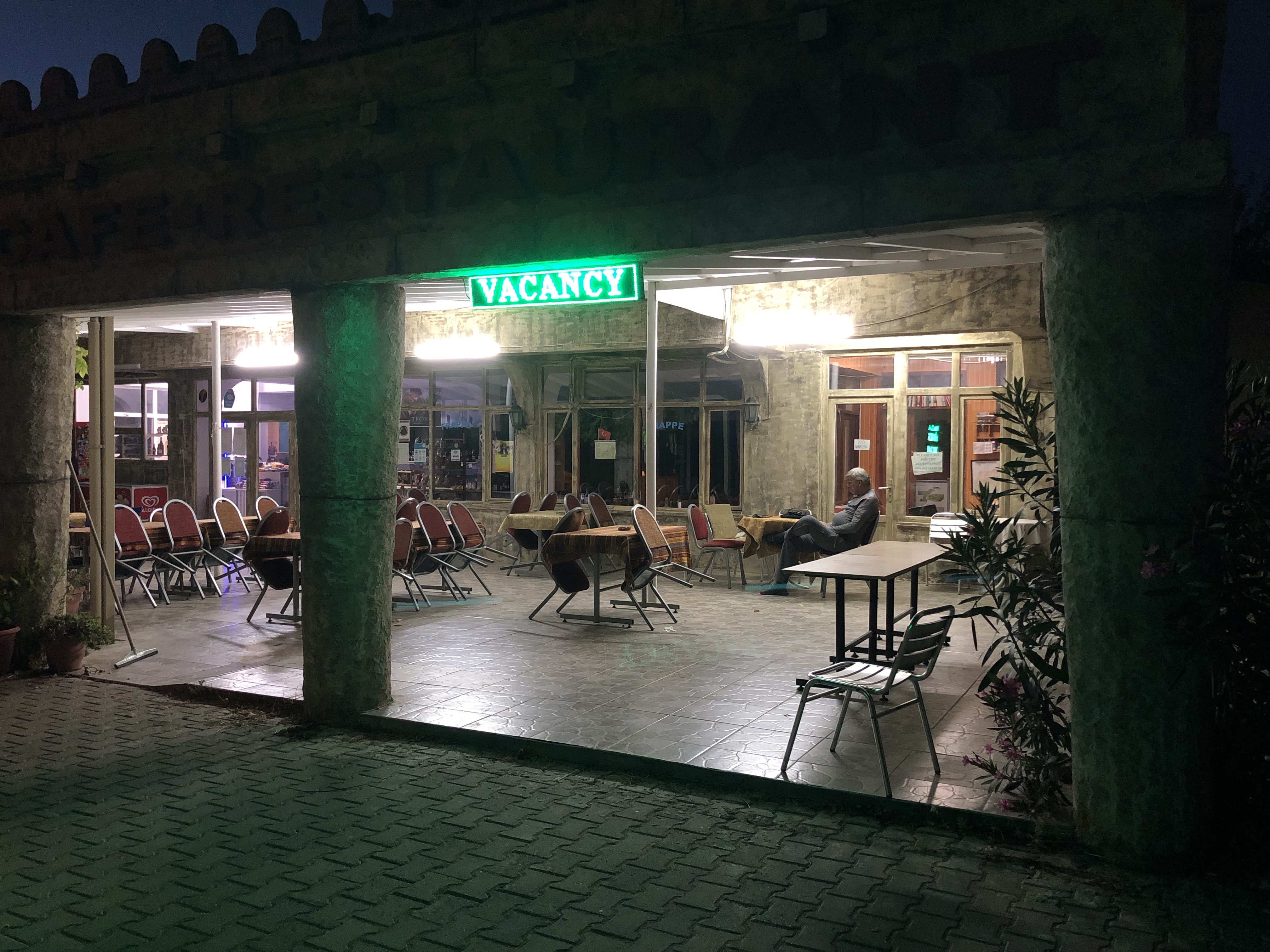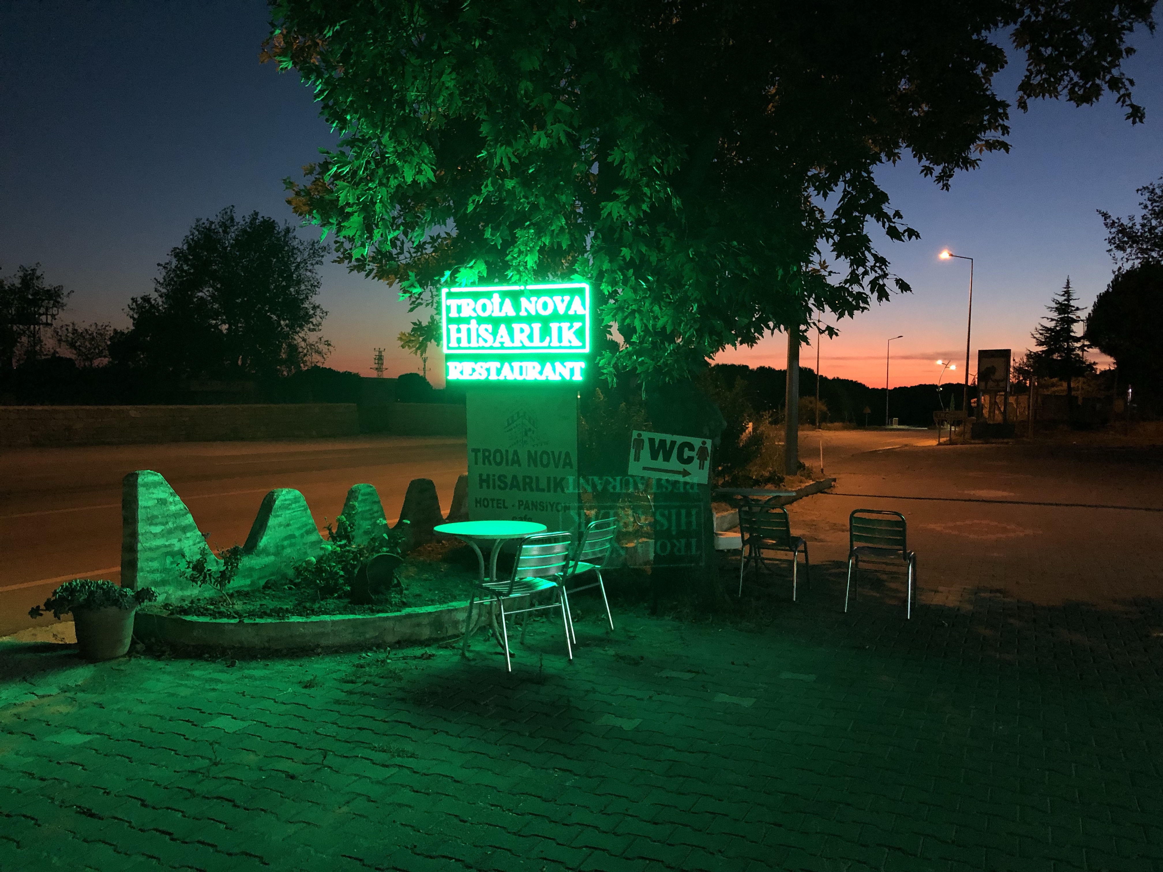 Nach diesen gigantomanischen ersten Eindrücken in der Türkei pirschten wir uns über eine kleine staubige Strasse Halileli an, dem Ort wo die Ausgrabungen von Troja liegen. Auf den ersten Blick ein unscheinbares Fleckchen Erde, zwei Kreuzungen, zwei Gaststätten mit vielen Tee trinkenden Männern, schlafende Strassenhunde, der Muezzin rief gerade zum Gebet, ein paar in die Jahre gekommene Traktoren an Straßenrand und eine wild blinkende Leuchtschrift am Baum vor dem einzigen Hotel, vis a vis ein großer „rostiger Würfel“ im Feld neben der Straße. Irgendwie hatte die Szenerie was von einer Filmkulisse aus einem Western. Mit perfektem britisch English wurden wir von Mustafa im Hirsarlik Hotel empfangen. Und als er merkte, dass wir Deutsch redeten, führte er die Konversation gleich in perfektem Deutsch weiter. Wir checkten in ein sauberes aber sehr spartanisches Zimmerchen ein, genau das Gegenteil vom King Maron in Griechenland. Zum Schlafen und Einstellen unserer Sachen reichte es gerade. Vor dem Hotelrestaurant gab es im Aussenbereich genügend Platz zum Sitzen und das bot auch gleich die Gelegenheit in das türkische Dorfleben einzutauchen.