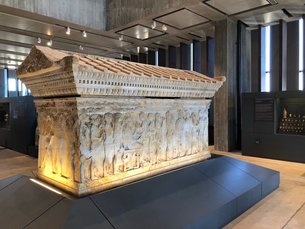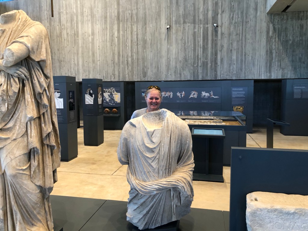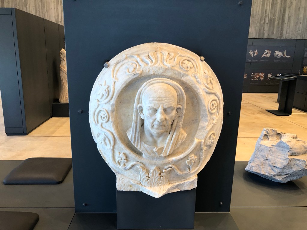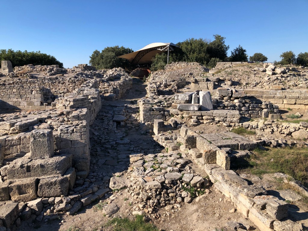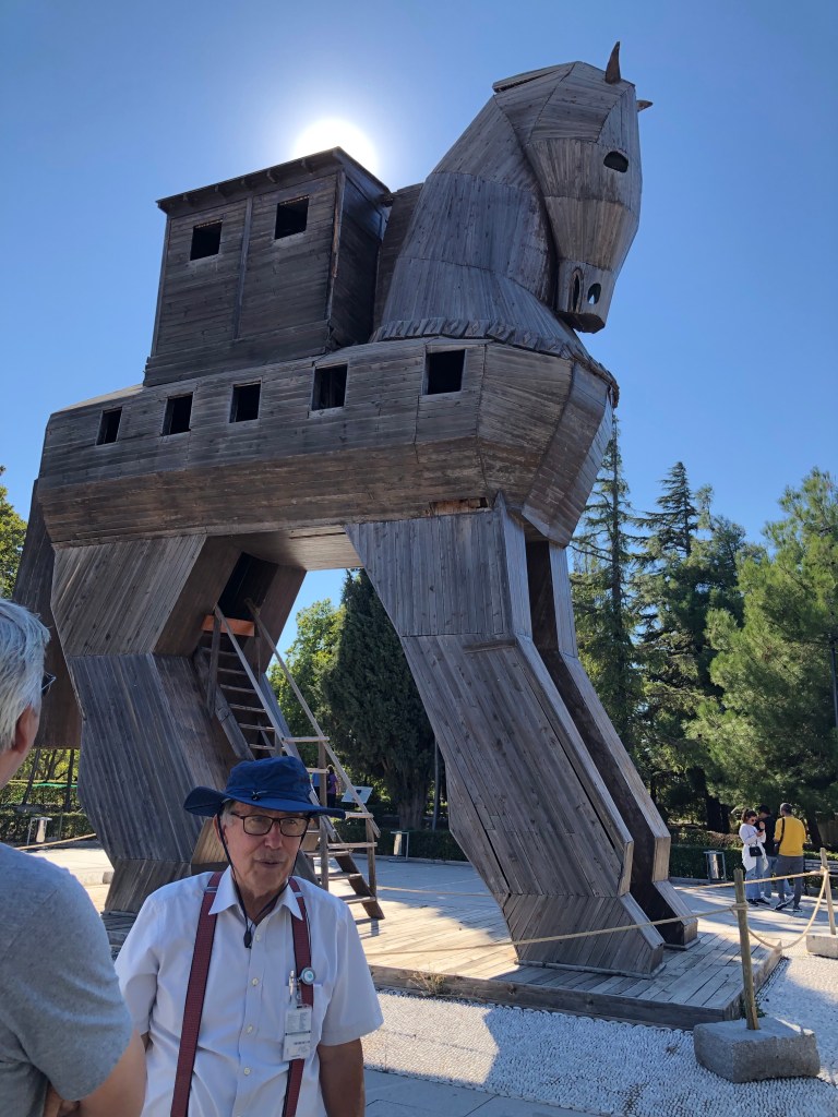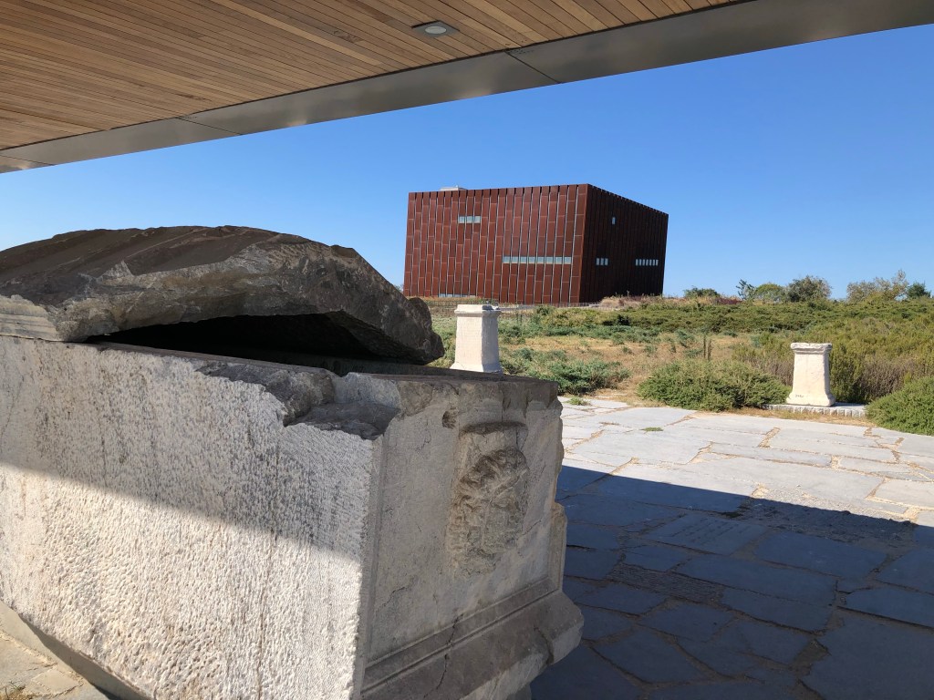Wie sich herausstellte, war Mustafa ein geprüfter Reiseleiter. Sehr praktisch, so buchten wir ihn für eine Führung am Nachmittag des nächsten Tages im Archäologischen Park in Troja. Das Troja Museum – den rostigen Würfel – besuchten wir am Vormittag. Der Bau ist architektonisch sehr gelungen, passt sich gut der Landschaft an und birgt eine großartige Ausstellung über die Geschichte von Troja, den Trojanischen Krieg, das Ausgrabungsareal, die Fundstücke. Die Idee, den Ort des Geschehens mit den Artefakten zu verbinden ist hier sehr gut gelungen. Das Gebäude bildet die perfekte Hülle dafür. Mit seinen 50 m Höhe symbolisierte es die Grabungshöhe in Troja. Zwei Ebenen des Museum befinden sich daher unter der Erde. Der Archäologe Schliemann mag für die Erforschung Trojas wichtig gewesen sein, dennoch ist seine Dreistigkeit, mit der er Artefakte einfach ausser Landes gebracht hat, zu verurteilen. Es ist schade, dass dadurch sehr viele Objekte in Museen auf der ganzen Welt verstreut sind.