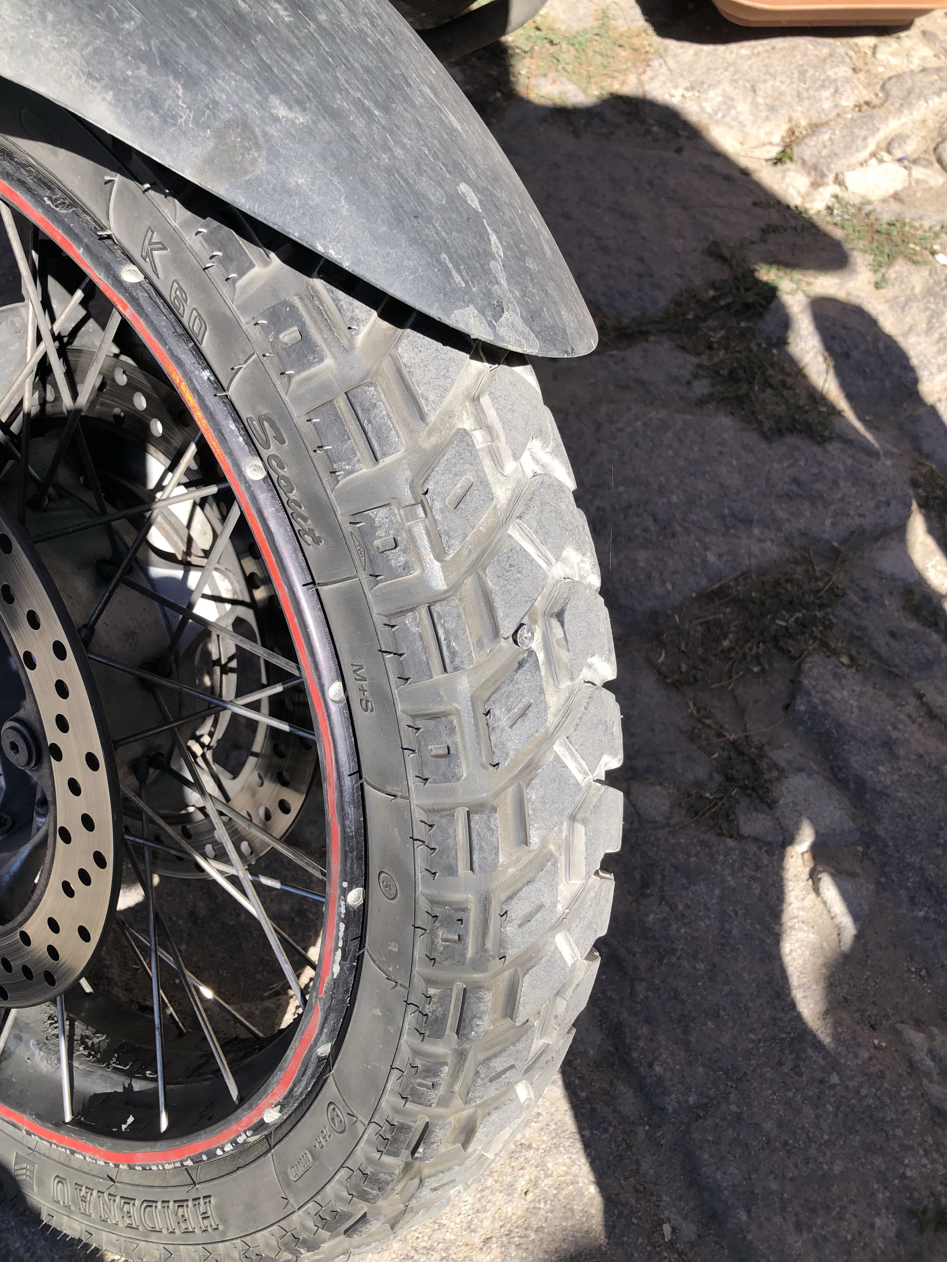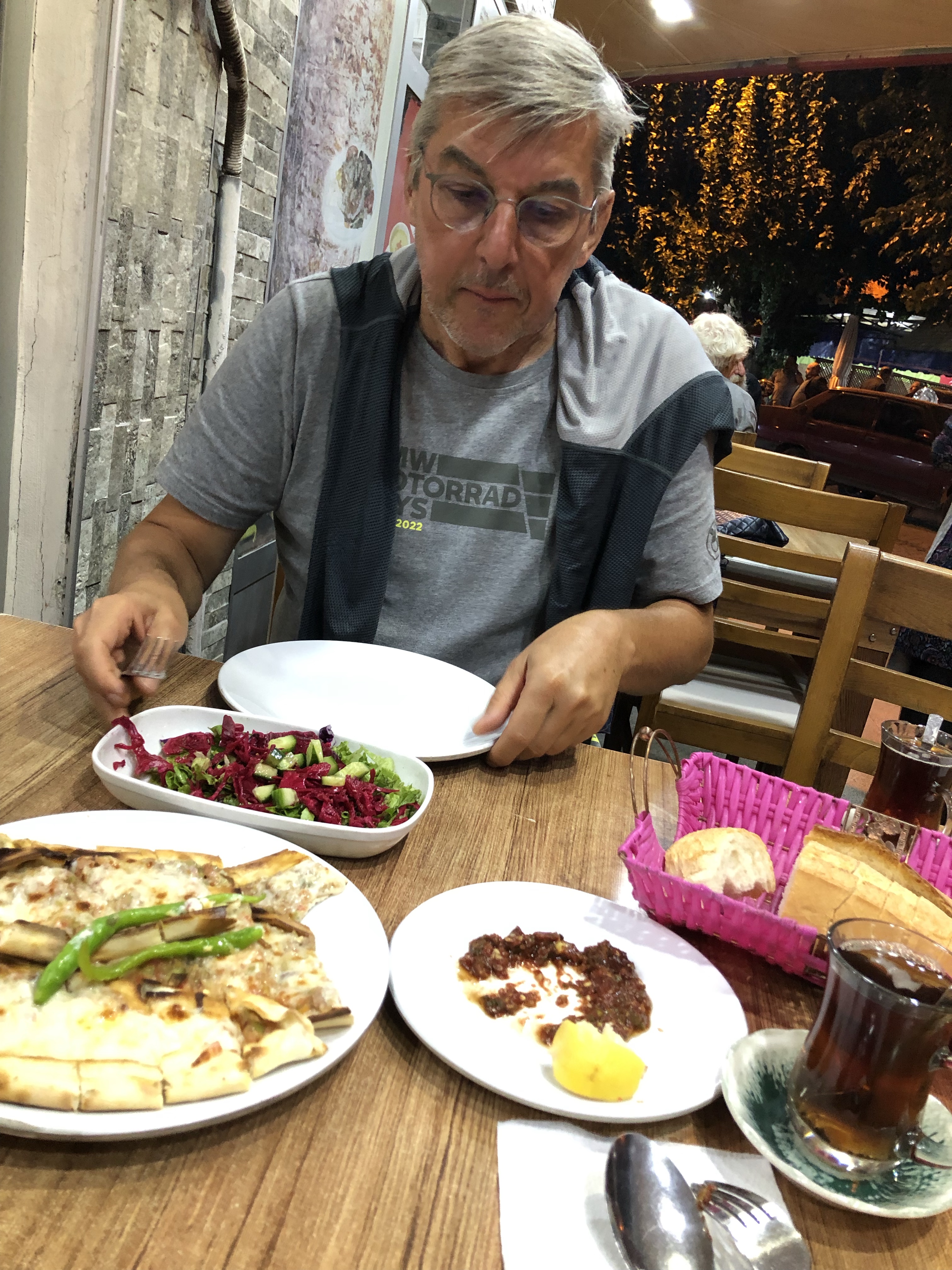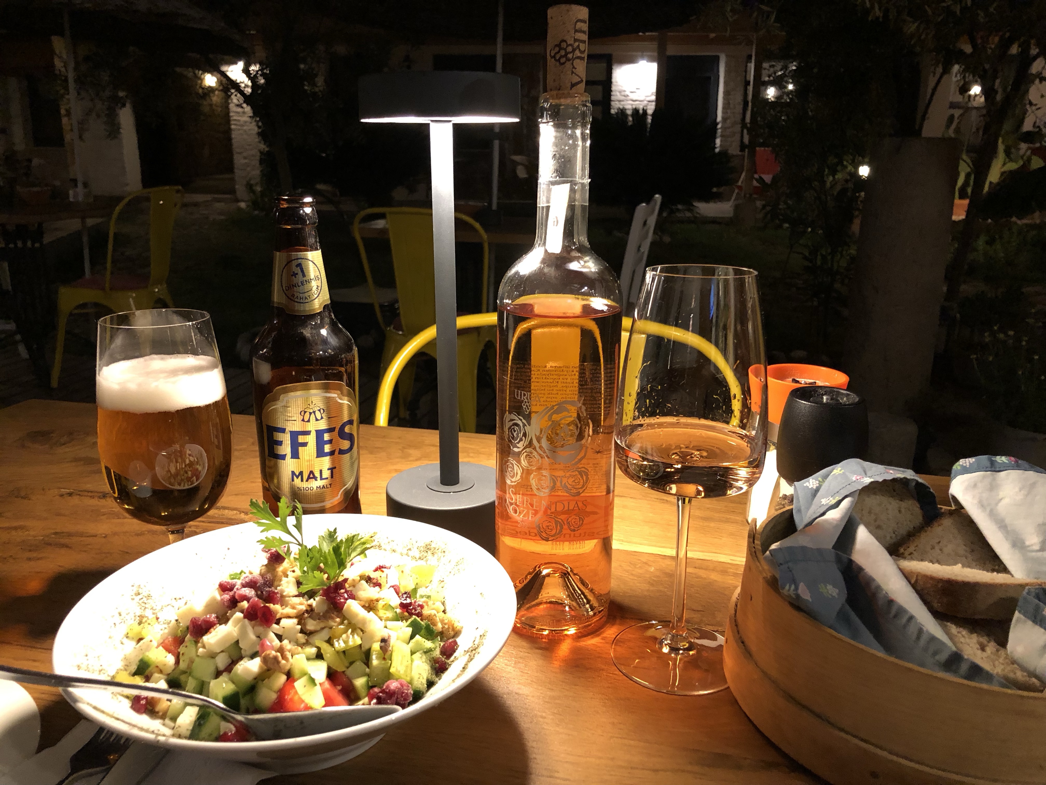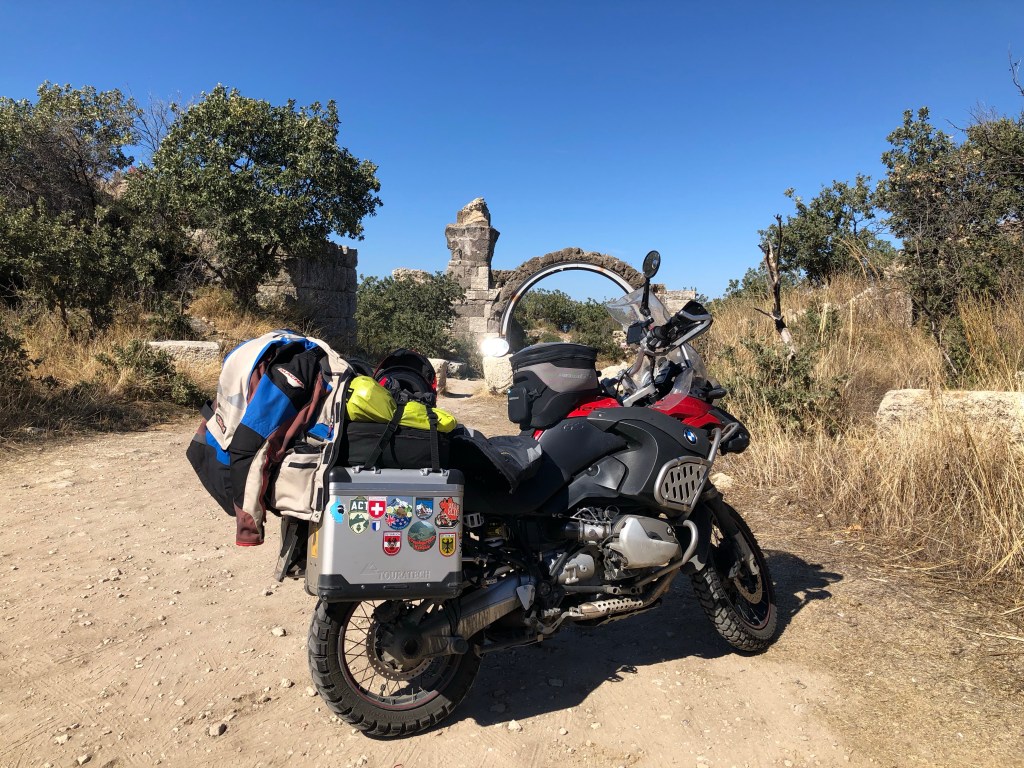 Und dann das! Würde unser Aufenthalt in Assos zwangsweise etwas verlängert? Schon wieder wenig Luft im Vorderreifen. Wir hatten uns im neuen Vorderreifen tatsächlich eine Schraube eingefahren. Jetzt war alles klar, daher mussten wir bereits beim Herodes Bad wieder Luft aufpumpen. Zuerst kurz überlegen „abwarten und Tee trinken“ und schon war der Reifenschuster zur Stelle, fixte das Loch und wir konnten langsam, zwar mit Verspätung, nach Bergama/Pergamon weiter fahren. Langsam deswegen, weil eine ganz schöne Strecke neu dick mit Rollsplitt bestreut war. Wir eierten mit dem Motorrad nur so dahin. Scheinbar ist das die türkische Version von Straßensanierung, Teer, reichlich grober Rollsplitt, mit der Walze ein bisschen drüber und dann warten bis die überschüssigen Steinchen irgendwann quasi durch den Verkehr weg geputzt sind. Unser maroder Scheinwerfer flackerte auch gelegentlich. Gut, dass es ein zweites Licht auf der Maschine gibt. Im Gästehaus in Bergama hatten wir schon Nachricht gegeben, dass wir uns verspäten würden. Der Gastgeber öffnete uns die Tore und wir rollten in einen wunderschönen Garten. Eine richtige kleine Erholungsoase erwartete uns dort. Das Stiefelbier war natürlich an dem Tag besonders willkommen und schmeckte in der idyllischen Umgebung besonders gut.