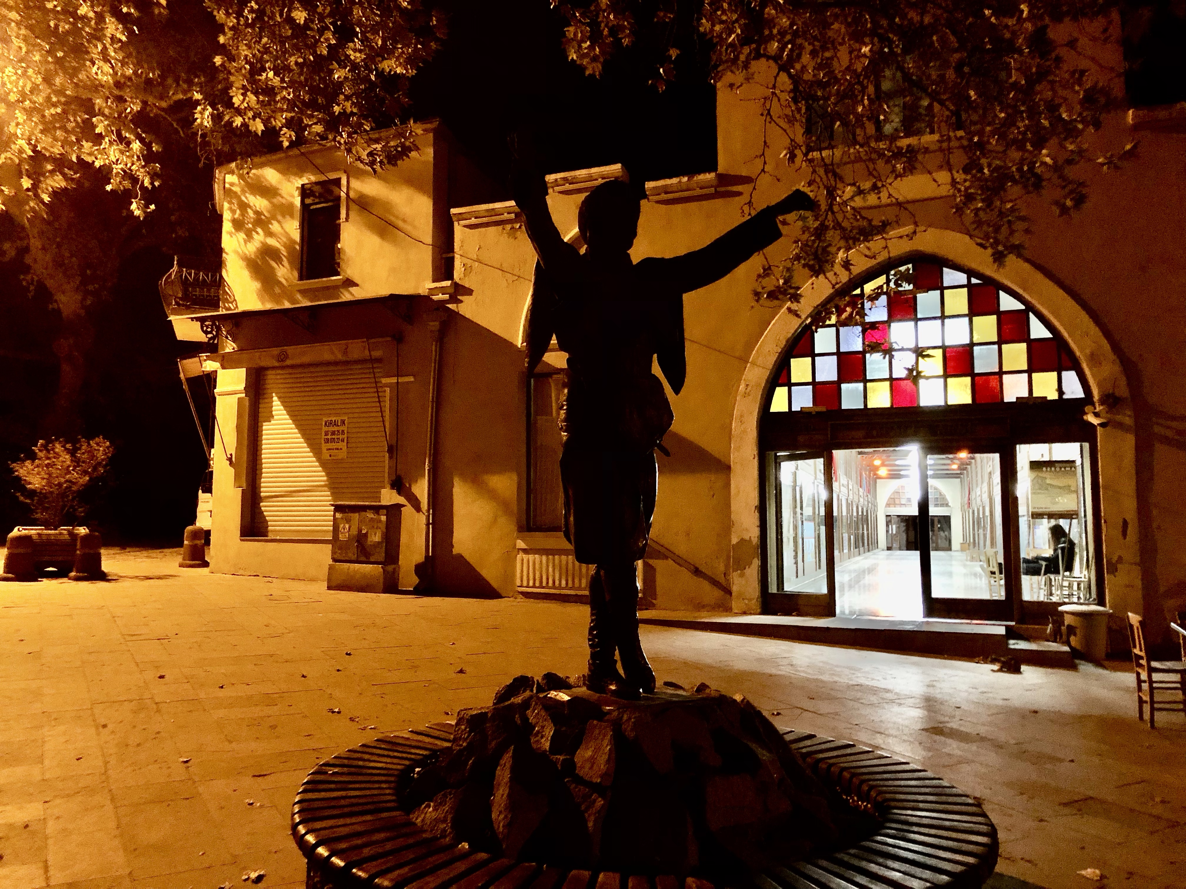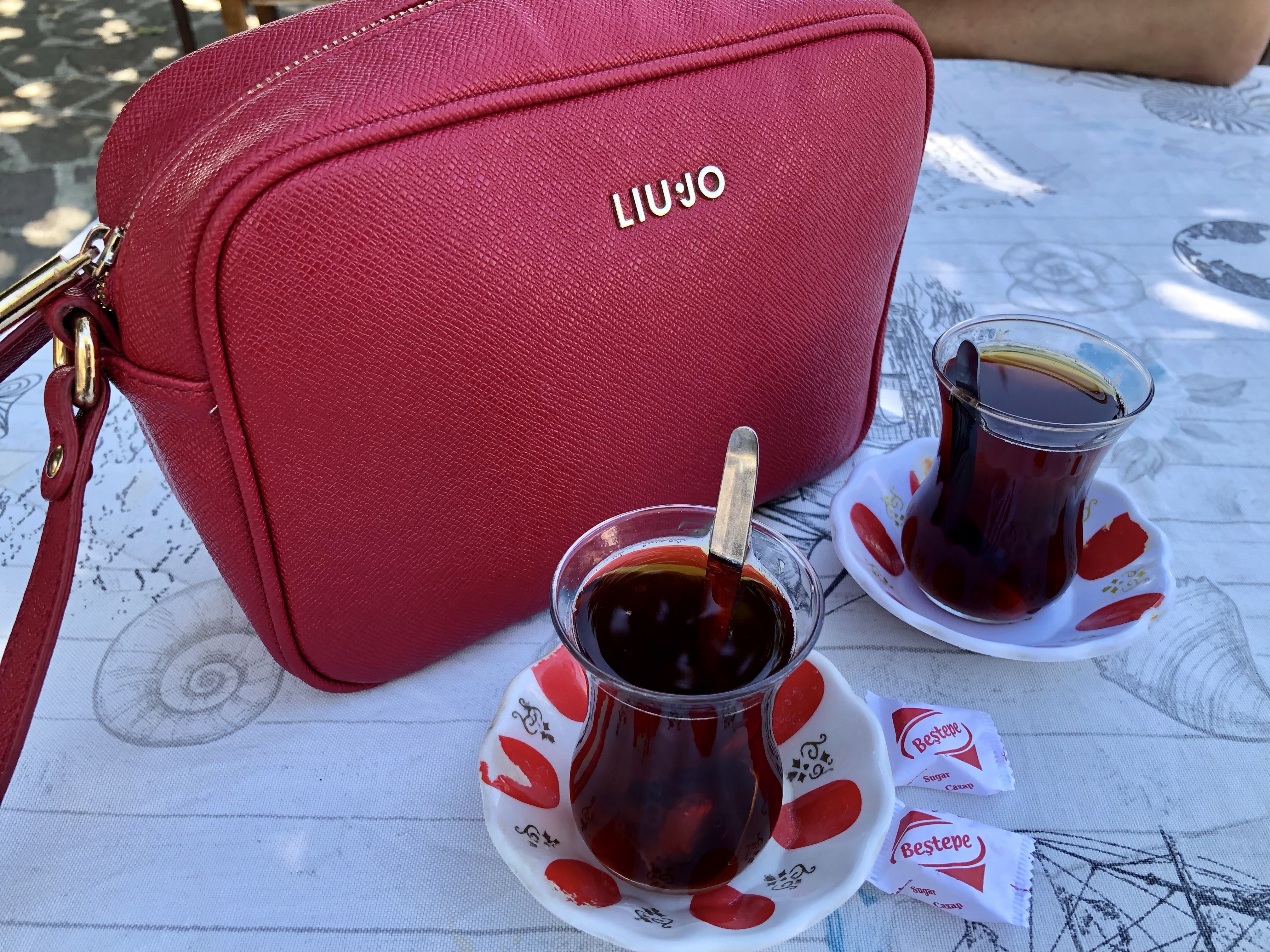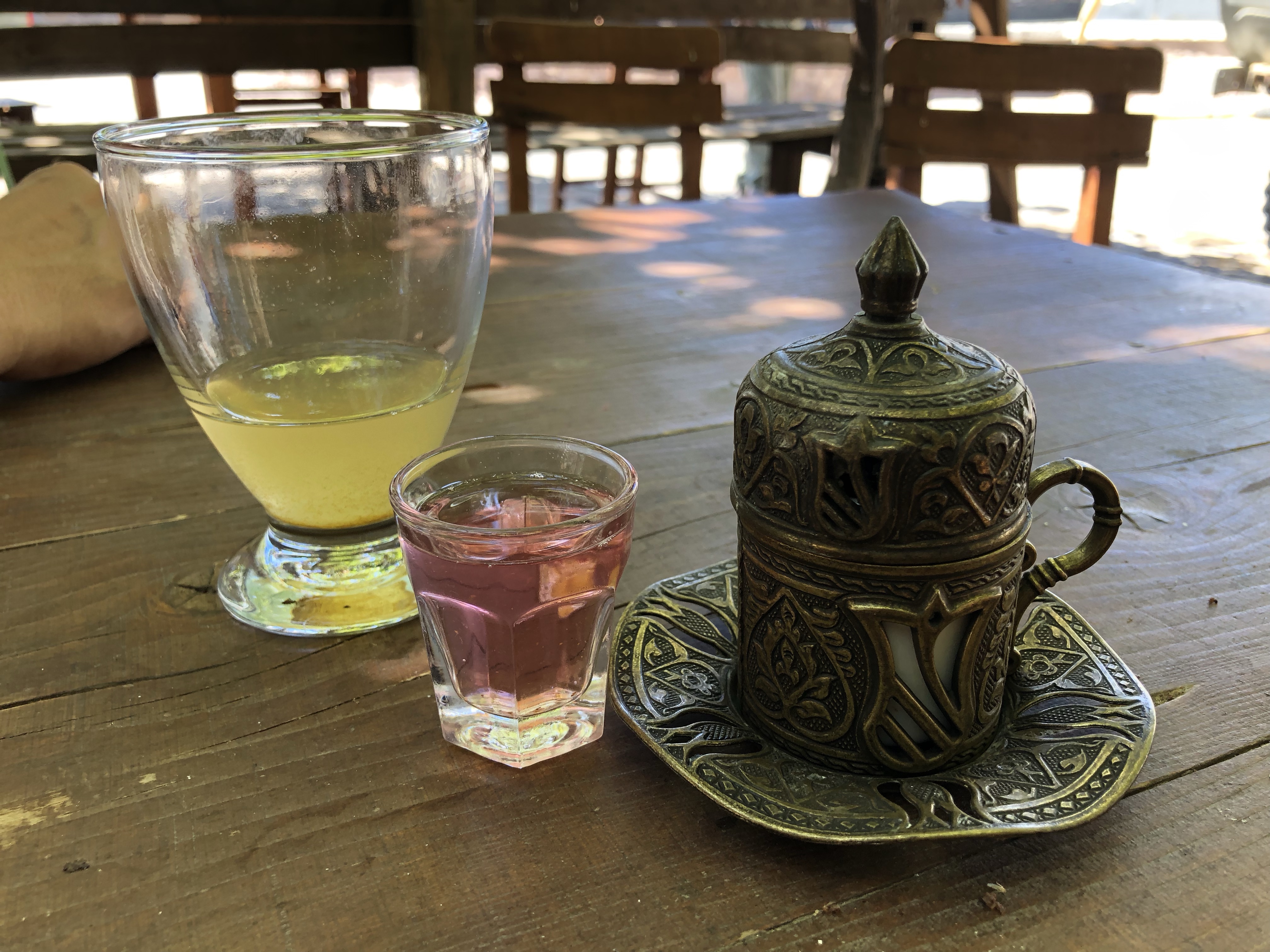 Und dann das! Würde unser Aufenthalt in Assos zwangsweise etwas verlängert? Schon wieder wenig Luft im Vorderreifen. Wir hatten uns im neuen Vorderreifen tatsächlich eine Schraube eingefahren. Jetzt war alles klar, daher mussten wir bereits beim Herodes Bad wieder Luft aufpumpen. Zuerst kurz überlegen „abwarten und Tee trinken“ und schon war der Reifenschuster zur Stelle, fixte das Loch und wir konnten langsam, zwar mit Verspätung, nach Bergama/Pergamon weiter fahren. Langsam deswegen, weil eine ganz schöne Strecke neu dick mit Rollsplitt bestreut war. Wir eierten mit dem Motorrad nur so dahin. Scheinbar ist das die türkische Version von Straßensanierung, Teer, reichlich grober Rollsplitt, mit der Walze ein bisschen drüber und dann warten bis die überschüssigen Steinchen irgendwann quasi durch den Verkehr weg geputzt sind. Unser maroder Scheinwerfer flackerte auch gelegentlich. Gut, dass es ein zweites Licht auf der Maschine gibt. Im Gästehaus in Bergama hatten wir schon Nachricht gegeben, dass wir uns verspäten würden. Der Gastgeber öffnete uns die Tore und wir rollten in einen wunderschönen Garten. Eine richtige kleine Erholungsoase erwartete uns dort. Das Stiefelbier war natürlich an dem Tag besonders willkommen und schmeckte in der idyllischen Umgebung besonders gut.