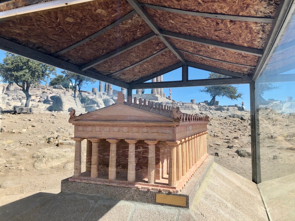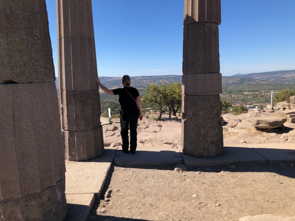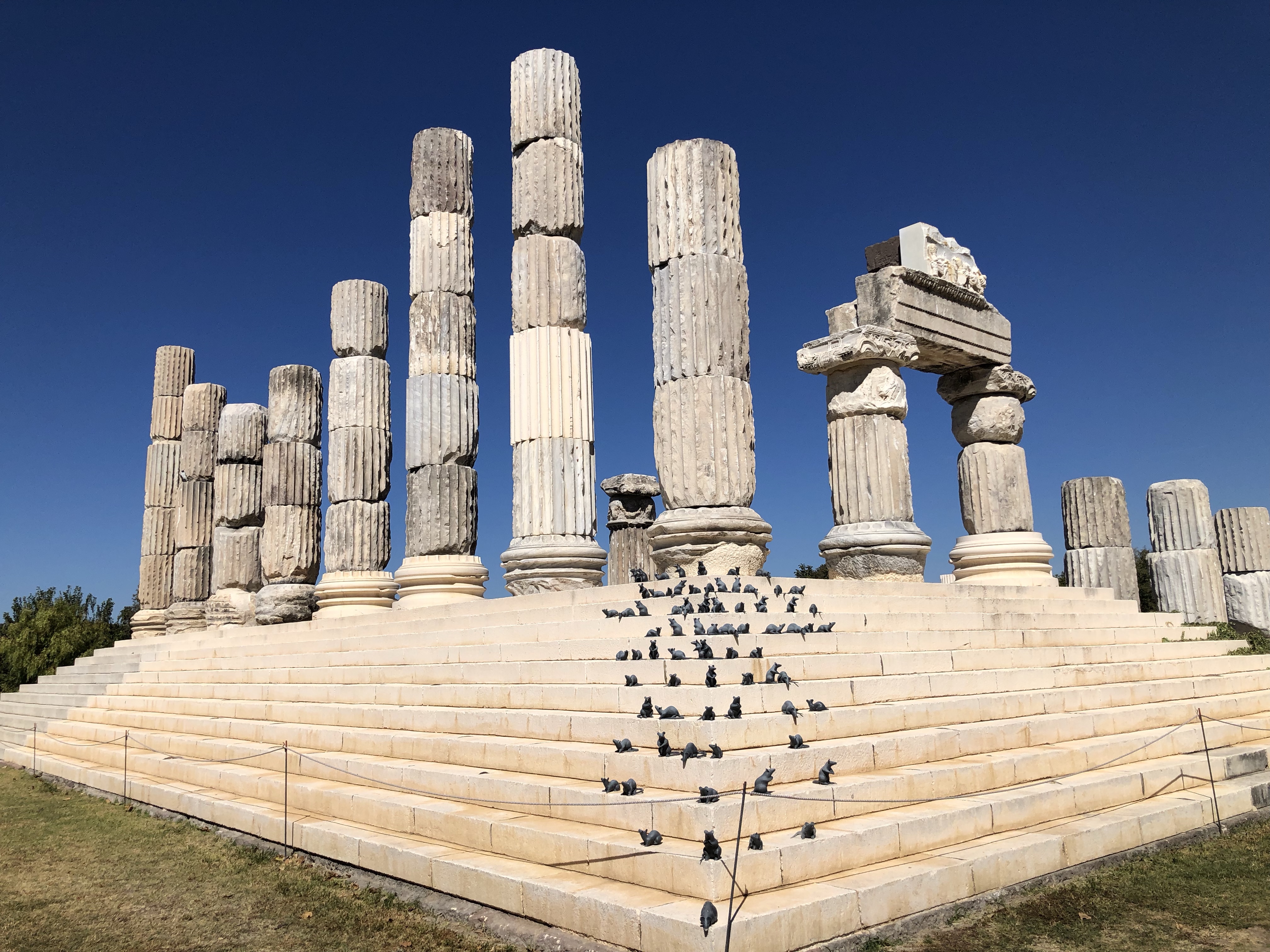 Ein paar Kilometer weiter bei Gülpinar folgten wir der Wegmarkierung zum Apollo-Tempel Smintheon, eine prächtige Überraschung. Die Namensgebung stammt vermutlich von dem Wort „sminthos“ was „Maus oder Ratte“ heißt. Apollo galt als der Gott der Heilkunst und Prophezeiung. In diesem Zusammenhang könnte man mutmaßen, dass er als „Mausvertilger“ (wörtliche Übersetzung) bzw. als Pestgott verehrt worden ist. Auch mit Homers Ilias wird die Namensgebung in Verbindung gebracht.