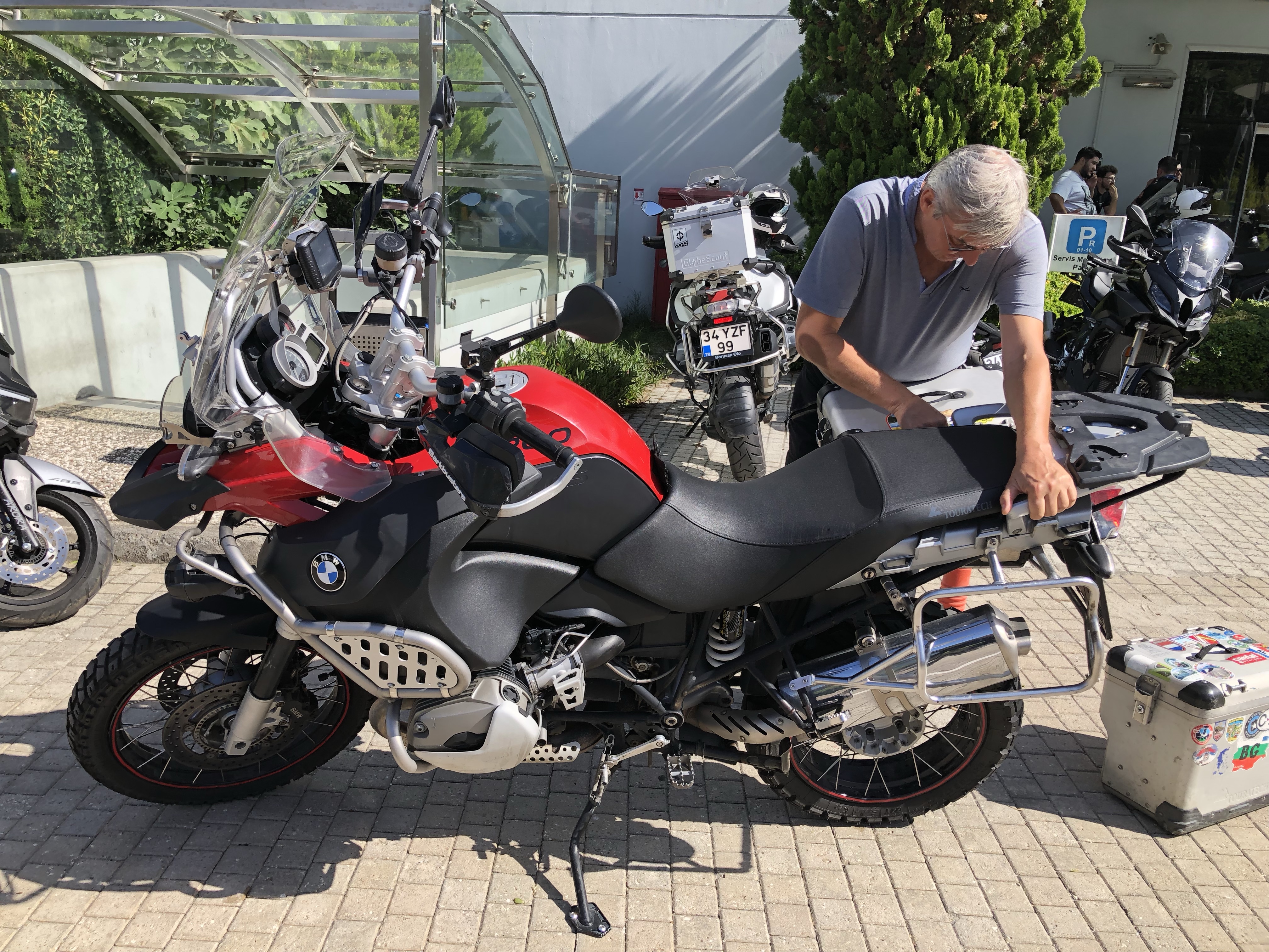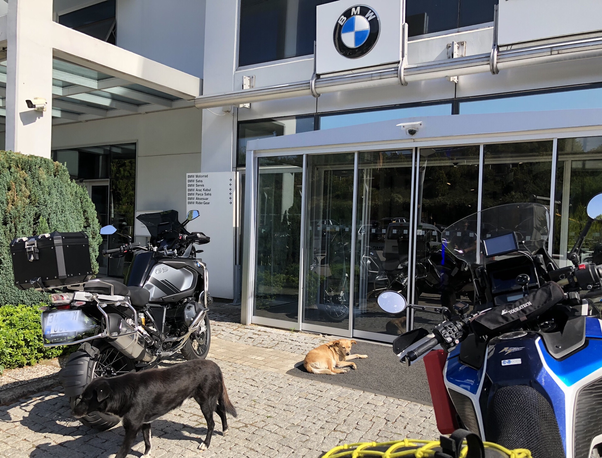 Aus unserem Vorsatz, in der Stadt nicht fahren zu wollen, wurde nichts, denn der Bock bekam etwas vorgezogen schon in Istanbul sein 10.000er Service. Einige Lämpchen leuchteten gelegentlich auf, daher wollten wir nicht wir geplant bis Tiflis warten. Ein Hotelangestellter in Bergama war uns bei der Terminreservierung bei BMW Borosan in Istanbul behilflich. Also bewegten wir den Bock quer durch die Stadt auf die Europäische Seite. Pünktlich um 9:00 rollten wir in der BMW Mega-City ein, nachdem wir mehrere Autobahnen und die Faith Sultan Mehmet Brücke erfolgreich überquert hatten. Wenn wir nicht auch den Pannenstreifen, wie alle einheimischen ZweiradfahrerInnen genommen hätten, wäre sich das nie im Leben im Morgenverkehr ausgegangen. Wir sind ja lernfähig und hatten die lokalen Fahrgewohnheiten schnell durchschaut. Der Bock blieb zwei Tage in der BMW-Obhut und bekam alles was er dringend für eine sichere Weiterreise benötigte zu einem (für uns) extrem günstigen Preis. Beim Abholen plauderten wir noch mit einem türkischstämmigen Arzt der in Hamburg und Istanbul praktiziert, über unsere Reisepläne. Er kann sich natürlich mehrere Motorräder in Deutschland und hier in Istanbul leisten. Voller Bewunderung über unsere Ziele hatte er anscheinend vergessen, das wir keine Patienten sind und er verabschiedete sich mit: Baldige Besserung. Ein Arzt bleibt eben immer ein Arzt. Wir mussten so lachen. Unser Fazit zum Straßenverkehr in Istanbul: alles sehr diszipliniert, geordnet und gut beschildert.
