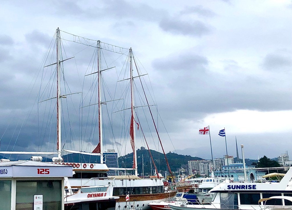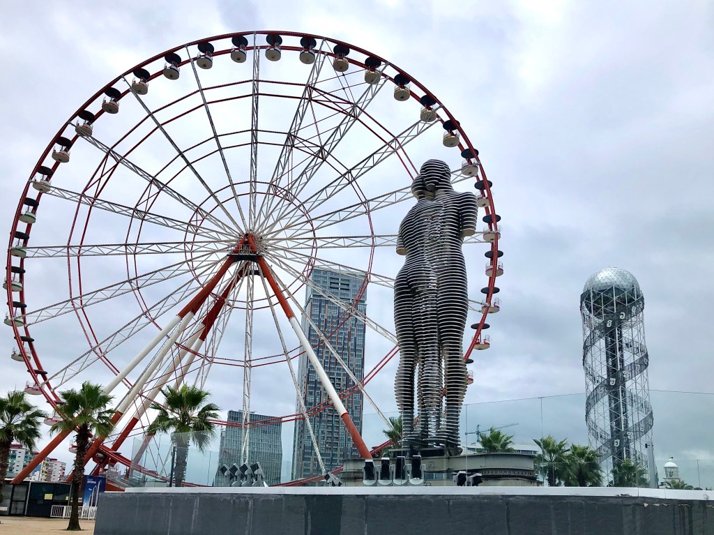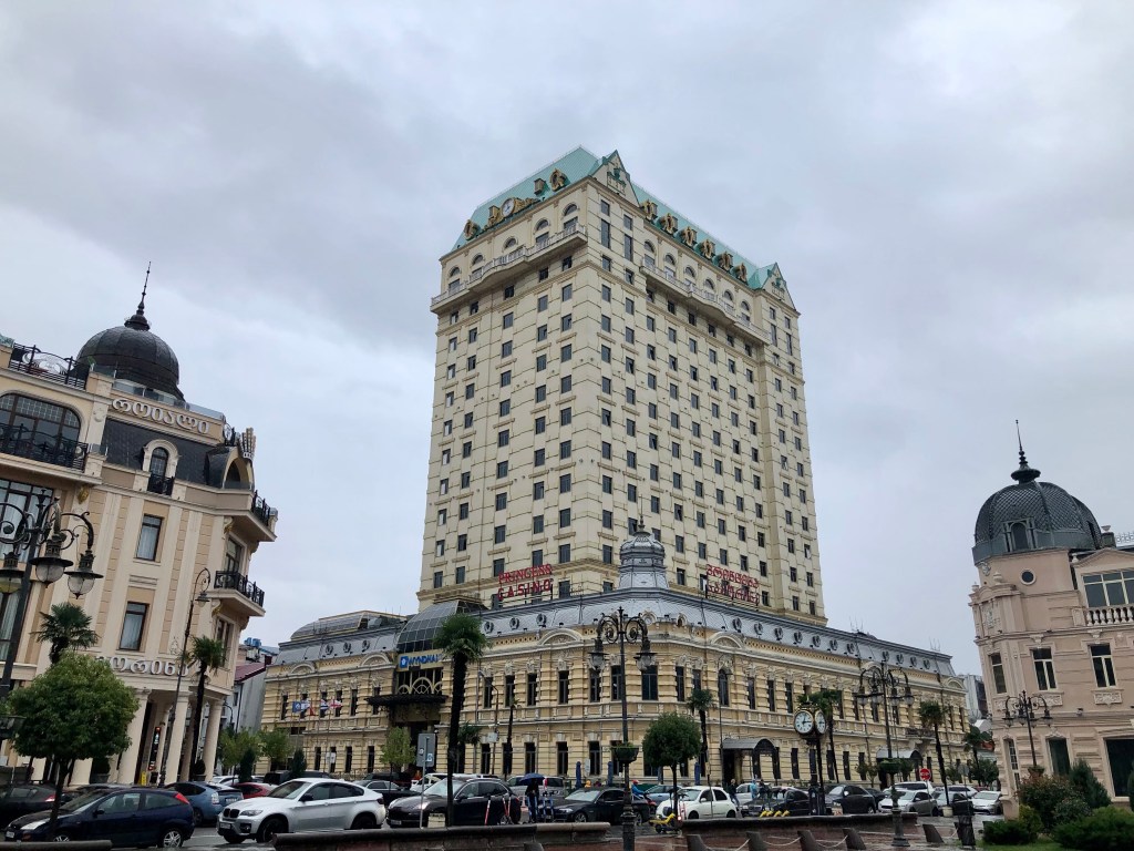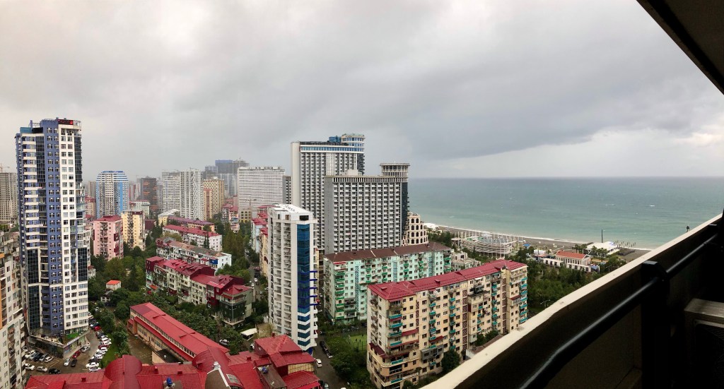 Unser erstes Ziel war – ein paar Kilometer hinter der Grenze – Batumi, eine der großen Städte Georgiens – 172.000 Einwohner/Stand 2021. Das wären grob 2.652 pro Quadratkilometer. Bei so einer Dichte an Personen muss logischerweise in die Höhe gebaut werden. An der Schwarzmeer Küste ragen eine Menge Wolkenkratzer und Hochhäuser in den Himmel. Irgendwo dort musste auch unser Quartier sein. Leider hatte Meister Garmin Probleme mit der georgischen „Schlingerl-Schrift“. Ich muss auch gleich gestehen, auch wir können hier nix lesen. Als wir so suchend herumfuhren, gabelte uns ein ortskundiger Motorradfahrer auf und brachte uns sicher die paar Straßen weiter zu unserem Wohntower. Der Bock gesellte sich zu zwei russischen Motorrädern am Straßenrand. Wir hatten uns eine kleine Wohnung in der Orbi City gemietet, ein Apartment-Hotel mit 3.000 Wohneinheiten. Es war ein ständiges kommen und gehen. 12 Lifte fuhren nur in dem einen Komplex ständig zwischen dem Erdgeschoss und dem 47. Stock auf und ab. Gefährlich hingen bereits dunkelschwarze Wolken am Himmel und der Wind pfiff vom Meer landeinwärts. Schnell holten wir uns beim Spar vis a vis den nötigen Proviant für das Abendessen und das Frühstück, bevor es so richtig zum Herunterprasseln anfing. Die Stadtbesichtigung und die weiteren Besorgungen war somit auf den nächsten Tag verschoben.