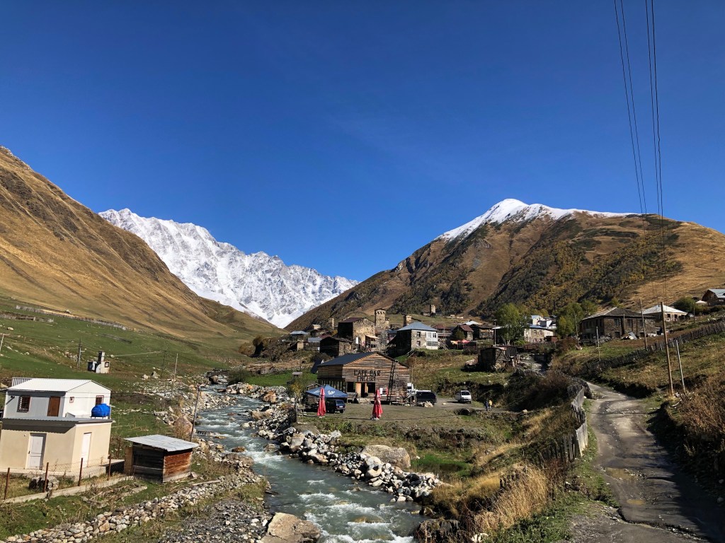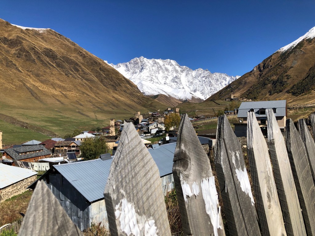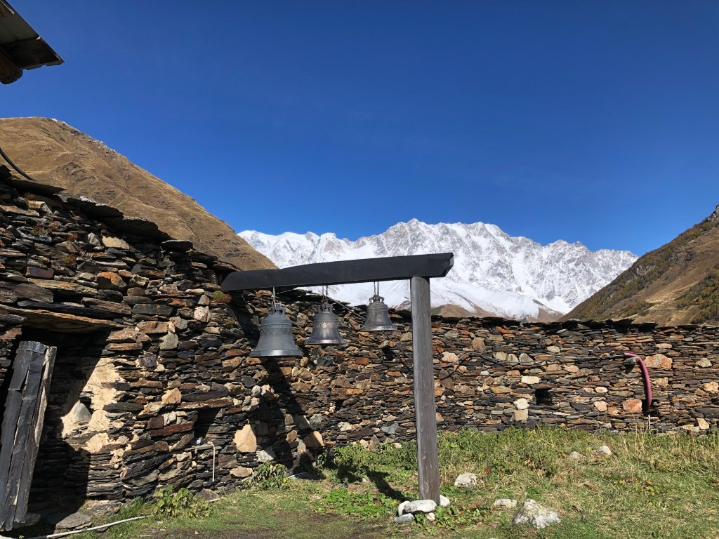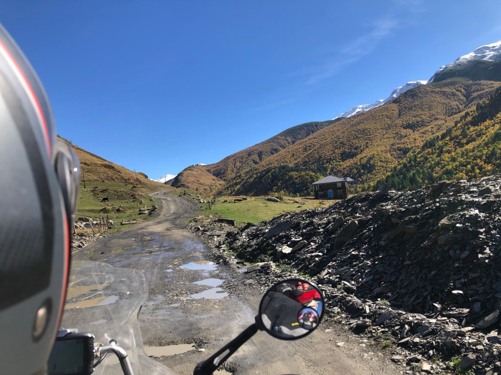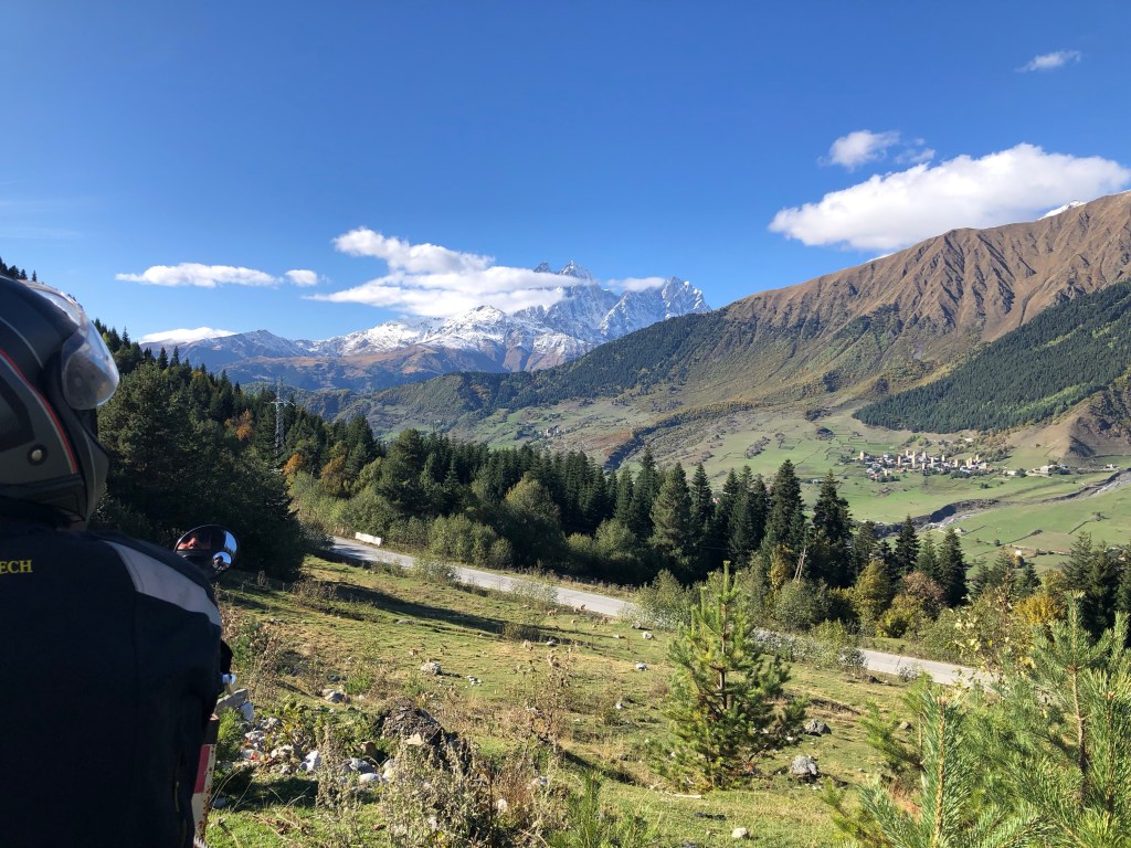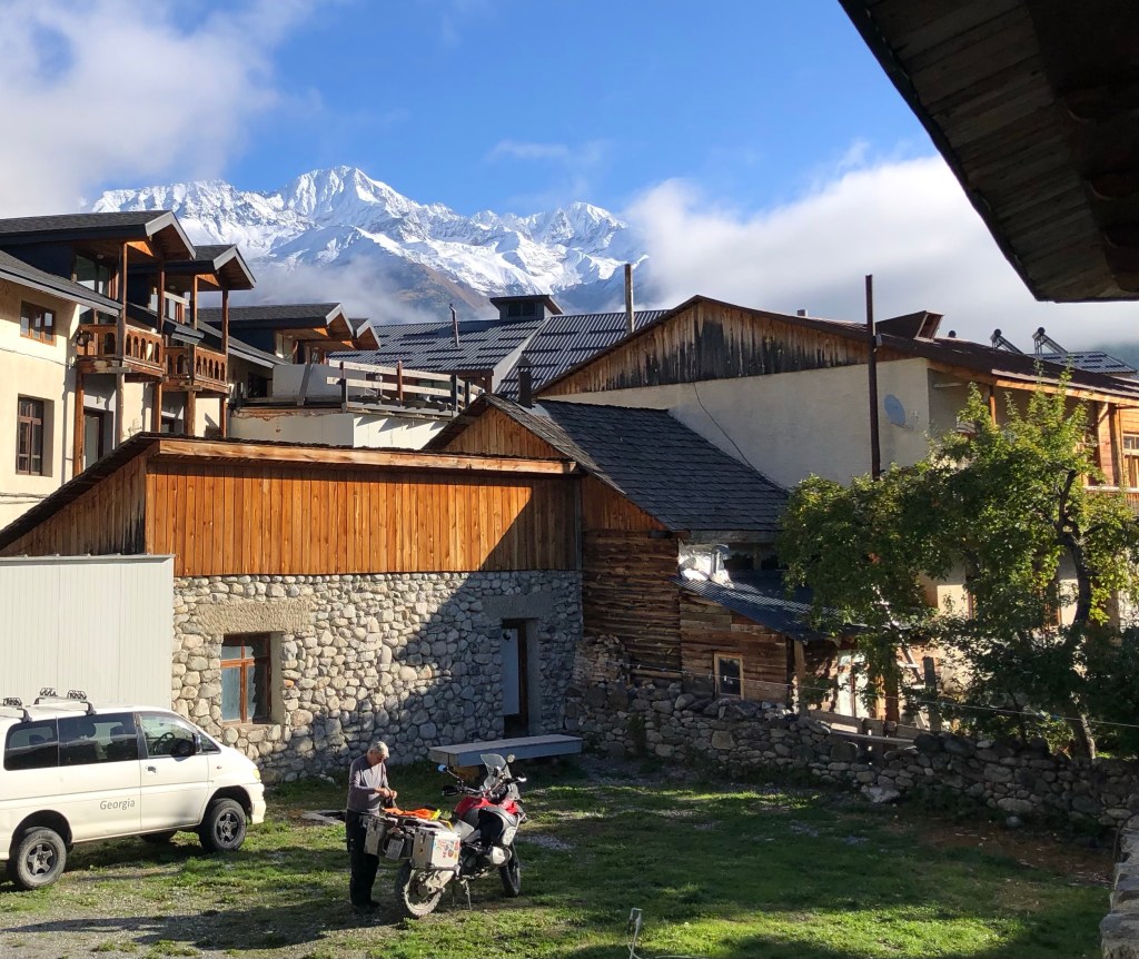 Ushguli besteht aus fünf kleinen Gemeinden und liegt auf 2.100m am Beginn der Enguri-Schlucht. Es ist eines der höchstgelegenen ununterbrochen bewohnten Bergdörfer Europas. Durch die Abgeschiedenheit hat sich die traditionelle Architektur der Wehr- und Wohntürme erhalten, die Svan-Türme. Von Zugdidi führt eine befestigte Straße bis Mestia und dann noch zirka 35 km rein in das Enguri-Tal. Die letzten rund 10 Kilometer sind noch unbefestigt. Wir hatten uns diesmal auf die Wetter-App verlassen, denn nur der Mittwoch sollte mit strahlendem Wetter aufwarten. Die letzten Tage hatte es auch hier in der Region stark geregnet, was man an den teilweise noch reißenden Flüssen sehen konnte. Und in der Tat, am Mittwoch war Kaiserwetter, besser ging gar nicht. Die frisch angezuckerten Bergriesen des Kaukasus glitzerten schon in der Morgensonne. Die Temperatur war zwar winterlich. Sogar das Schneeflöckchen auf der Anzeige beim Motorrad zeigte sich erstmalig. Wir mussten da hoch, es gab kein zurück. Kurve um Kurve kletterten wir immer höher umzingelt von der atemberaubenden kaukasischen Bergwelt. Die Schönheit dieser Landschaft ist unbeschreiblich. Mühelos manövrierte uns der Bock-Chef rauf nach Ushguli. All zu viele Motorräder kommen um diese Jahreszeit hier nicht mehr an. Wir nahmen uns auch richtig Zeit, um das Dorf zu durchwandern und die frische Luft zu geniessen.