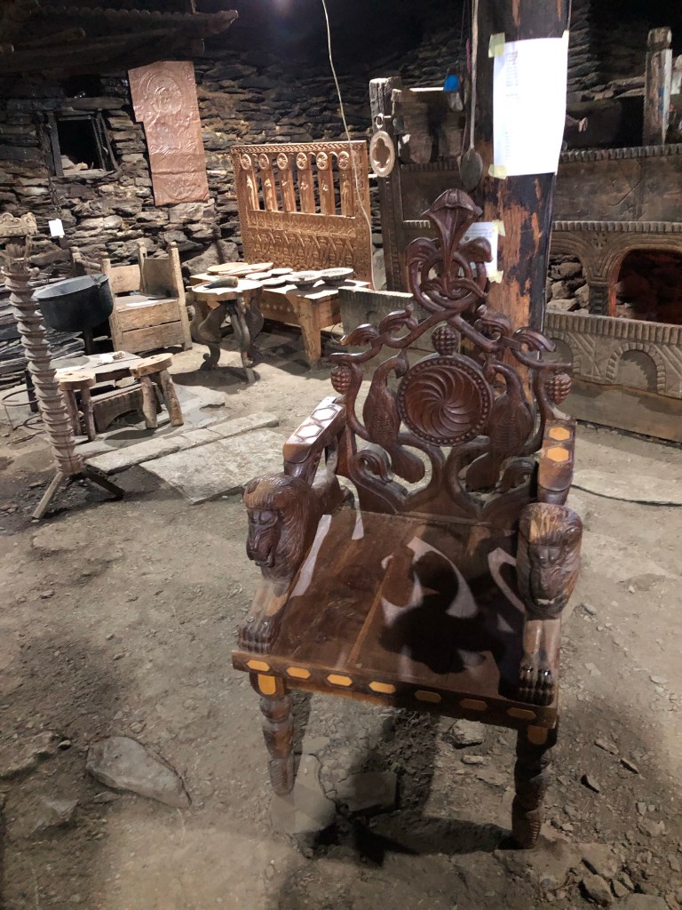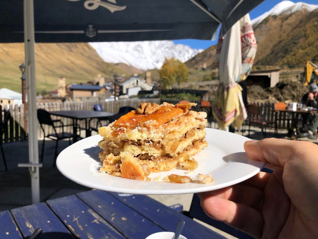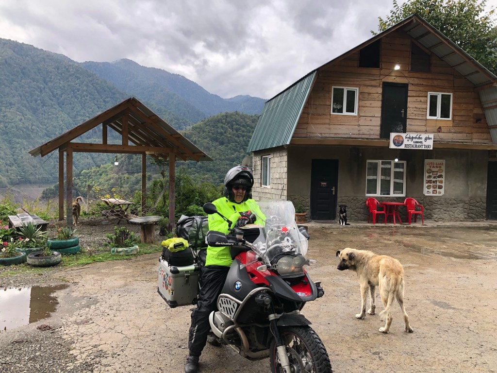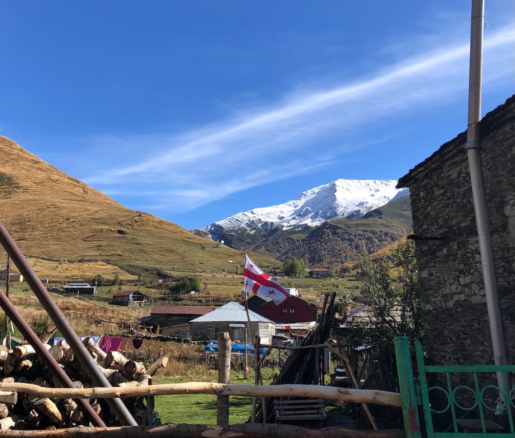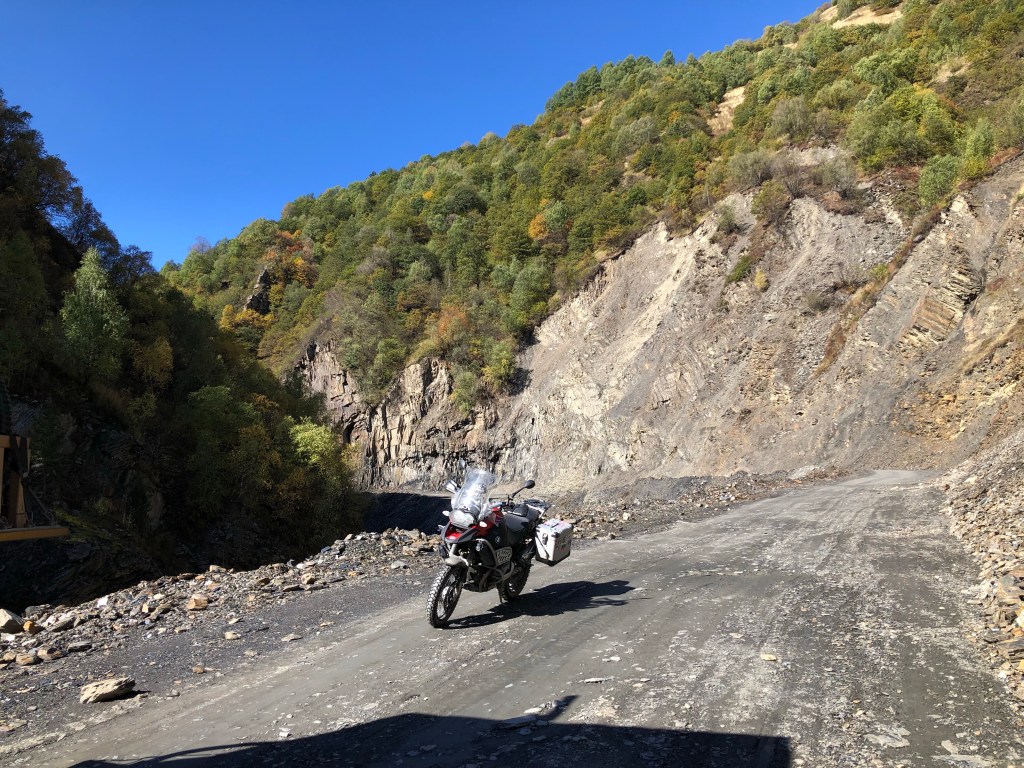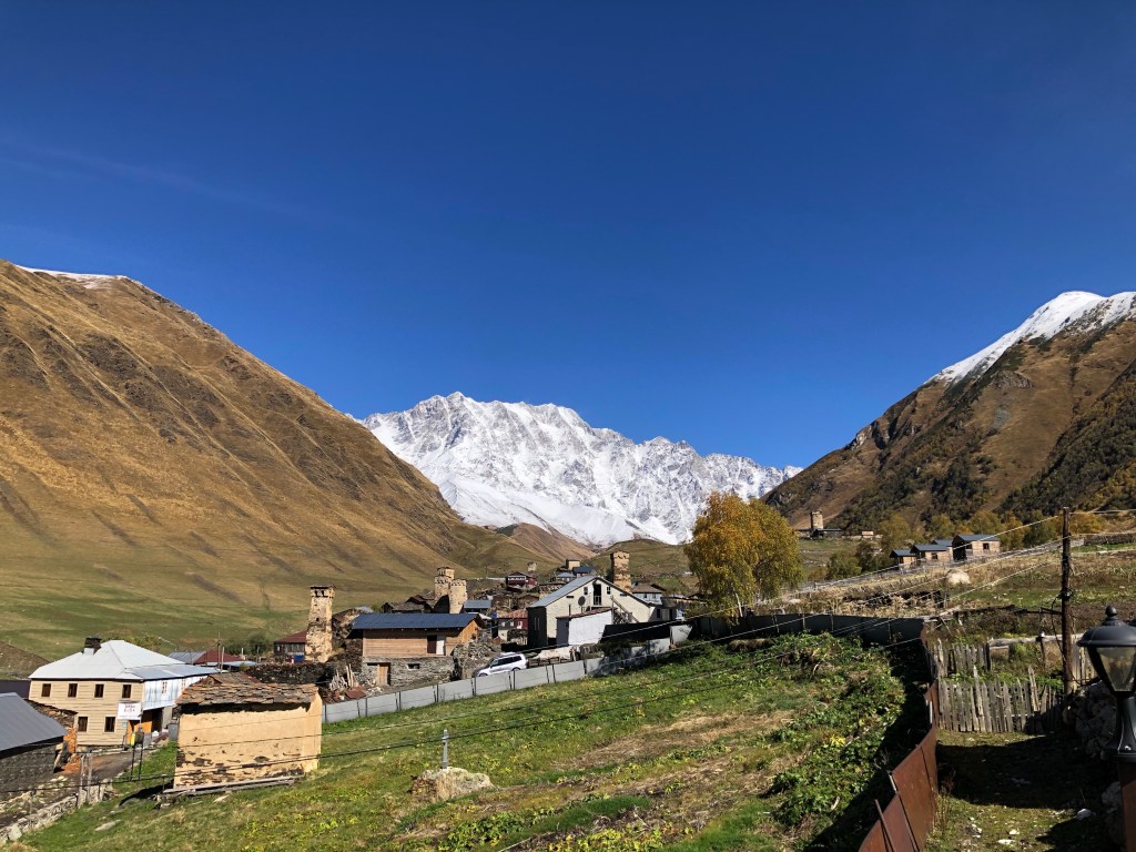 Ushguli besteht aus fünf kleinen Gemeinden und liegt auf 2.100m am Beginn der Enguri-Schlucht. Es ist eines der höchstgelegenen ununterbrochen bewohnten Bergdörfer Europas. Durch die Abgeschiedenheit hat sich die traditionelle Architektur der Wehr- und Wohntürme erhalten, die Svan-Türme. Von Zugdidi führt eine befestigte Straße bis Mestia und dann noch zirka 35 km rein in das Enguri-Tal. Die letzten rund 10 Kilometer sind noch unbefestigt. Wir hatten uns diesmal auf die Wetter-App verlassen, denn nur der Mittwoch sollte mit strahlendem Wetter aufwarten. Die letzten Tage hatte es auch hier in der Region stark geregnet, was man an den teilweise noch reißenden Flüssen sehen konnte. Und in der Tat, am Mittwoch war Kaiserwetter, besser ging gar nicht. Die frisch angezuckerten Bergriesen des Kaukasus glitzerten schon in der Morgensonne. Die Temperatur war zwar winterlich. Sogar das Schneeflöckchen auf der Anzeige beim Motorrad zeigte sich erstmalig. Wir mussten da hoch, es gab kein zurück. Kurve um Kurve kletterten wir immer höher umzingelt von der atemberaubenden kaukasischen Bergwelt. Die Schönheit dieser Landschaft ist unbeschreiblich. Mühelos manövrierte uns der Bock-Chef rauf nach Ushguli. All zu viele Motorräder kommen um diese Jahreszeit hier nicht mehr an. Wir nahmen uns auch richtig Zeit, um das Dorf zu durchwandern und die frische Luft zu geniessen.