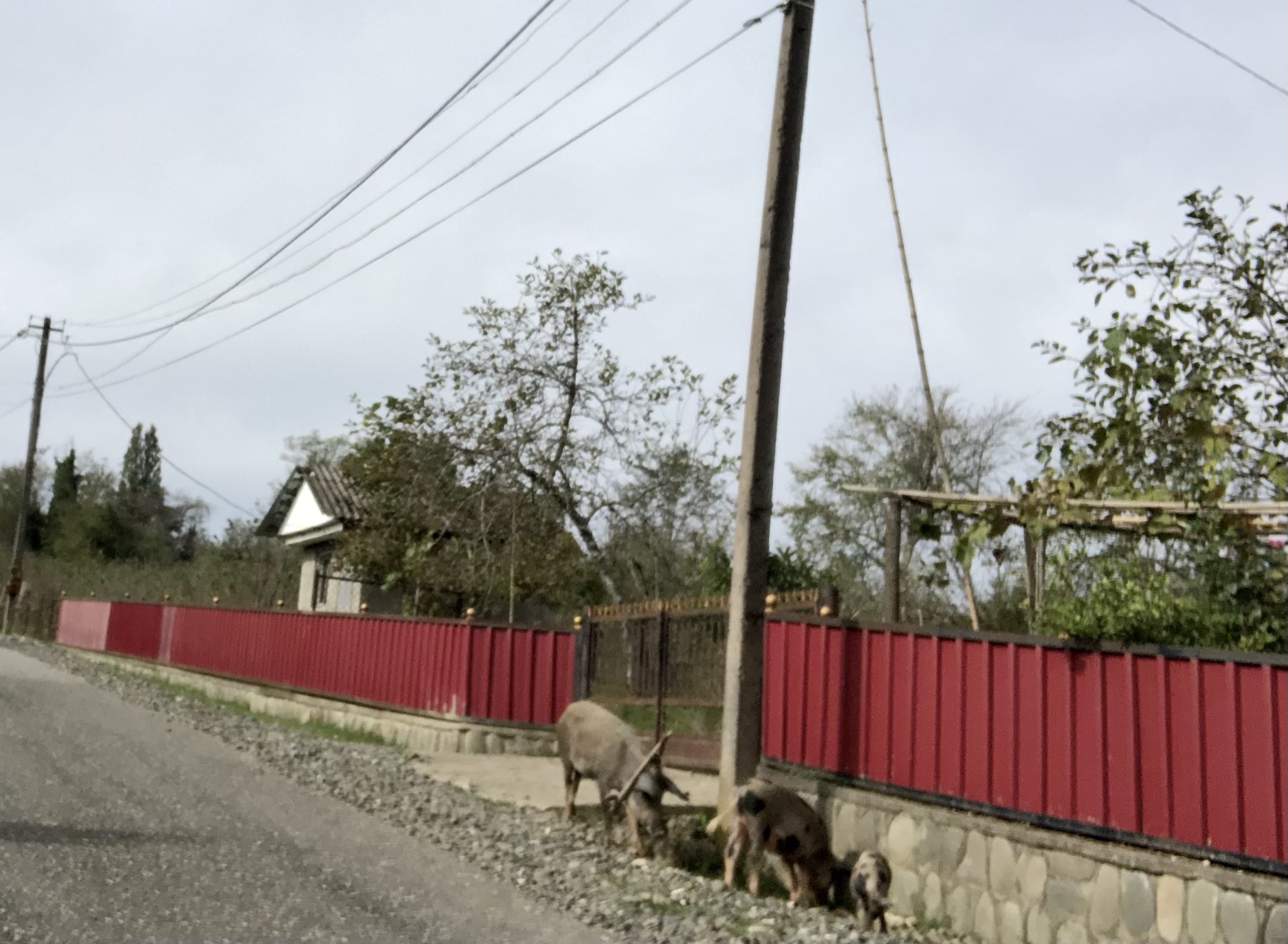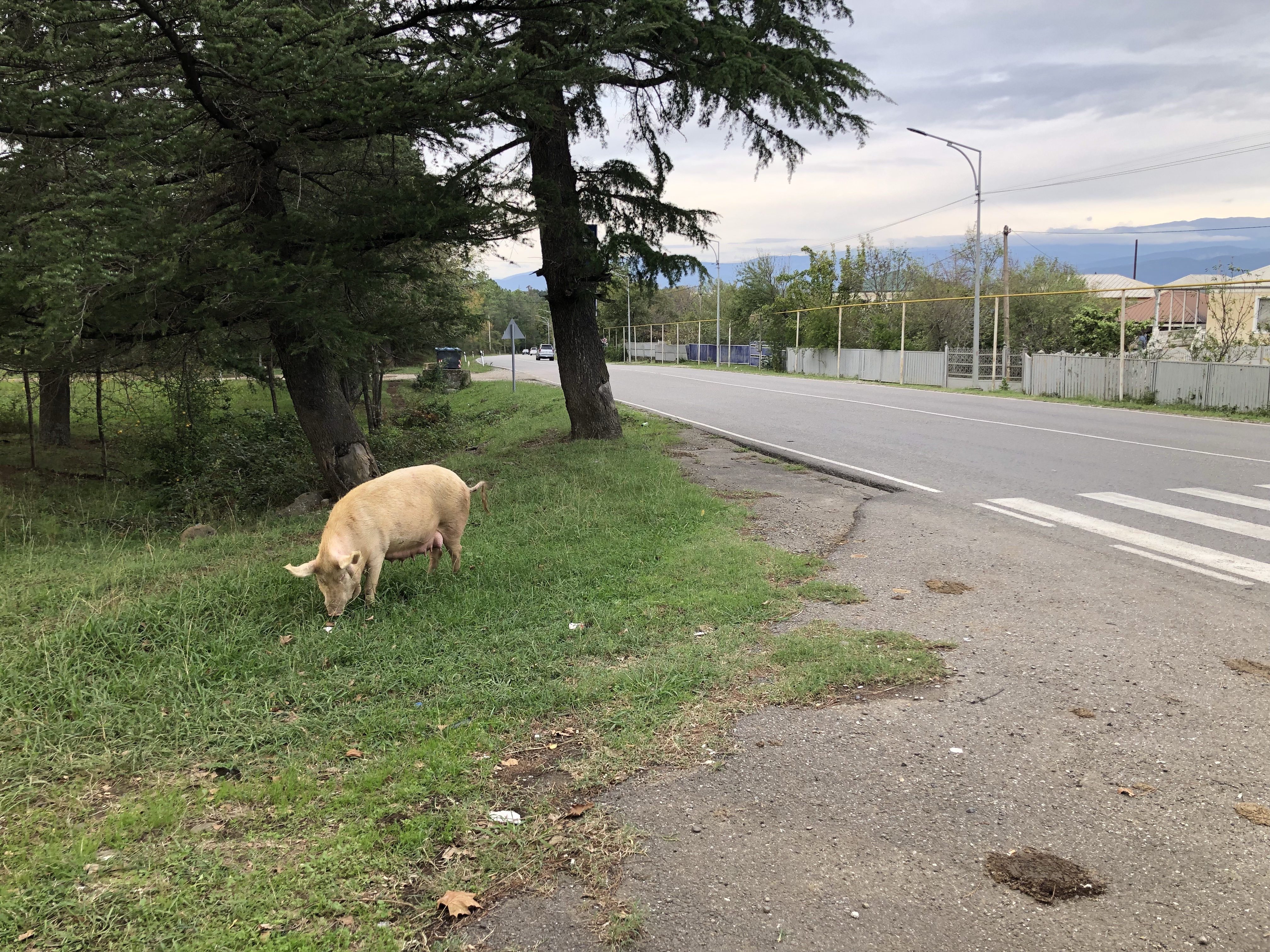 Wir mussten ja von der Bergregion um Ushguli wieder runter, damit wir noch andere sehenswerte Orte in Georgien anfahren konnten. Auch wenn das Land nicht groß ist, braucht man doch eine Weile von A nach B. Das Straßennetz ist nicht sehr dicht und nicht immer in gutem Zustand. Schotterpisten als Teil einer Hauptverbindung sind gar nicht so selten. Ich bin immer froh, wenn es wenigstens trocken ist, so dass man die Schlaglöcher gut umfahren kann, ohne von oben bis unten angespritzt zu werden oder durch den Matsch zu schlittern. Ein flottes Fahrtempo ist hier relativ. Es laufen und liegen viele Tiere seelenruhig auf der Straße herum. Der Fahrstil der Georgier ist für uns gewöhnungsbedürftig. Viele fahren als gäbe es kein morgen, die fahren einfach sauschnell und überholen an den unmöglichsten Stellen. Wir versuchten uns anzupassen und überfuhren auch schnittig eine Sperrlinie wie alle anderen. Nur leider hat UNS die Polizei aufgehalten, Alko-Test und natürlich ein Geldstrafe inklusive.