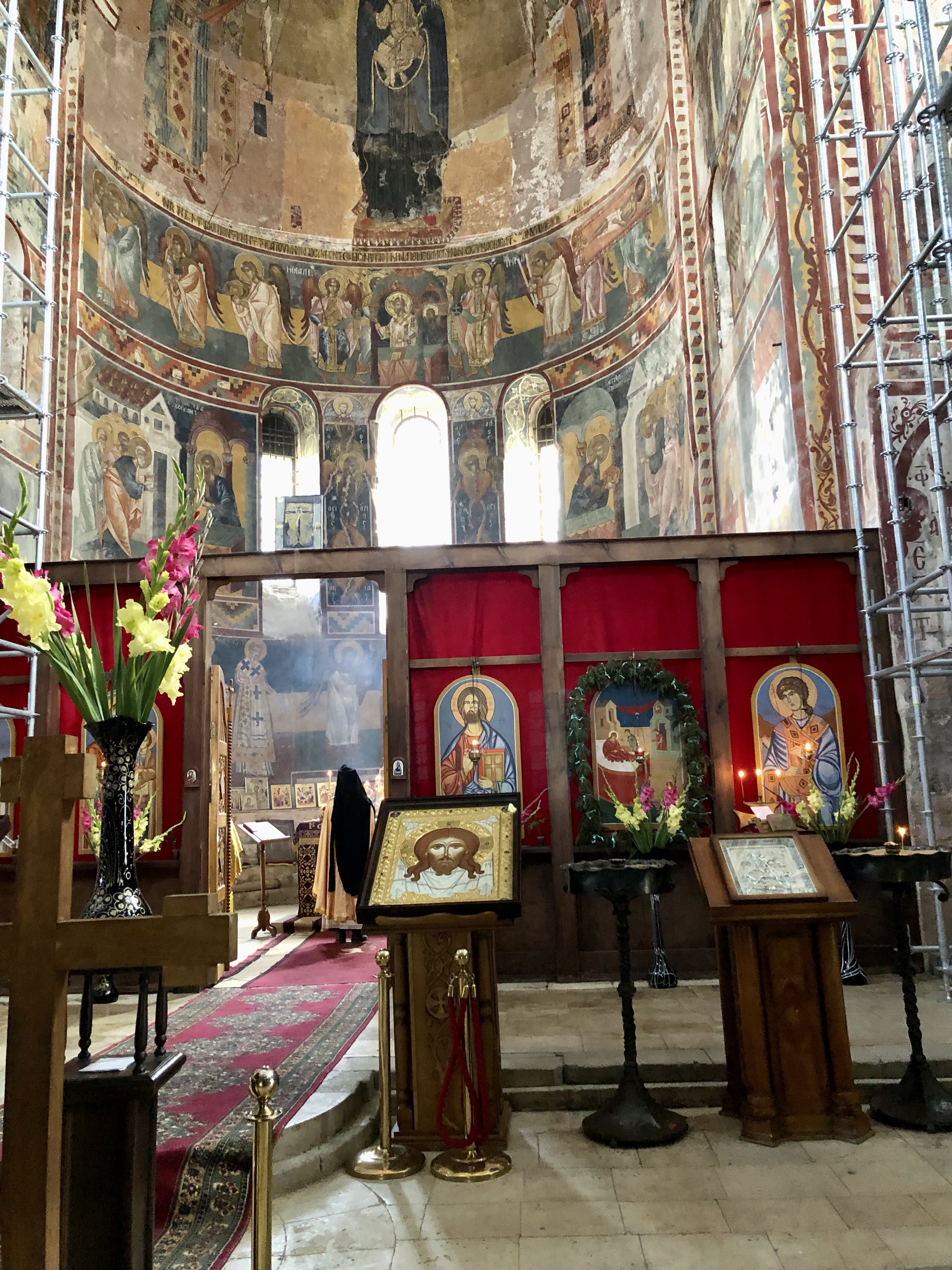 Um den 2011, an Stelle eines Sowjetischen Denkmals, errichteten Brunnen ging es herum und weiter zum Gelati-Kloster, das etwas ausserhalb der Stadt liegt. Die ersten Gebäude der Anlage wurden von König David dem Erbauer und von seiner Frau Königin Tamara 1106 angeregt. Das Kloster war einst intellektuelles Zentrum für Wissenschaft und Bildung. Heute ist es ein beliebter Wallfahrtsort und ein Touristenmagnet.