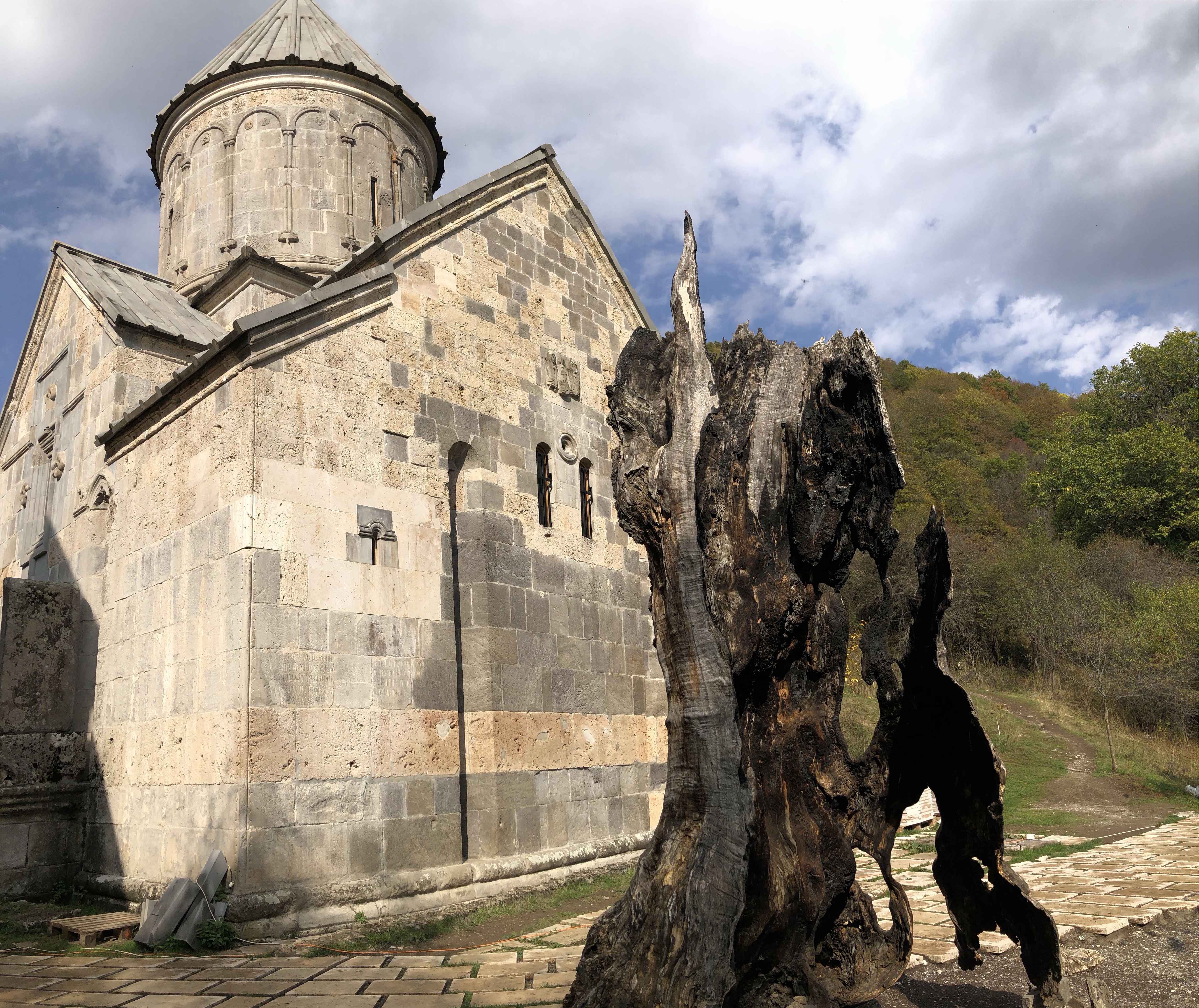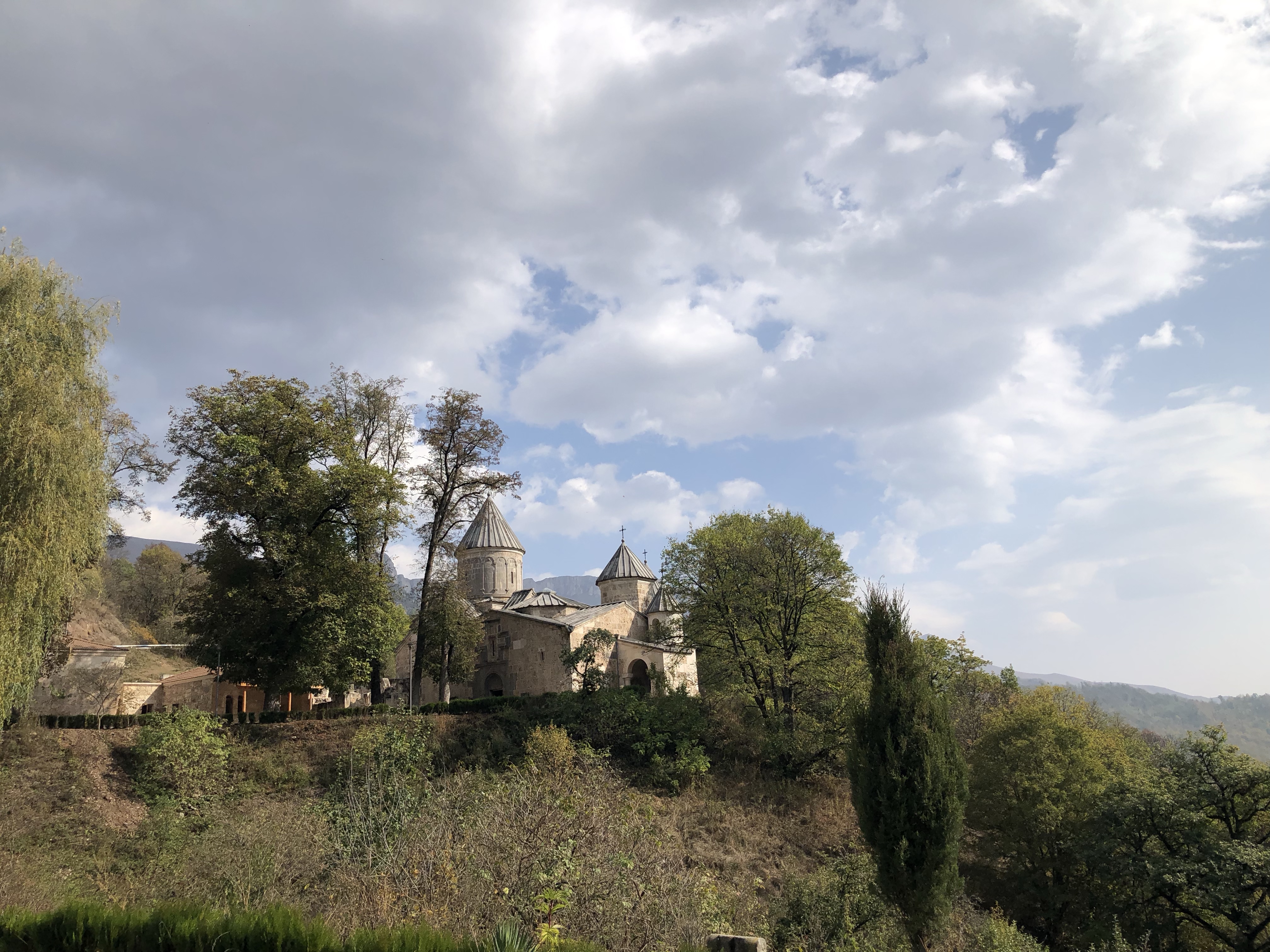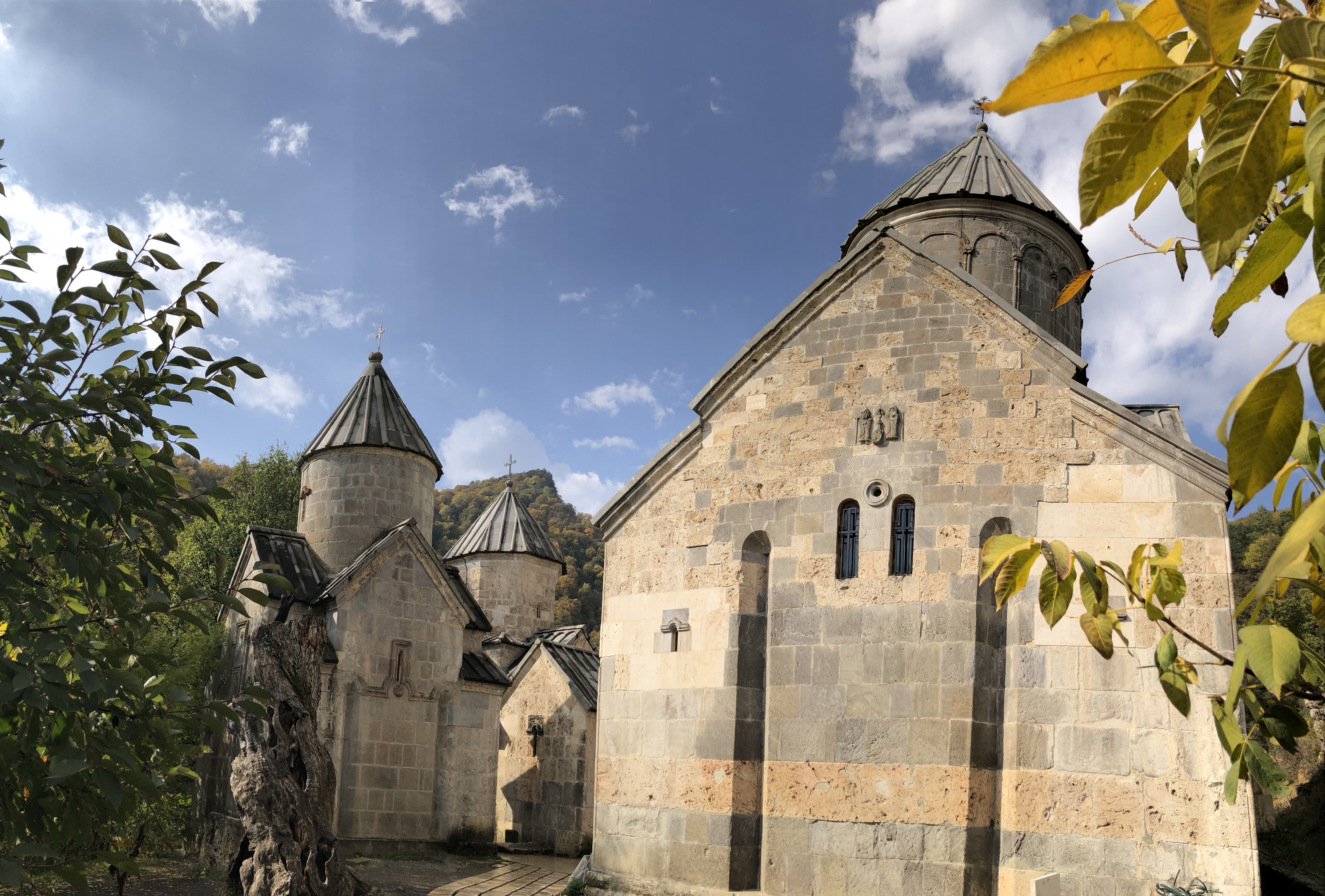 Sie meinte, wenn wir es irgendwie einrichten können, sollten wir das Kloster Haghartsin noch besuchen. Das lies sich gut einrichten und war für uns am Weg zur Grenze kein großer Umweg. Bei Dilijan bogen wir in einen schmalen Weg ein, der durch einen herbstlich gelb gefärbten Laubwald zum Kloster führte. Quasi am Ende der Straße befindet sich der Klosterkomplex Haghartsin. Mehrere Kirchen aus dem 10.-13. Jahrhundert wurden hier auf dem Platz eng einander gebaut. Der armenische Baustil mit den Garwinen (Vorhallen) und die Gedenksteine mit der kunstvollen ornamentalen und floralen Motiven fehlten auch hier nicht. Was hier hervorsticht ist, dass die Anlage von keiner Wehrmauer umgeben ist. Haghartsin hat etwas kontemplatives und strahlt eine enorme Ruhe aus. Sicher ist daher nicht umsonst ein Gästehau etwas abseits zu finden, wo man sich zurückziehen kann. In dem kleinen Cafe beim Honiggeschäft können Jugedliche lernen den traditionellen gefüllten Gata Kuchen zu backen.