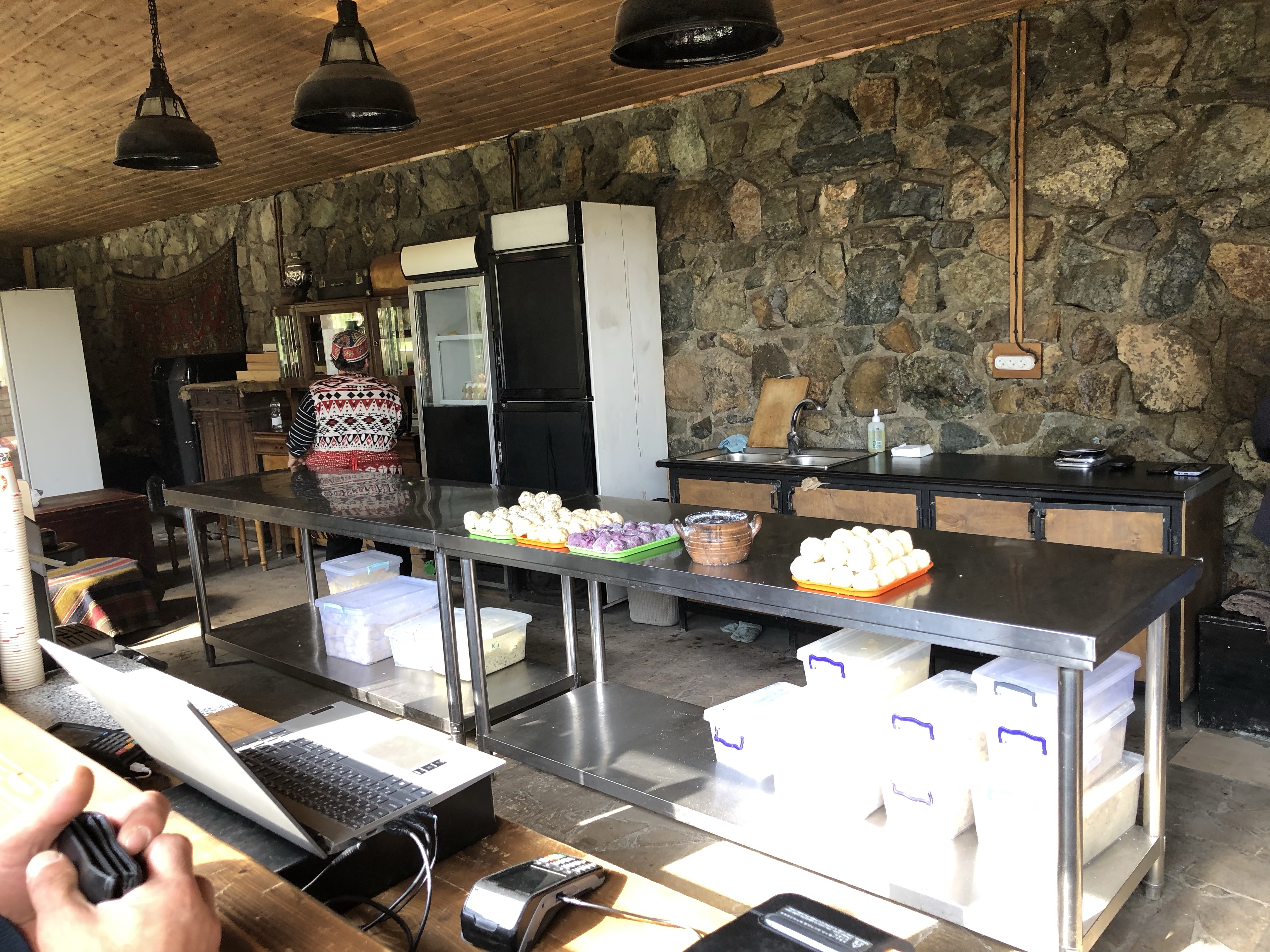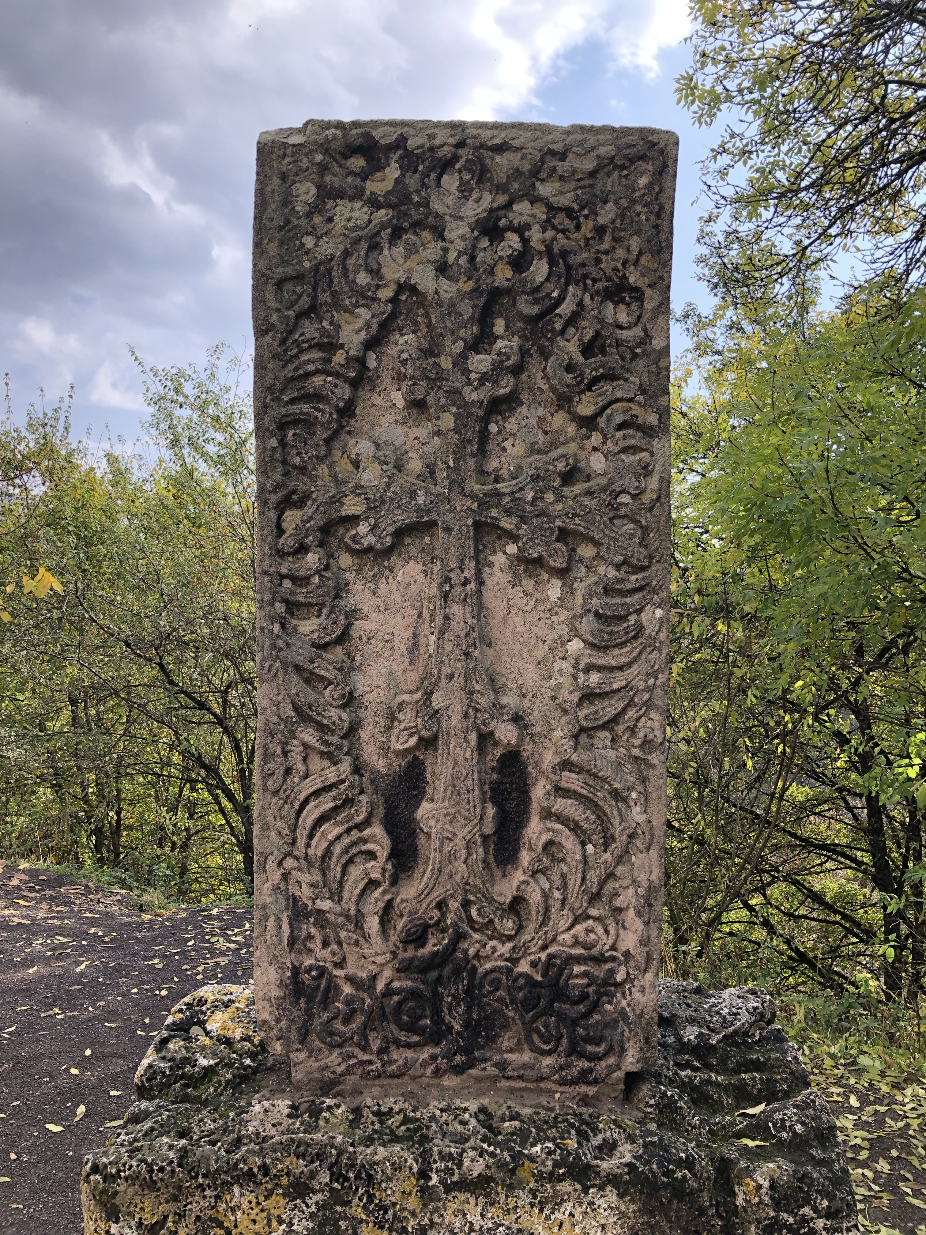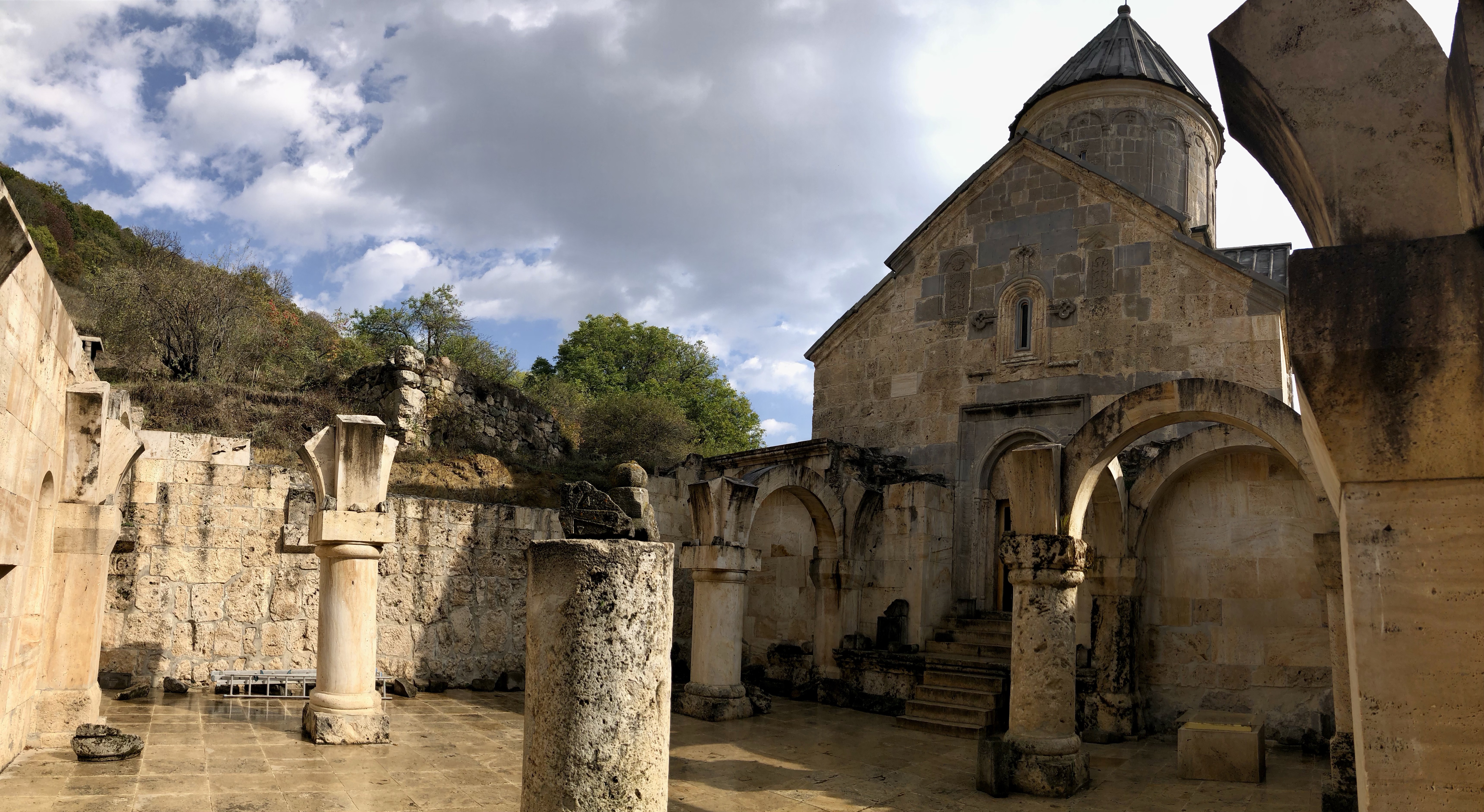 Sie meinte, wenn wir es irgendwie einrichten können, sollten wir das Kloster Haghartsin noch besuchen. Das lies sich gut einrichten und war für uns am Weg zur Grenze kein großer Umweg. Bei Dilijan bogen wir in einen schmalen Weg ein, der durch einen herbstlich gelb gefärbten Laubwald zum Kloster führte. Quasi am Ende der Straße befindet sich der Klosterkomplex Haghartsin. Mehrere Kirchen aus dem 10.-13. Jahrhundert wurden hier auf dem Platz eng einander gebaut. Der armenische Baustil mit den Garwinen (Vorhallen) und die Gedenksteine mit der kunstvollen ornamentalen und floralen Motiven fehlten auch hier nicht. Was hier hervorsticht ist, dass die Anlage von keiner Wehrmauer umgeben ist. Haghartsin hat etwas kontemplatives und strahlt eine enorme Ruhe aus. Sicher ist daher nicht umsonst ein Gästehau etwas abseits zu finden, wo man sich zurückziehen kann. In dem kleinen Cafe beim Honiggeschäft können Jugedliche lernen den traditionellen gefüllten Gata Kuchen zu backen.