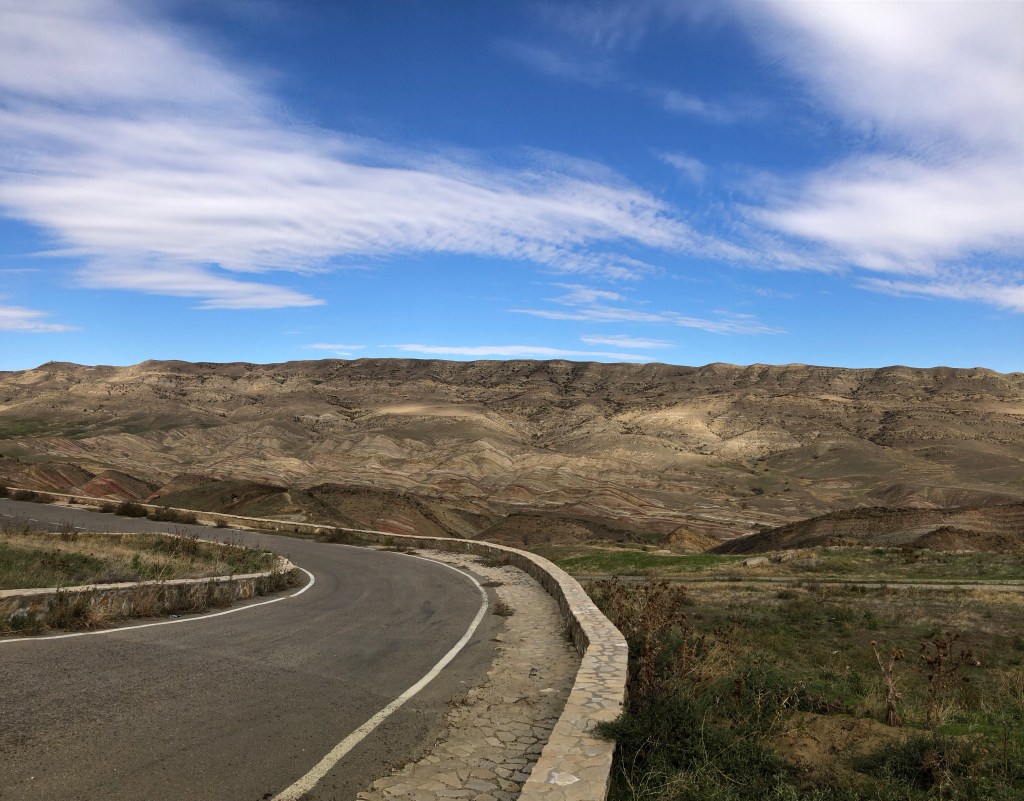 Diese Landschaft ist wahrlich schwer zu beschreiben (mich erinnert es ein bisschen an arabische Hügel und Berge – Wüsten ohne Sand!) – und dann dieser Klosterkomplex – sehr beeindruckend! Und dass ihr eure Füße auf aserbaidschanischen Boden gesetzt habt – fantastisch. Weiter gute Fahrt!