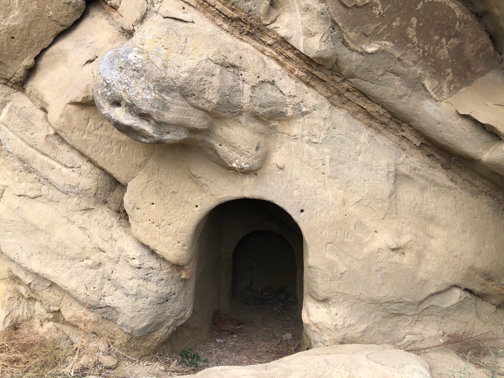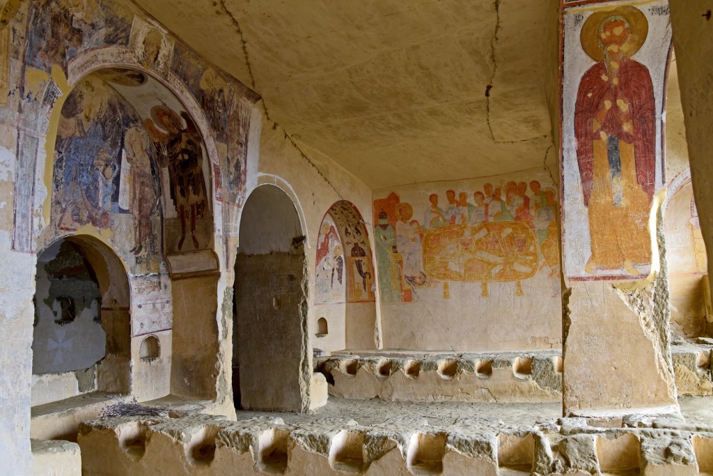 Vom Kloster David Gareja führt ein steiler Pfad auf die Hinterseite des Berges, der genau genommen schon zu Aserbaidschan gehört. Die Anwesenheit von Touristen, welche die Höhlenkirche besuchen, wir geduldet. Zwei Grenzposten bewachen den Weg. Dort liegt das Höhlenkloster Udabno, das für seine Fresken aus dem 10. Jahrhundert bekannt ist. Hier begannen die Mönche, die Freskenmalerei zu revolutionieren, weil sie neben Motiven aus dem Alten und Neuen Testament auch Bilder aus dem Leben georgischer Heiliger und Herrscher einfügten.