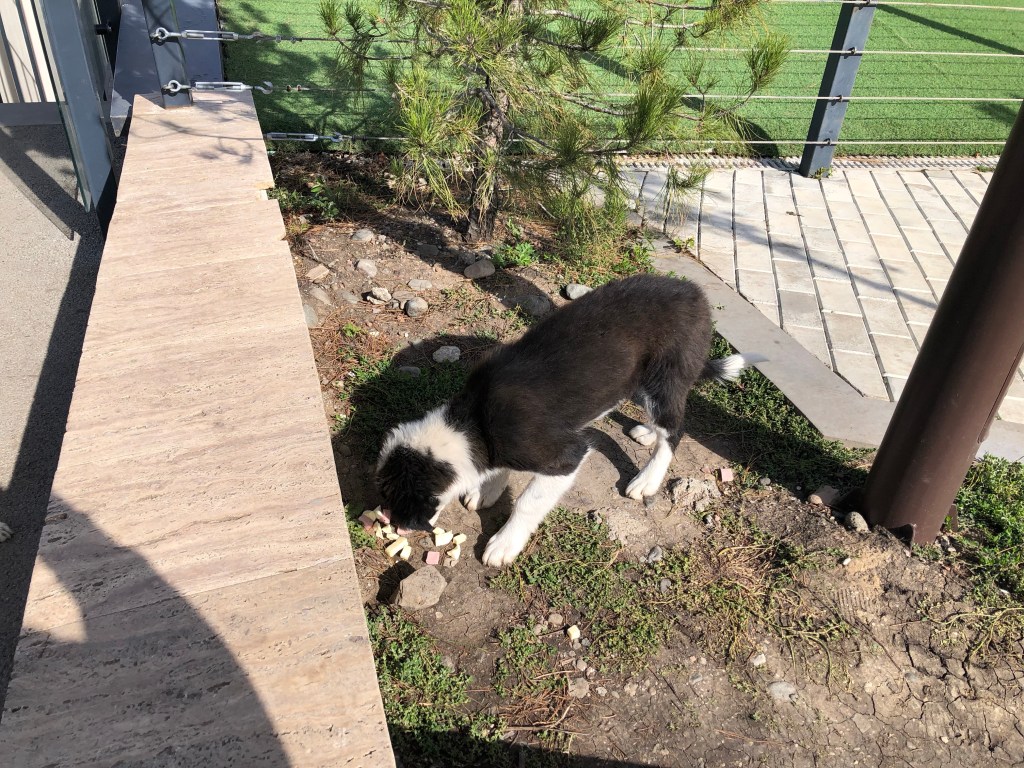 Ein junger herziger Straßenhund begrüßte uns am Parkplatz recht freundlich. In weiser Voraussicht hatten wir unsere Proviantreste (viel Käse und Schinken) aus Tiflis für so einen „armen Hund“ mitgebracht. Bis seine Mutter überzogen hatte, wo das Futter hinter der Mauer lag, hatte der Kleine schon alles gierig weggeputzt.