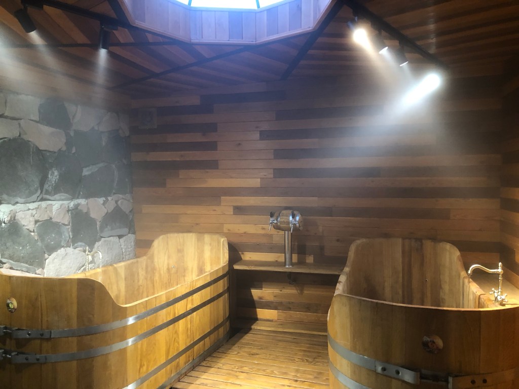Nach dem Abenteuer fuhren wir weiter nach Aspindza, wo wir uns in einer kleinen Bierbrauerei für die Nacht eingemietet hatten. Abgeschieden in ruhiger Lage in dem kleinen georgischen Dorf liegt die Amphora Brewery. Hier wird einzigartiges Bier gebraut nach einer alten Tradition. Das Bier wird wie der georgische Wein in Ton-Amphoren gelagert und zur Reife gebracht. Das Gebräu schmeckt wirklich gut. Und die Krönung des coolen Tages war der Bier-Spa. In einem Nebengebäude standen zwei Holzwannen, in denen wir ein heißes Bad mit Bieressenzen nehmen konnten. Ausgefroren wie wir waren, war das genau das Richtige.