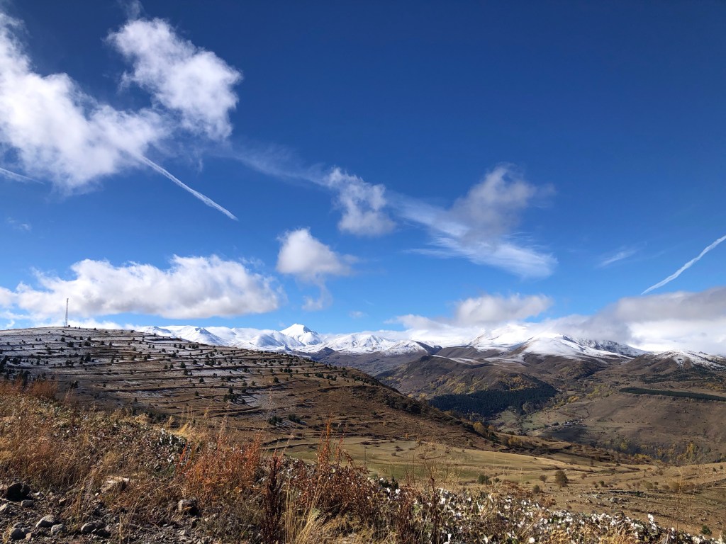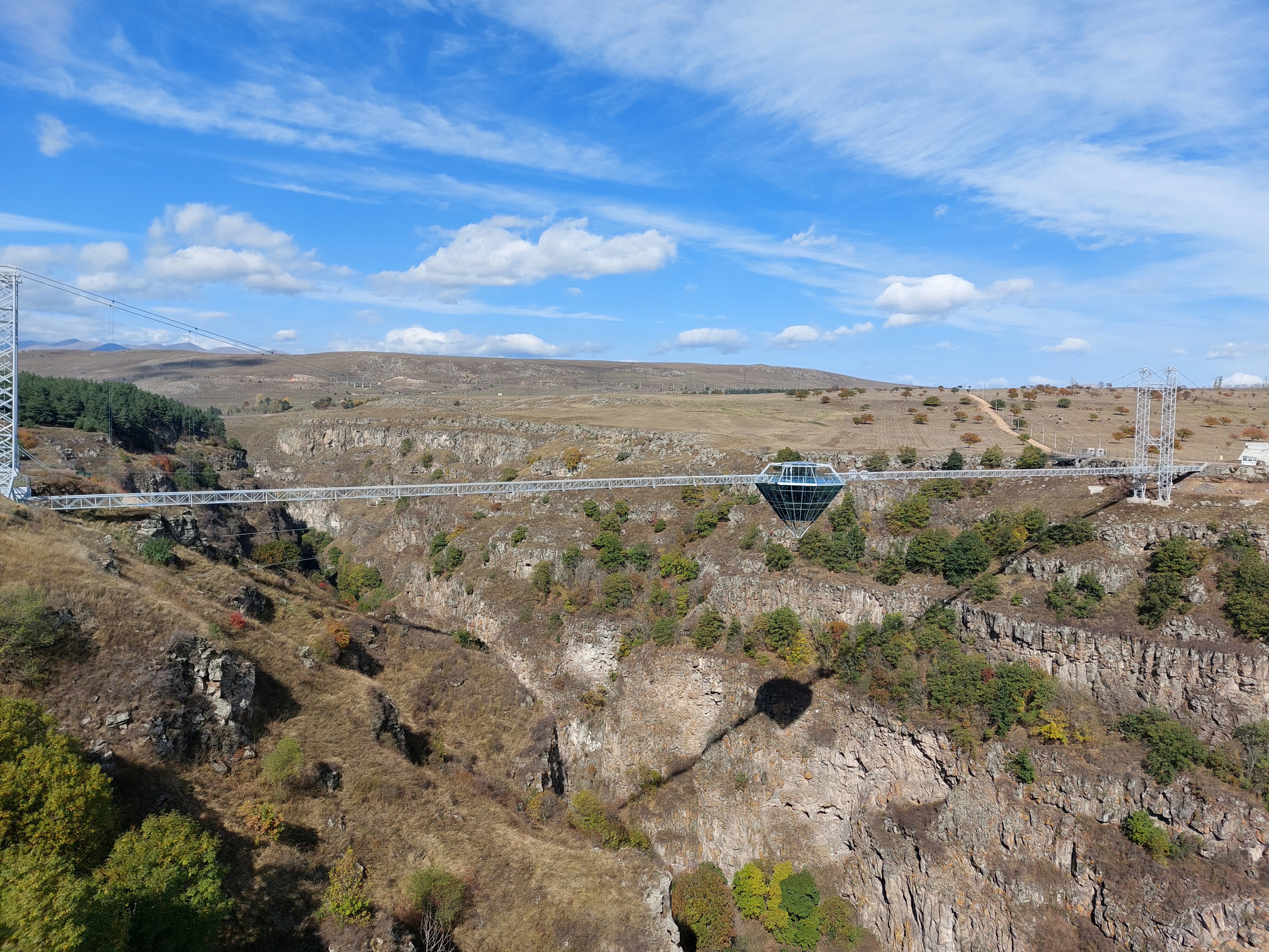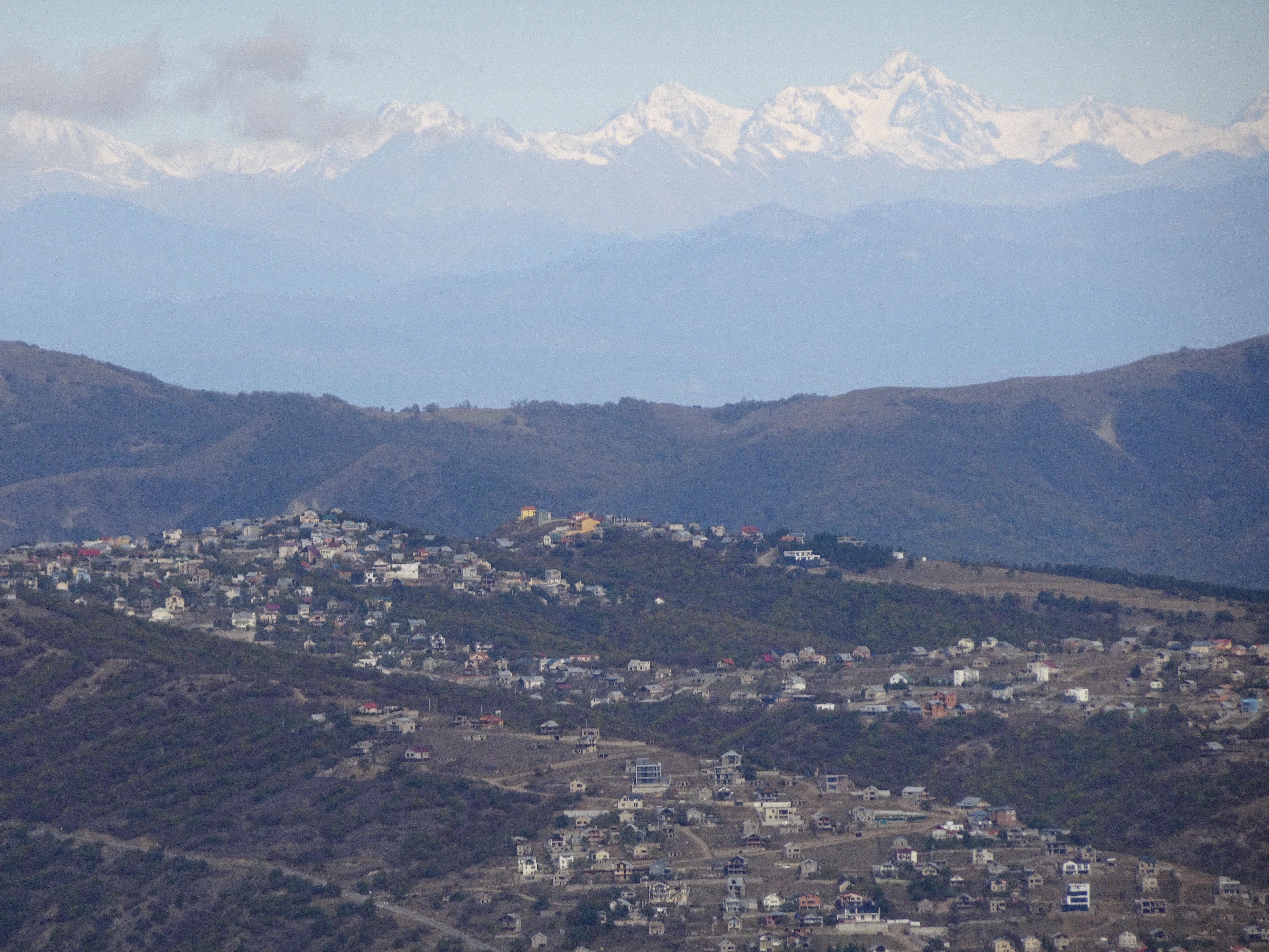 Von Tiflis raus stieg die Straße wieder an und im Hintergrund leuchteten die schneebedeckten Bergriesen des Kaukasus herüber. Die Luft war klar und frisch und zum Fahrtwind mischte sich zunehmend ein stürmischer Seitenwind. Es war gar nicht leicht den Bock in der Spur zu halten. Die zwei ins Visier genommenen Offroad-Strecken, wurden gleich gestrichen. Denn bei der Kälte und womöglich am Pass bei über 2400m im Schnee irgendwo im Nirgendwo stecken zu bleiben, war zu riskant. Die alternative coole Fahrt über das Hochplateau, war trotzdem ein Erlebnis. Immerhin hatten wir den Tipp einer Fremdenführerin in der Tasche, einen Abstecher nach Dashbadi zu machen. Dort schwebt nämlich ein Diamant in schwindelnder Höhe über der Schlucht. Aha! Na dann auf zum Diamanten, das mussten wir uns ansehen.