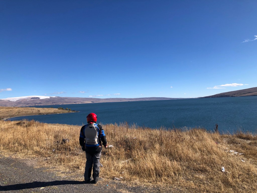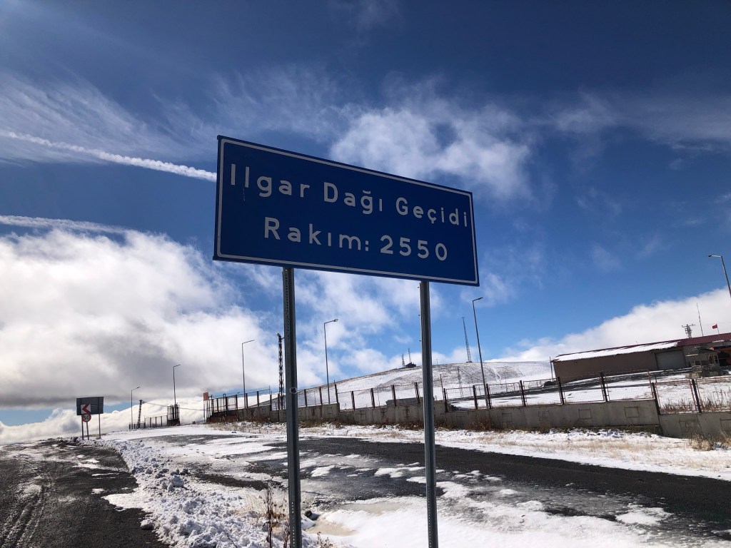 Ausgeschlafen, aufgewärmt und gestärkt ging es zur türkischen Grenze (Vale-Posof). Keine Ahnung, wie lange das dauern würde. Und es hat ein wenig gedauert, weil die türkische Grenzstation neu gebaut wird und derzeit in einer Art Notbetrieb läuft. Autos, LKWs und Motorräder alles durcheinander und die Formalitäten für alle werden in nur einem Baucontainer erledigt. Verkehr war nicht viel. Der Wind pfiff schon wieder um den Helm herum. Aber es war sonnig und das machte die Kälte gleich gefühlt um ein paar Grad wärmer. Man kann sich die Dinge auch schön reden! Bei 2550 m am Ilgar Dagi Gecidi – Pass lag dann Schnee. Gut, dass der Schneepflug schon ausgerückt war und die Fahrbahn frei gemacht hatte. Tiefster Winter in der Türkei, das war so nicht eingeplant. Eine echt coole Sache. Aber wie schon erwähnt, bei Sonnenschein ist auch die Kälte zu ertragen. Die Straße war neu, die Landschaft war grandios, warm eingepackt war das bis Kars schon ohne Frostbeulen zu schaffen.
