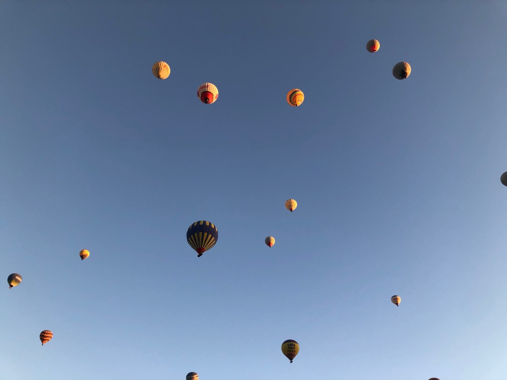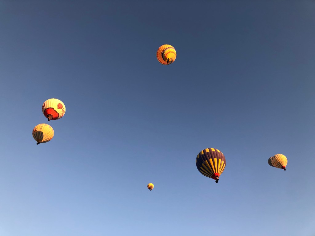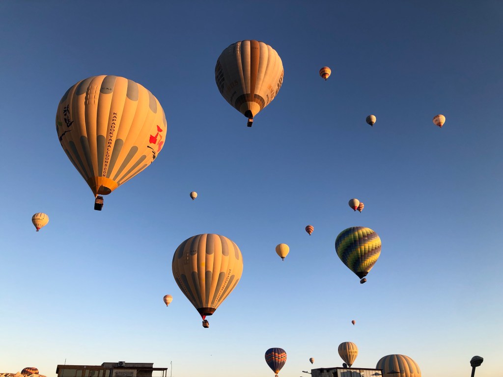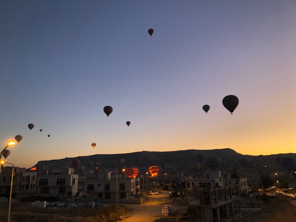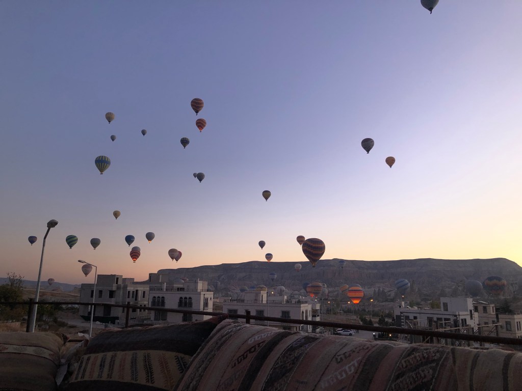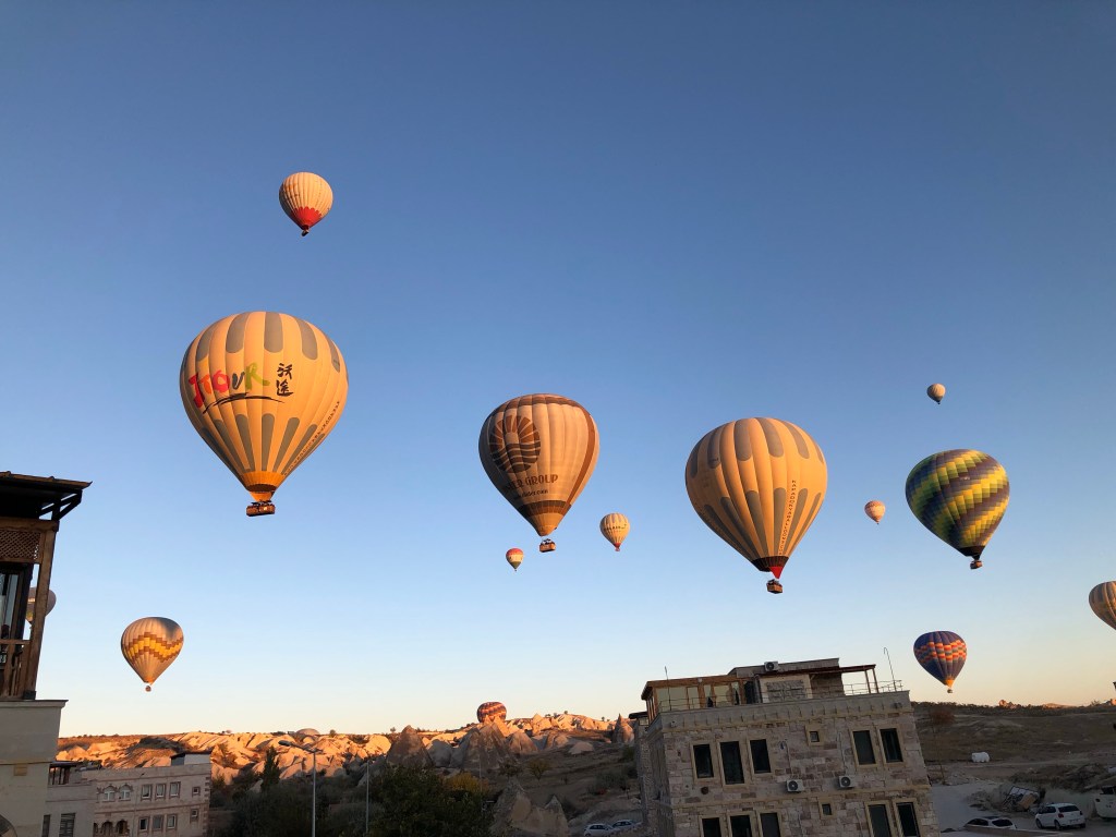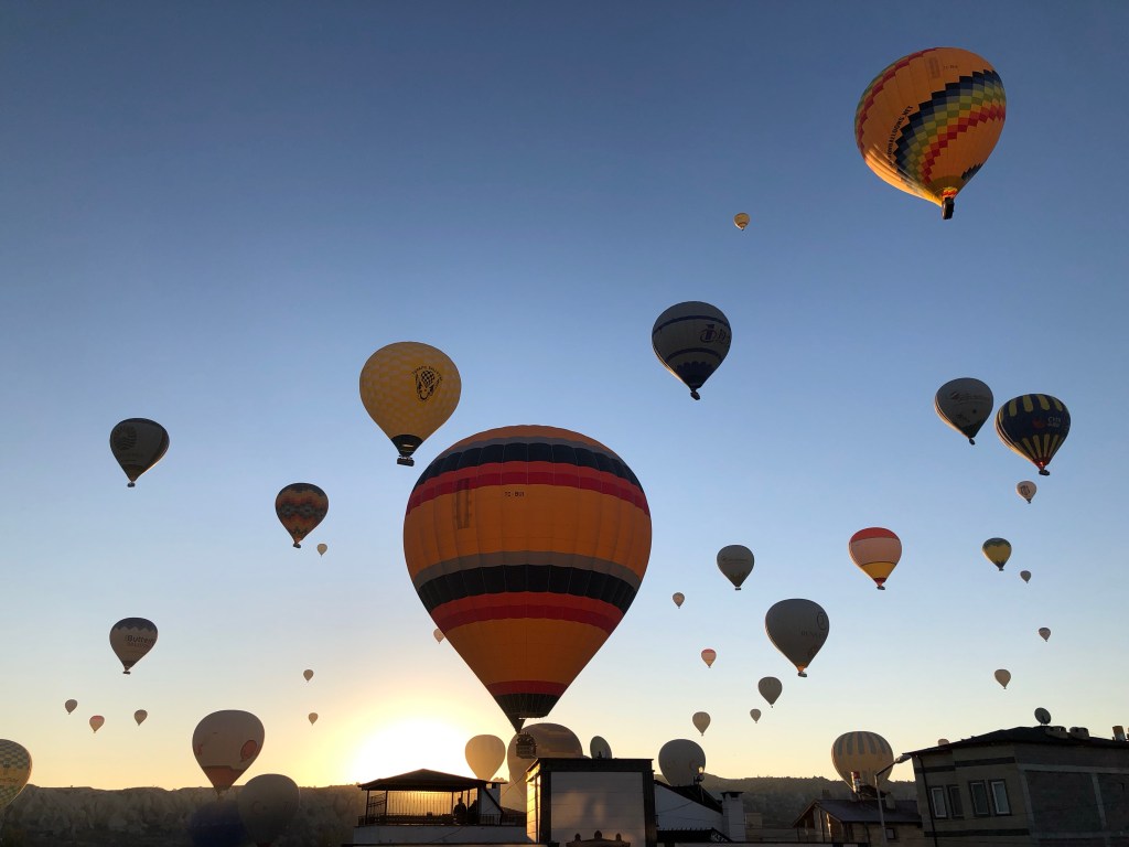 Nun begonnen hat unser Tag aber ganz anders. Kappadokien ist ja vor allem auch für seine Ballonfahrten bekannt. Die Thermik im Becken von Göreme ist besonders geeignet und daher können hier fast täglich Fahrten gemacht werden. Kurz vor Sonnenaufgang stiegen unzählige Ballons in die Höhe. Das fauchen der Gasflammen war weithin zu hören und hatte uns aufgeweckt. Gut so, denn wir wollten von der Hotelterrasse sowieso zusehen. Es hat sich wirklich geloht, so früh aus den Federn zu kriechen. Überall erhoben sich die bunten Ballons, beladen mit Körben bis zu 20 Personen. Und sobald die Sonne hinter dem Bergrücken hoch kletterte und die ersten Strahlen die Hülle der Ballons erreichte, begann einer nach dem anderen in der Morgensonne zu leuchten.