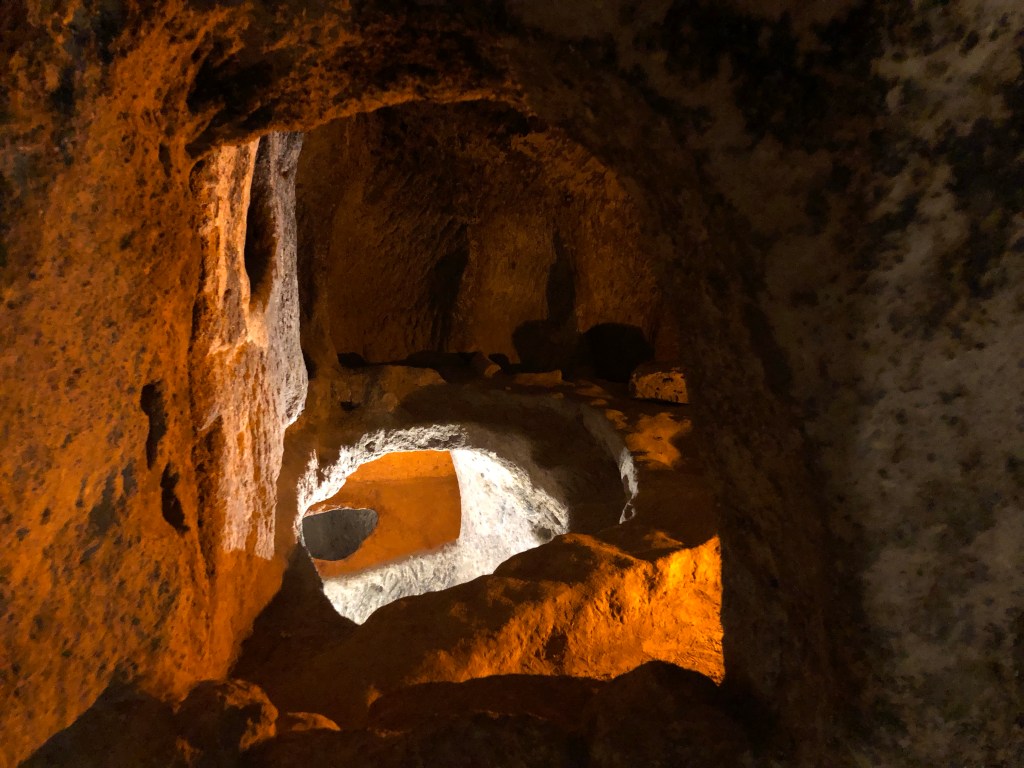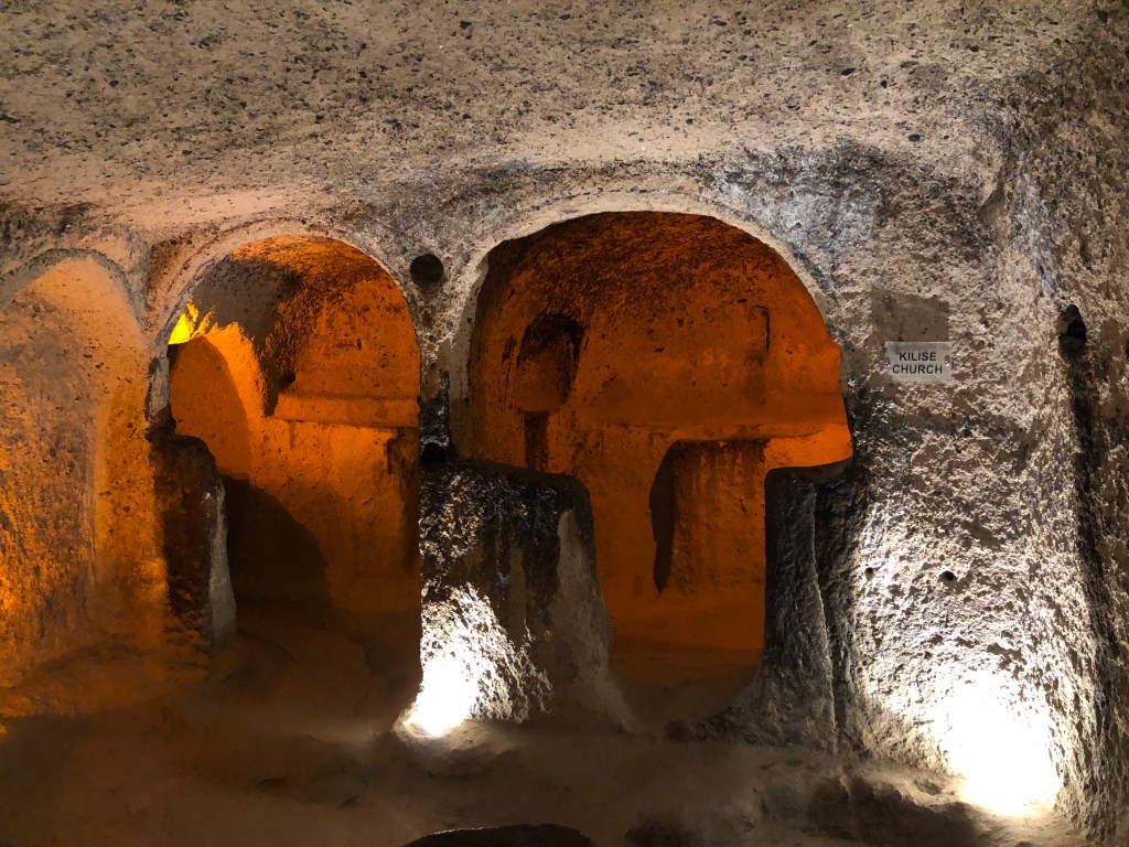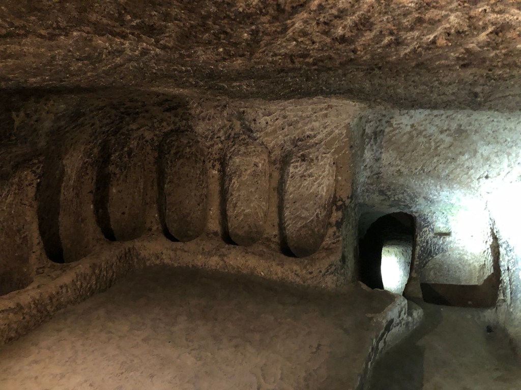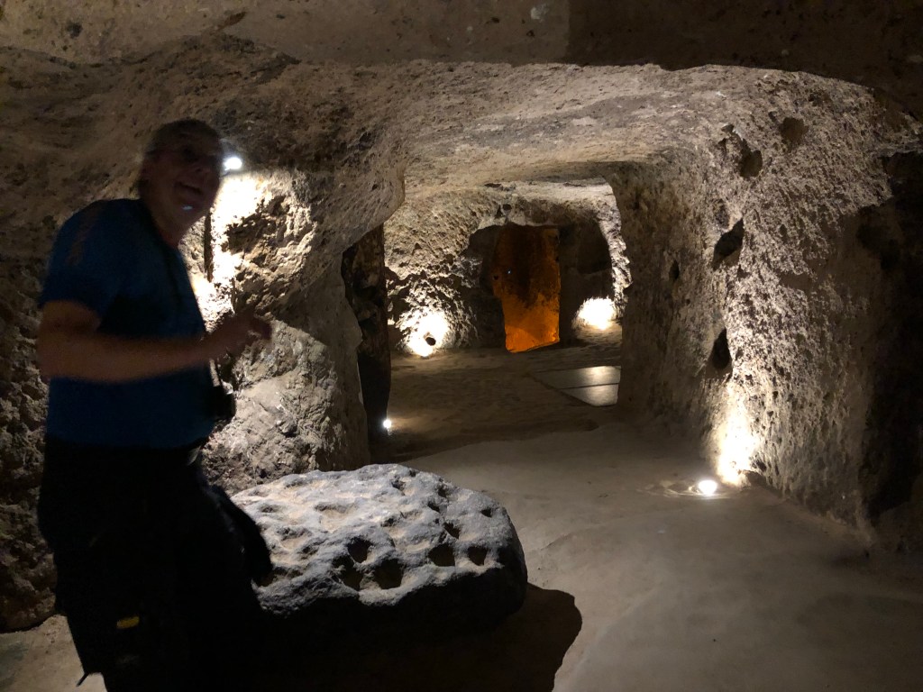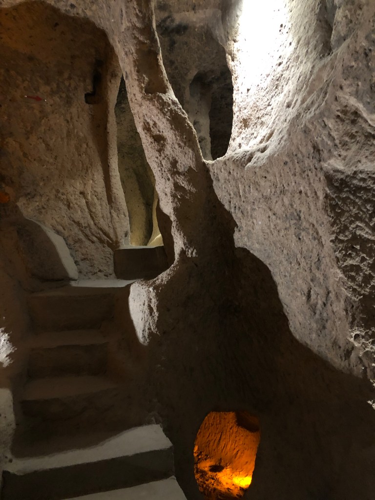 Nicht nur das Naturspektakel versetzte uns in endloses Staunen, auch die verborgene Höhlenstadt Kaymakli war ein Highlight der Reise. Es wird vermutet, dass es 50 Höhlenstädte in der Region Kappadokien gibt, 36 sind erforscht und teilweise für BesuchterInnen erschlossen. Zwischen Kaymakli und Dernikuyu , der größten Höhlenburg, sollte es sogar einen 9 km langen Tunnel gegeben haben. Aber wer und warum wurden hier so gigantische Höhlenstädte angelegt? Es wird vermutet, dass die ersten Anlagen in die Phrygischen Zeit fallen, also 8.-7. Jh. AD. Unter der römischen Herrschaft versteckten sich die verfolgte Christen und kappadokische Griechen in diesen Höhlensystemen, die bis zu 8 Stockwerke in die Tiefe gehen. In Kaymakli sind 5 Stockwerke zugänglich. Die Gänge sind schmal und niedrig. Entweder waren die Leute wirklich sehr viel kleiner oder man bewegte sich teilweise kriechend vorwärts. Ein ausgeklügeltes Belüftungssystem schaffte Frischluft in die Tiefe. Anders wäre ein Leben da unten gar nicht möglich gewesen. An Klaustrophobie durfte man definitiv nicht leiden. Es wird vermutet, dass in Kaymakli bis zu 15.000 Leute Schutz gefunden hatten. Heute sind dekorative Lichter in den Gängen und Höhlen angebracht, aber unvorstellbar, wie das tägliche Leben in der Enge und Dunkelheit wirklich gewesen sein mag. Wir waren nach einer knappen Stunde wieder froh, an die Luft und ans Tageslicht zu kommen.
