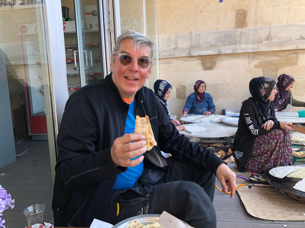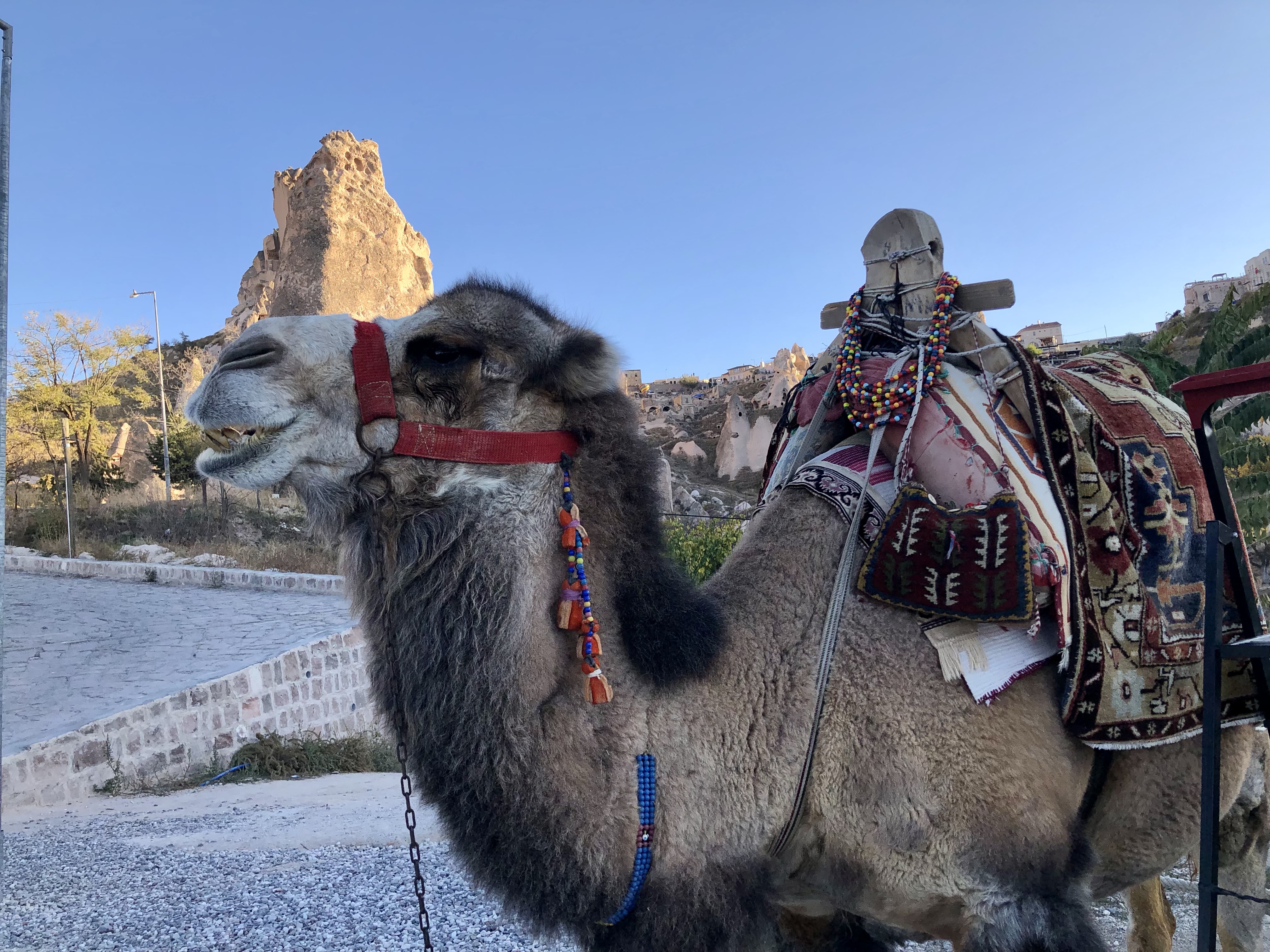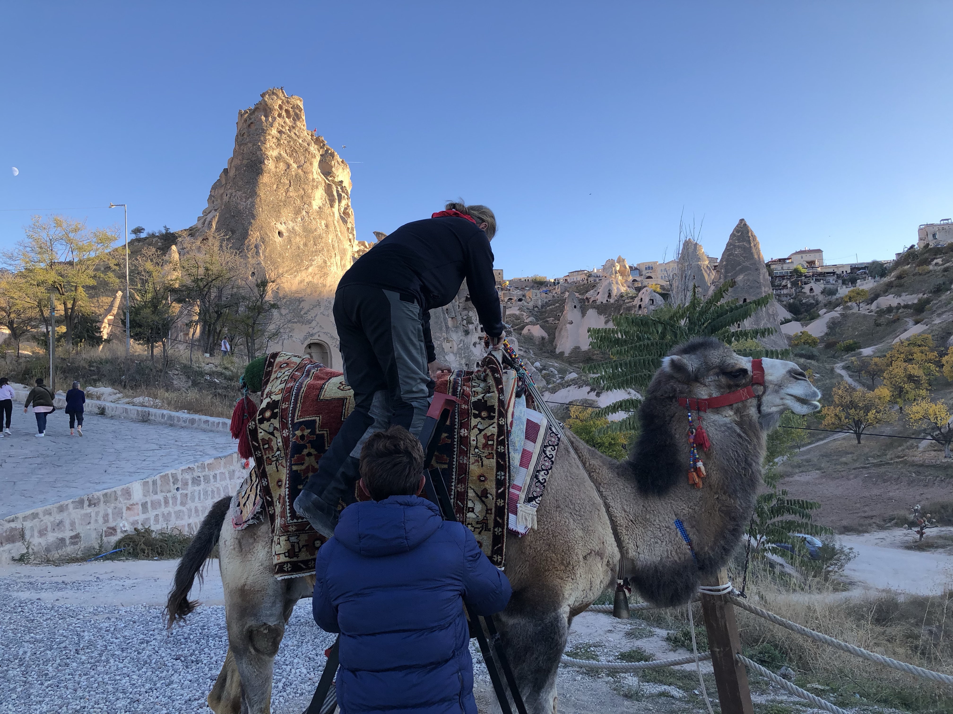 Und geendet hat der Tag auch ganz speziell, zumindest für mich. Ich hatte nämlich gelesen, dass man hier auf Kamelen reiten kann. Das wollte ich ausprobieren. Bei der Rückfahrt von Kaymakli mussten wir nochmals durch Uchisar. Die Szenerie des Burgfelsens der sich in der Mitte der Stadt erhebt, erinnerte mich stark an das berühmte Bild von Hieronymus Bosch, der Turmbau zu Babel. Das Foto wollte ich noch schiessen. Und dann stand es da, gleich neben dem Parkplatz, das prächtigste Kamel, das ich jemals gesehen hatte. Ich durfte das weiche Fell angreifen und mit seinen langen Wimpern zwinkerte es mir zu. Also kletterte ich auf der Leiter auf den Höcker und machte eine kleine Runde dort am Platz. Der Felsen von Uchisar in der Abendsonne im Hintergrund, war mir irgendwie in dem Moment ziemlich egal. Ich hatte mein kleines Abenteuer mit einem Wüstenschiff unterwegs zu sein. Mein super Abschluss für einen spektakulären Tag.