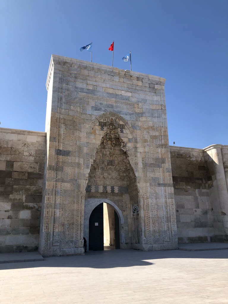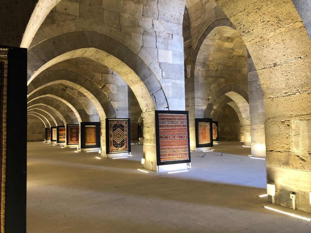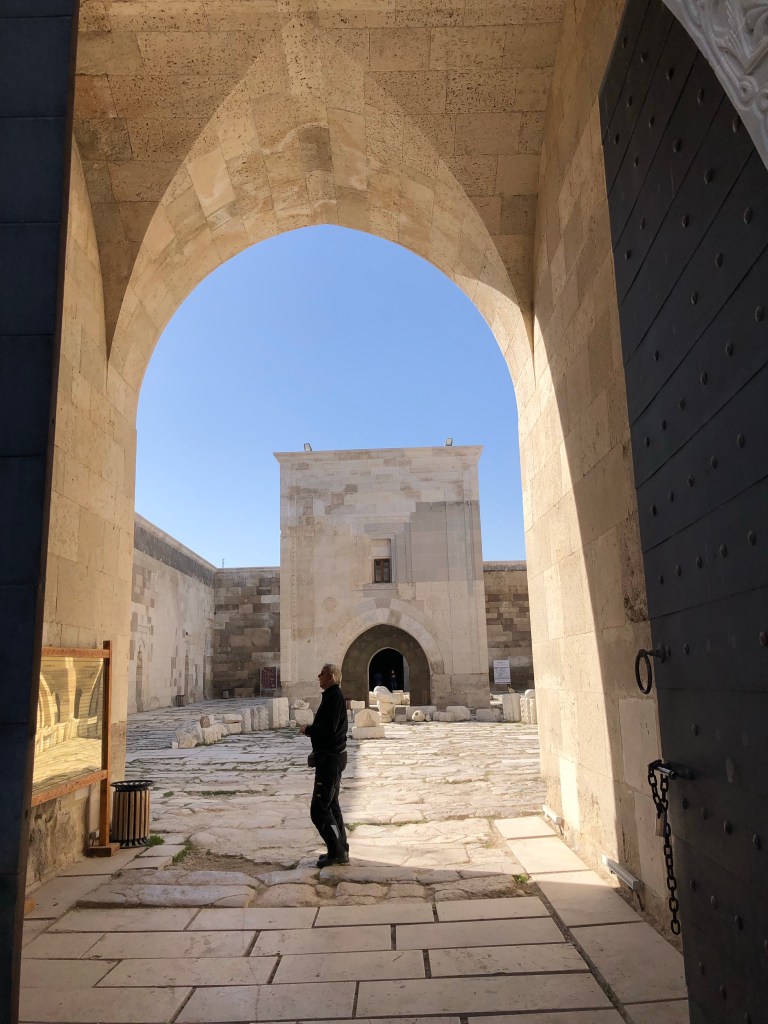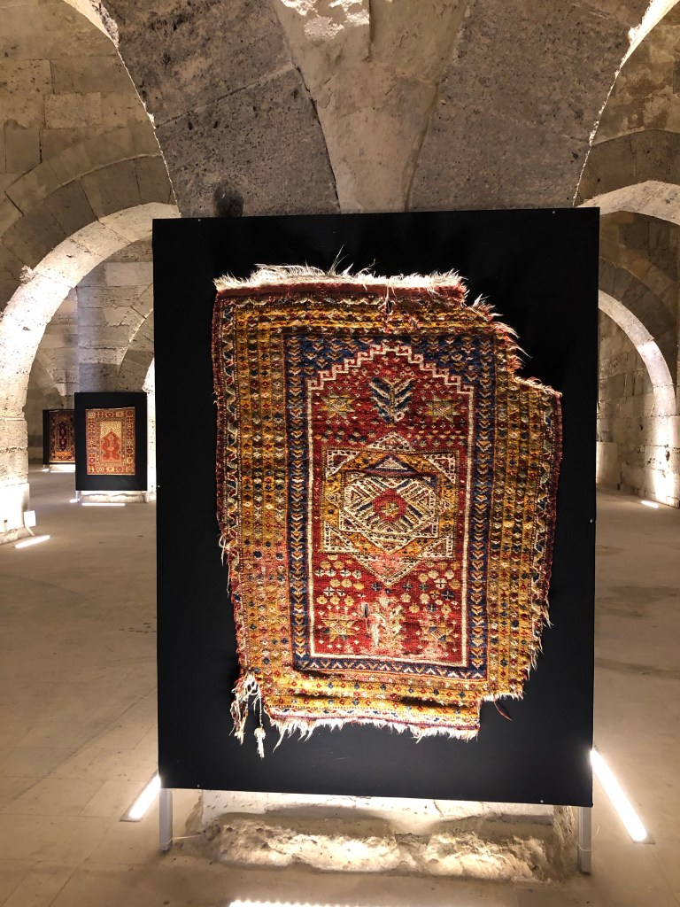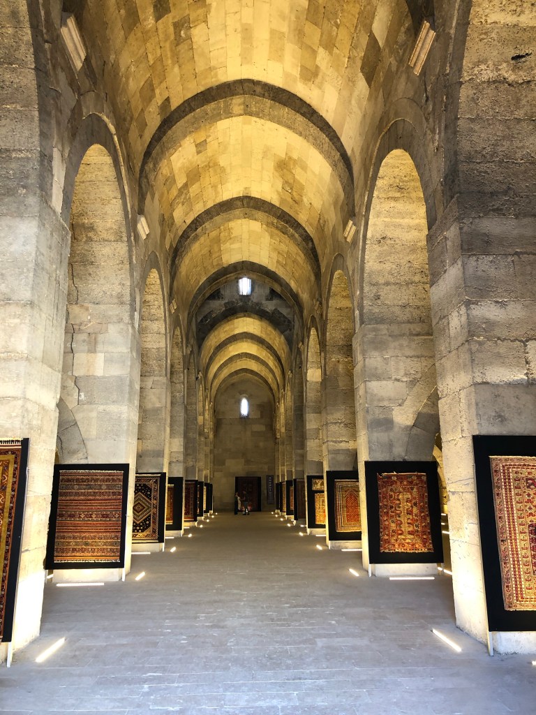 Unsere Reiseroute von A nach B führte von Göreme nach Beysehir vorbei an Konya. Diese ganze Region war vor hunderten von Jahren durchzogen von Handelswegen. Nachdem die Seldschuken im 11. Jahrhundert weite Teile Anatoliens erobert hatten, wurde auch deren Architektur übernommen, Karawansereien entstanden für die Reisenden. Die Bauten waren burgartige Anlagen mit dicken Mauern und boten Schutz, Schlafmöglichkeiten, Unterstände für die Tiere, Warenlager und Verpflegung an. Die Sultanhani Han oder Karawanserei von 1229 lag an der historischen Seidenstraße und wurde schnell zur größten Anlage in Kleinasien. Eigentlich hatten wir die Besichtigung nicht eingeplant, aber da eine Pause sowieso nötig war, machten wir halt. Und es hat sich gelohnt in der Vorstellung in die Geschichte der Handelsreisenden von damals einzutauchen, sich vorzustellen, hier anzukommen und Zwischenstation zu machen. Lohnenswert war auch die anatolische Teppichausstellung in der 15 m hohen Winterhalle. Färbemethoden mit natürlichen Farbstoffen und eine kurze Einführung in die Bildsprache der Muster war interessant. Ich muss zuhause gleich schauen, was mir unsere Teppiche für Geschichten erzählen. Am liebsten hätte ich ein paar Teppich-Exemplare mitgenommen.