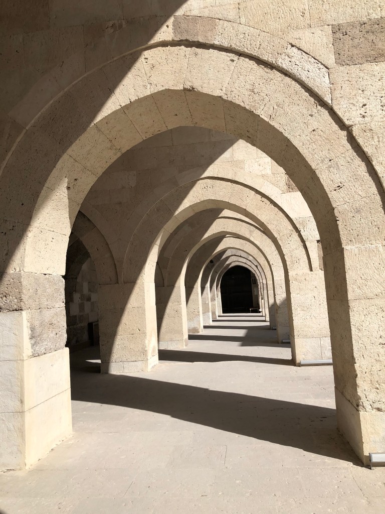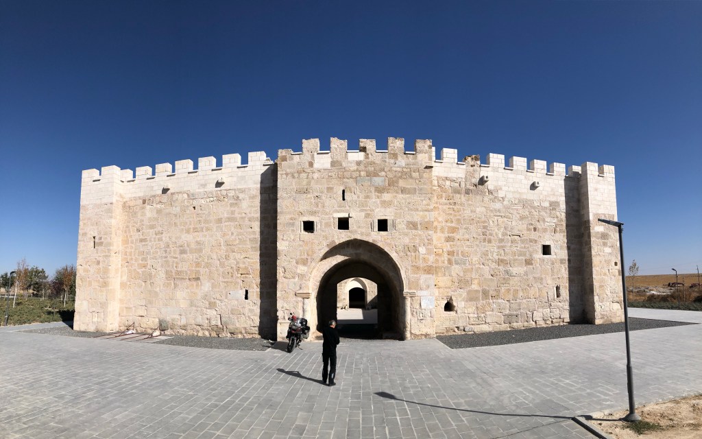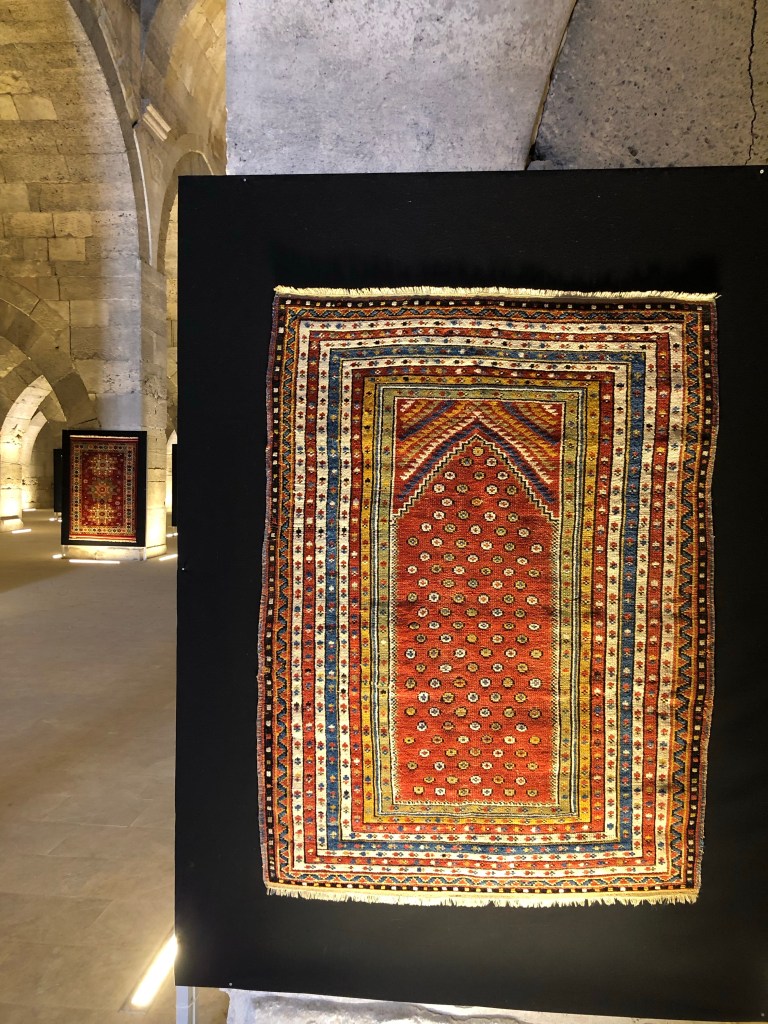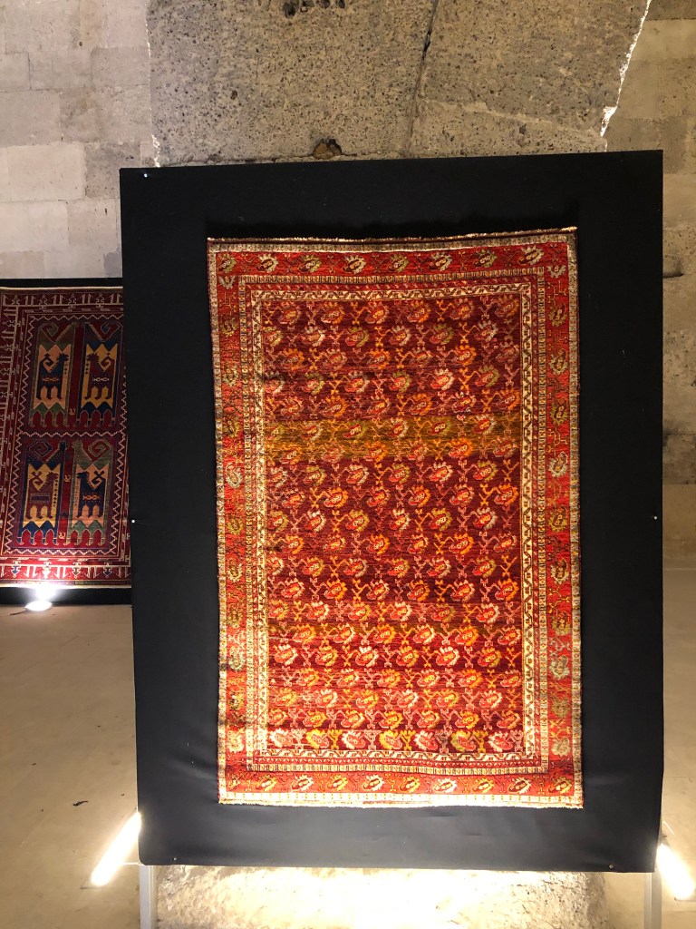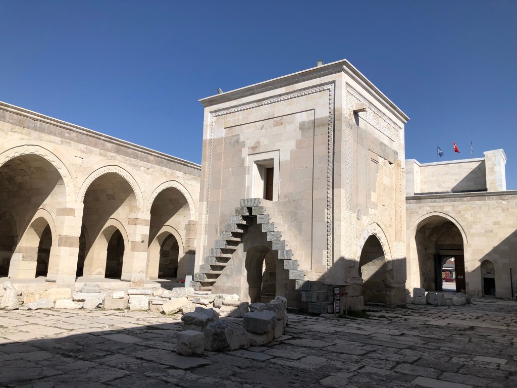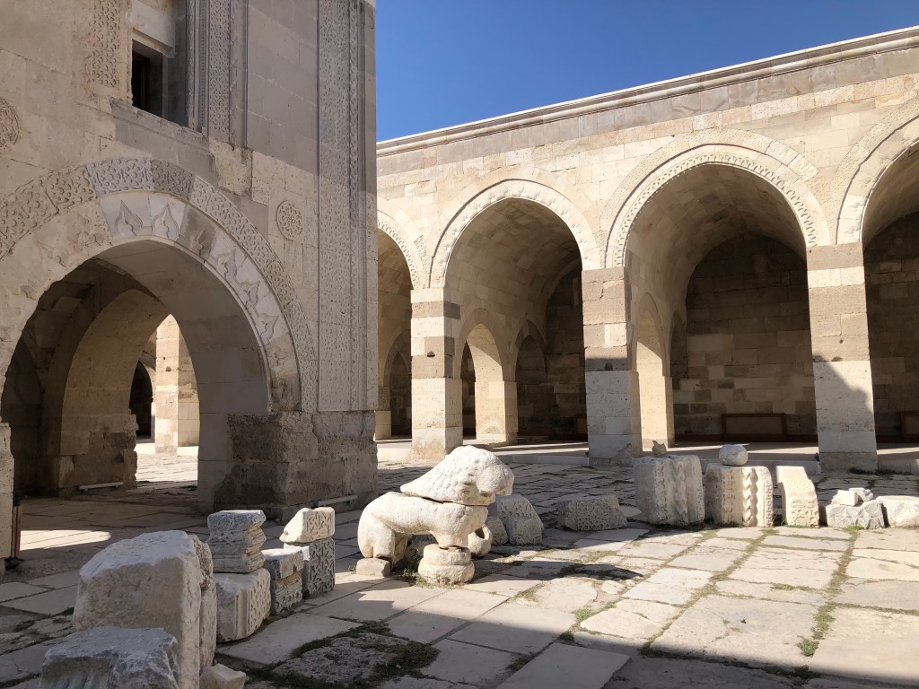 Unsere Reiseroute von A nach B führte von Göreme nach Beysehir vorbei an Konya. Diese ganze Region war vor hunderten von Jahren durchzogen von Handelswegen. Nachdem die Seldschuken im 11. Jahrhundert weite Teile Anatoliens erobert hatten, wurde auch deren Architektur übernommen, Karawansereien entstanden für die Reisenden. Die Bauten waren burgartige Anlagen mit dicken Mauern und boten Schutz, Schlafmöglichkeiten, Unterstände für die Tiere, Warenlager und Verpflegung an. Die Sultanhani Han oder Karawanserei von 1229 lag an der historischen Seidenstraße und wurde schnell zur größten Anlage in Kleinasien. Eigentlich hatten wir die Besichtigung nicht eingeplant, aber da eine Pause sowieso nötig war, machten wir halt. Und es hat sich gelohnt in der Vorstellung in die Geschichte der Handelsreisenden von damals einzutauchen, sich vorzustellen, hier anzukommen und Zwischenstation zu machen. Lohnenswert war auch die anatolische Teppichausstellung in der 15 m hohen Winterhalle. Färbemethoden mit natürlichen Farbstoffen und eine kurze Einführung in die Bildsprache der Muster war interessant. Ich muss zuhause gleich schauen, was mir unsere Teppiche für Geschichten erzählen. Am liebsten hätte ich ein paar Teppich-Exemplare mitgenommen.