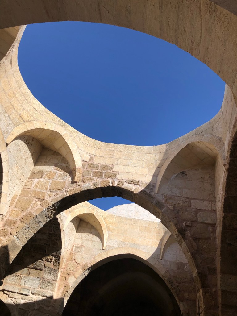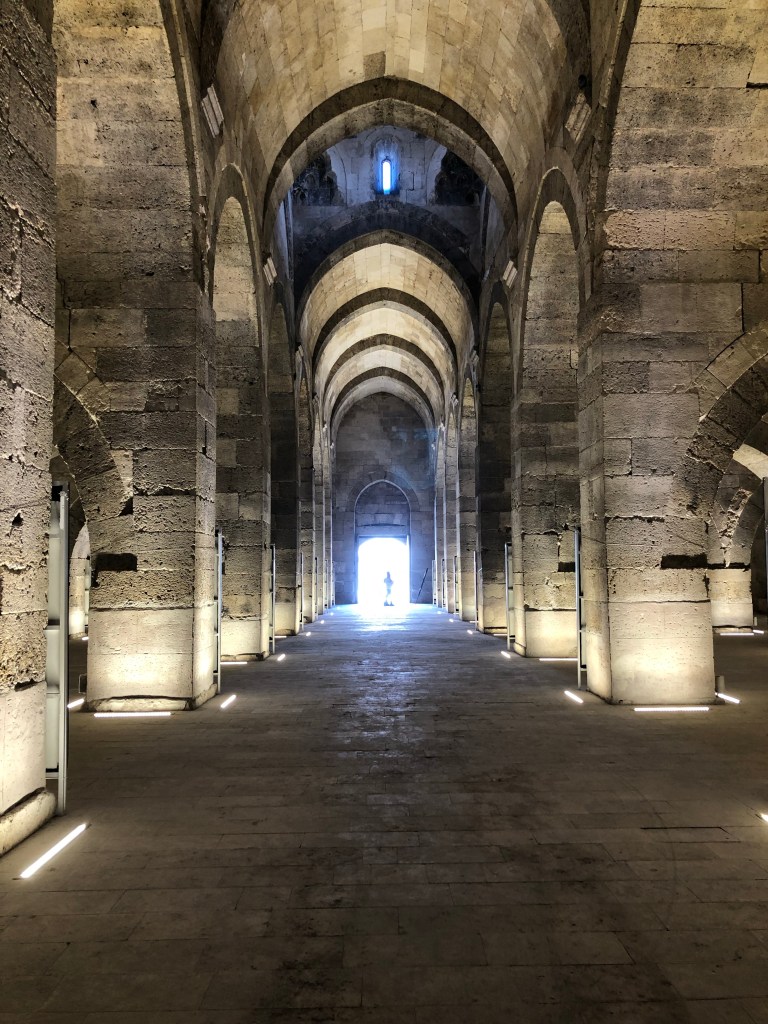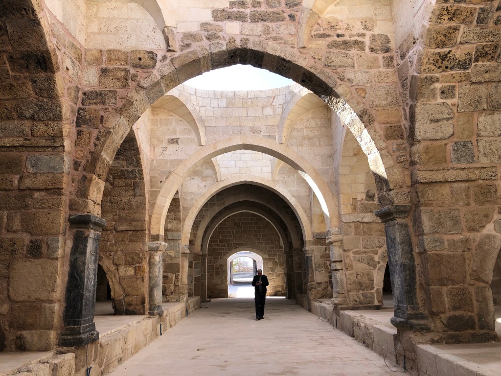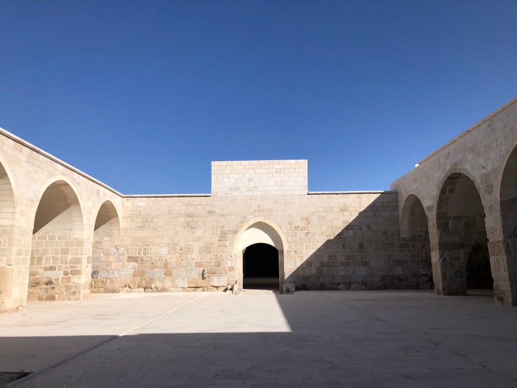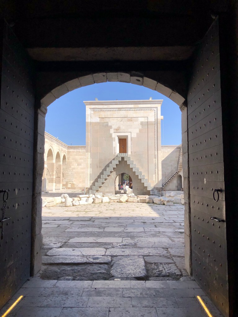 Unsere Reiseroute von A nach B führte von Göreme nach Beysehir vorbei an Konya. Diese ganze Region war vor hunderten von Jahren durchzogen von Handelswegen. Nachdem die Seldschuken im 11. Jahrhundert weite Teile Anatoliens erobert hatten, wurde auch deren Architektur übernommen, Karawansereien entstanden für die Reisenden. Die Bauten waren burgartige Anlagen mit dicken Mauern und boten Schutz, Schlafmöglichkeiten, Unterstände für die Tiere, Warenlager und Verpflegung an. Die Sultanhani Han oder Karawanserei von 1229 lag an der historischen Seidenstraße und wurde schnell zur größten Anlage in Kleinasien. Eigentlich hatten wir die Besichtigung nicht eingeplant, aber da eine Pause sowieso nötig war, machten wir halt. Und es hat sich gelohnt in der Vorstellung in die Geschichte der Handelsreisenden von damals einzutauchen, sich vorzustellen, hier anzukommen und Zwischenstation zu machen. Lohnenswert war auch die anatolische Teppichausstellung in der 15 m hohen Winterhalle. Färbemethoden mit natürlichen Farbstoffen und eine kurze Einführung in die Bildsprache der Muster war interessant. Ich muss zuhause gleich schauen, was mir unsere Teppiche für Geschichten erzählen. Am liebsten hätte ich ein paar Teppich-Exemplare mitgenommen.