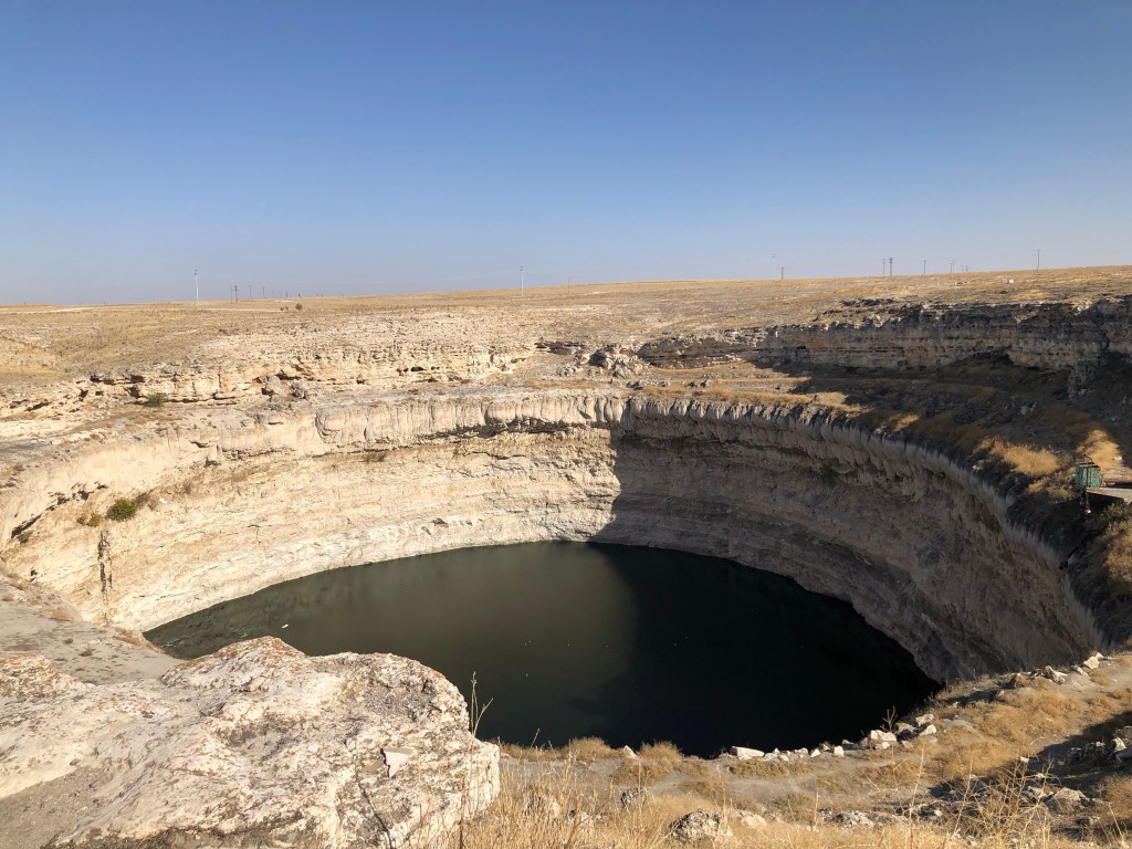 Unweit von Sultanhani, zweigte eine Straße in die trockene Landschaft ab. Obruk Han, eine weitere Karawanserei direkt bei einer Doline (obruk = türkisch Doline) gelegen, war unser nächstes Ziel. Bei den Recherchen war zwar geschrieben, dass Obruk Han im Moment wegen Baufälligkeit nicht zugänglich sei. Wegen der 800-Jahrfeierlichkeiten, wurden die Renovierungen vorangetrieben und das ganze Areal Han und die Moschee sind bereits ziemlich fertig. Interessant war hier natürlich die Doline hinter dem Bauwerk. Bautechnisch wurden bei dieser Anlage viele Materialien aus griechisch-römischer Zeit und christlichen Bauten verwendet. Irgendwo hab ich gelesen, dass Obruk Han relativ schnell gebaut wurde. Da wäre es nur verständlich, dass so alles was verfügbar war verwendet wurde.