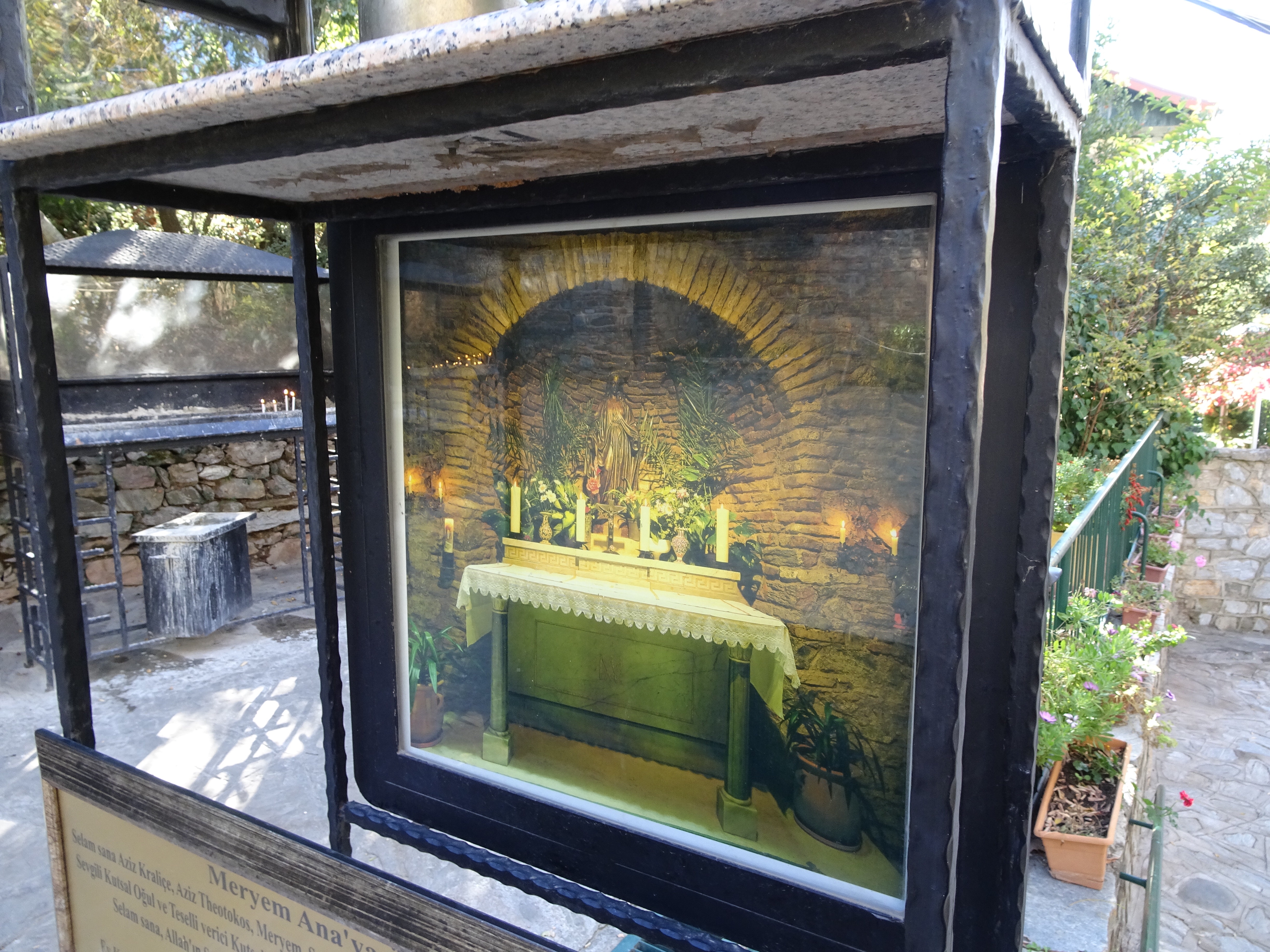 Ich war gespannt, wie sich der Ort anfühlt, wo tatsächlich die Mutter von Jesus Christus gelebt haben soll. Maria ist doch die „Urmutter der Christenheit“, fühlt man die Aura dieser Person? Ist es ein Kraftplatz? Unscheinbar ist das Haus, das heute zu einer Kapelle umgestaltet ist. Wir standen ziemlich alleine andächtig vor dem mit einer Marienstatue aus dem 20. Jahrhundert geschmückten Altar. Die Erwartungen an den Platz waren groß. Eine großartige Ergriffenheit blieb jedoch aus. Meines Erachtens lag es an der kitschigen Ausgestaltung, die keine Emotion aufkommen ließ. Ich hatte mir einen schlichten Ort der Ruhe erwartet, was natürlich auf Grund der Pilger unmöglich war. Trotzdem war ich froh, dass wir beim Haus der Maria waren und hier gebetet haben.