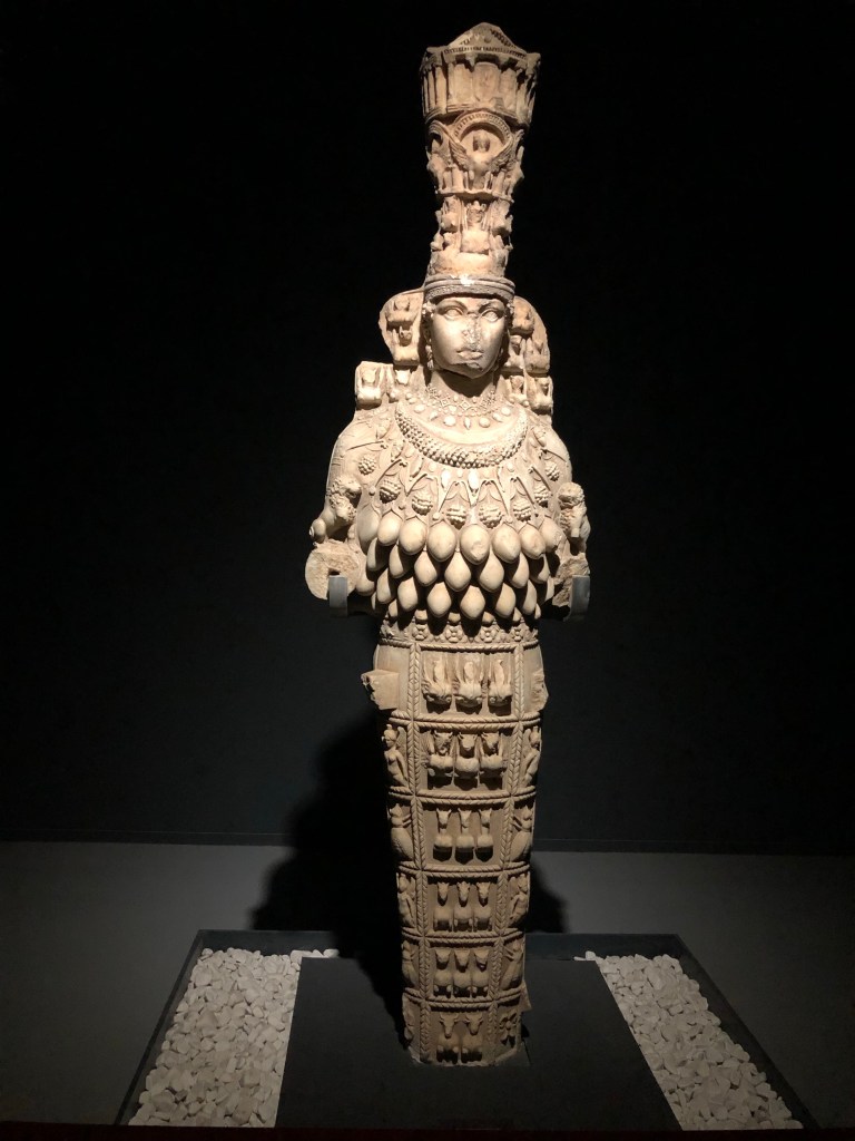Die griechische Göttin Artemis und die große anatolische Göttin Kybele wurden zusammen als Artemis von Ephesus identifiziert . Die vielbrüstige „Dame von Ephesus“, identifiziert mit Artemis, wurde im Tempel der Artemis verehrt , einem der Sieben Weltwunder und laut Pausanias das größte Bauwerk der Antike.