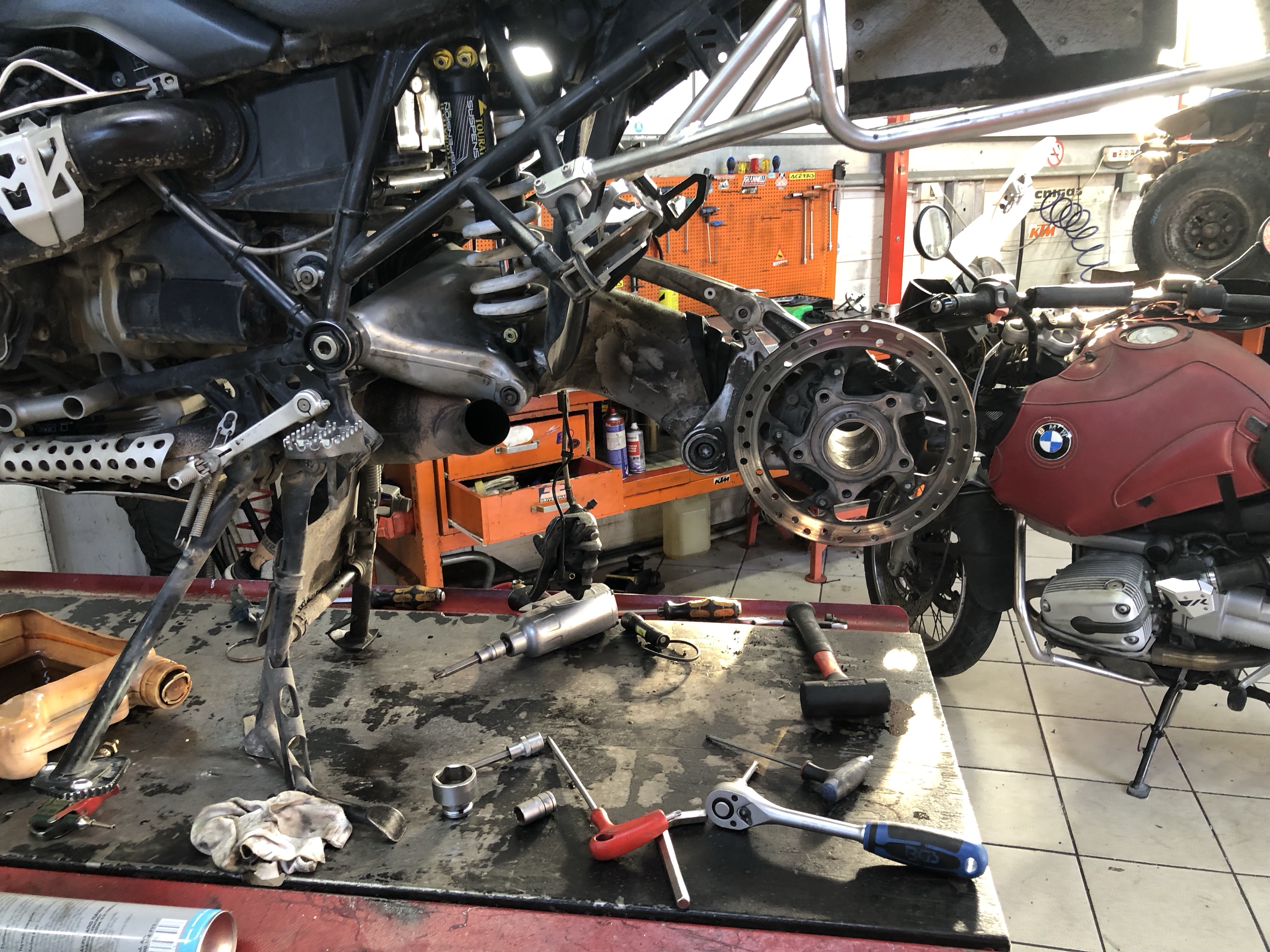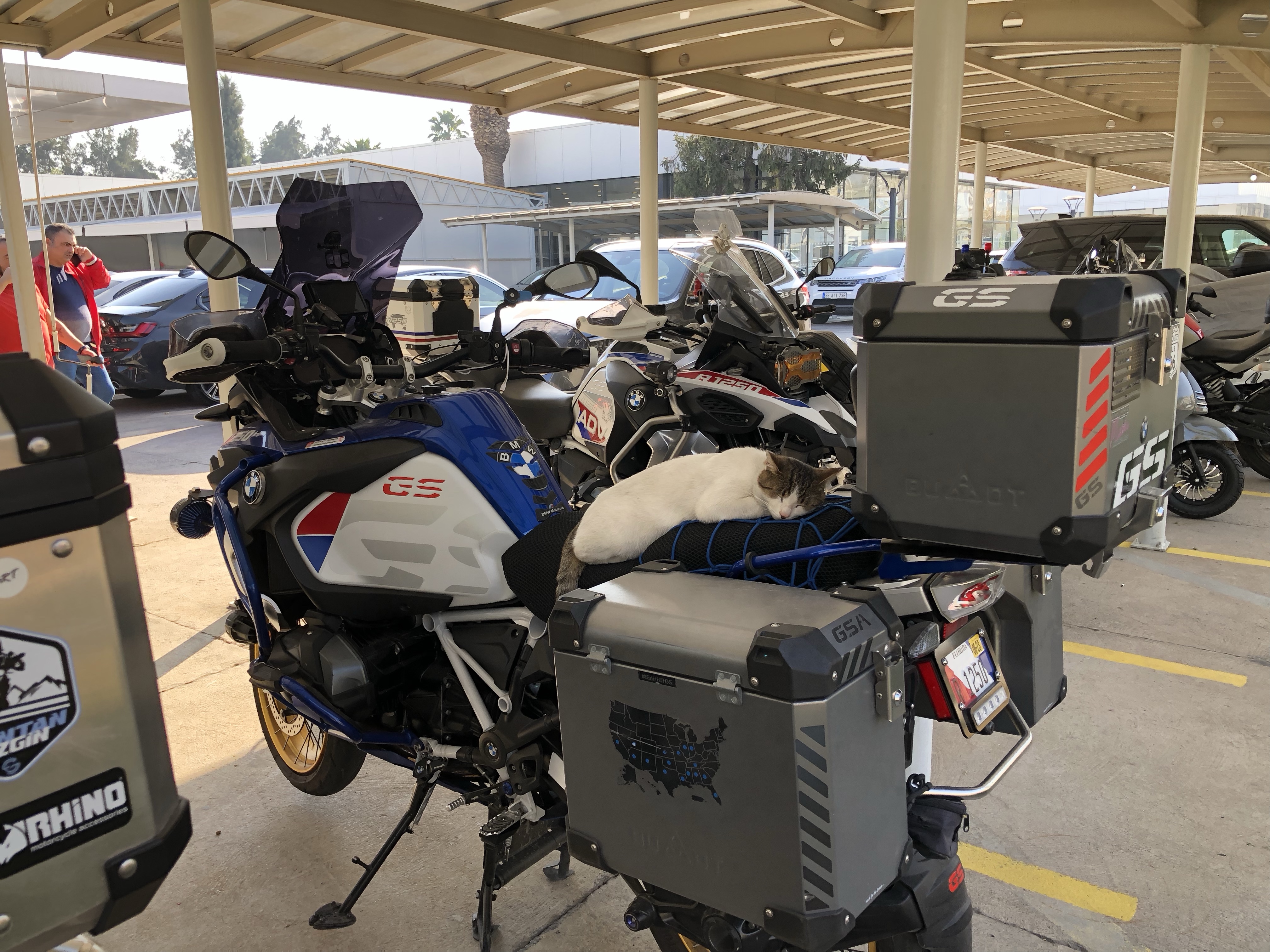 Der Abschleppservice kutschierte uns zurück nach Izmir, zu einer großen BMW Werkstatt. Die Mechaniker wussten gleich was da los war. Sie hingen an den Telefonen, um irgendwo eine passende Kardanwelle zu finden. Ein neuer Originalteil wäre 14 Tage von Deutschland in die Türkei unterwegs gewesen. 14 Tage Izmir? Nein, das war keine Option für uns. Letztendlich war eine Lösung gefunden, die den Bock wieder auf die Strasse brachte und wir wenigstens bis Österreich kommen würden. Zwei Tage lungerten wir im Hotel herum. Bei offenem Fenster toste der Verkehrslärm von den das Hotel umzingelnden Autobahnen. Wir hatten auch gar keine Lust irgendwas in der Stadt zu unternehmen. Wir plünderten den Bankomat, damit wir die Reparatur zahlen konnten. Dankbar für die Hilfe planten wir auch Trinkgeld ein. Und wie es die Ironie des Schicksals so wollte, nahmen die Mechaniker kein Trinkgeld, sondern spendeten es für das Futter für die 12 Straßenkatzen, die am BMW Gelände ihr Zuhause hatten. Das traf den NICHT-Katzenfreund Bock-Chef hart. Aber was soll´s. Der Bock war wieder fit und wir starteten einen neuerlichen Versuch zur Ausreise nach Chios. Am Hafen angekommen bemerkten wir, dass die Bremse, der Hinterreifen und die Koffer voll mit Öl bespritzt waren. Na fein, da kam Freude auf! Ein paar Fotos per WhatsApp an die Werkstatt geschickt, es war Samstag Nachmittag. Antwort kam keine mehr. Diesmal waren wir wenigstens in der glücklichen Lage, dass der Bock noch fahrtauglich war. Unsere Vermutung war, dass überschüssiges Öl von der Reparatur die Ursache war.