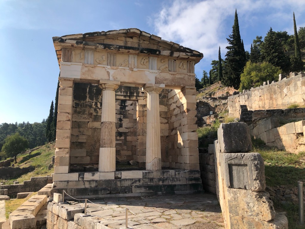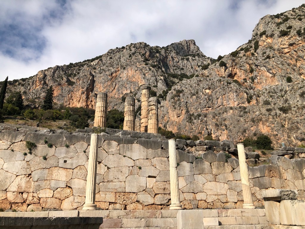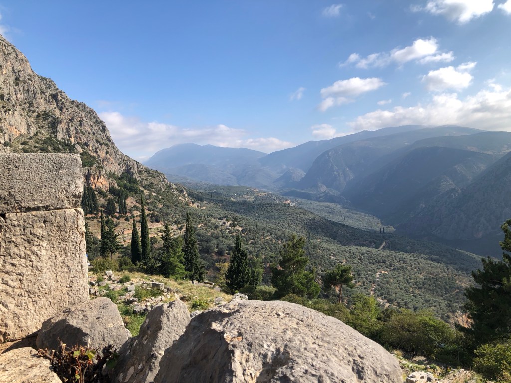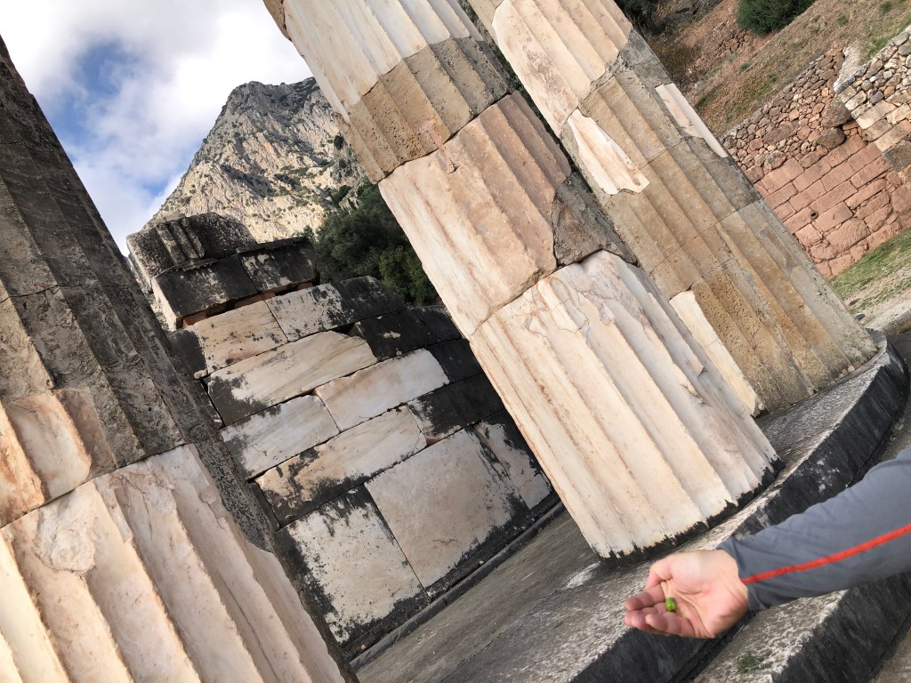 Unsere Pläne für die restlichen Tage in Griechenland mussten wir ändern, denn die kleinen Bergstraßen am Peloponnes waren vielleicht nicht das Passende für den maroden Bock. Aber Delphi lag noch am Weg nach Igoumenitsa. Das war die Idee, da könnten wir gleich das Orakel befragen und das machten wir auch. Normalerweise wurden die Orakel-Vorhersagungen für das gemeine Volk mit weißen und schwarzen Bohnen gemacht – weiß = JA, schwarz = NEIN. Mehr Antworten gab es für die einfachen Leute nicht. Bohnen hatten wir keine, aber schwarze und grüne Oliven gab es am Weg zum Tempel in Delphi. Ich mimte die hohe Priesterin und der Bock-Chef durfte seine Frage stellen, die sich natürlich um ein Motorrad drehte. Der untreue Patron wollte wissen, ob er ein (übertragenes) Neues kaufen soll. Das Orakel hat gesprochen: grüne Olive = JA. Gott sei Dank hat das der Bock nicht mitbekommen, denn wer weiß, wie er dann reagiert hätte für den Rest der Fahrt.