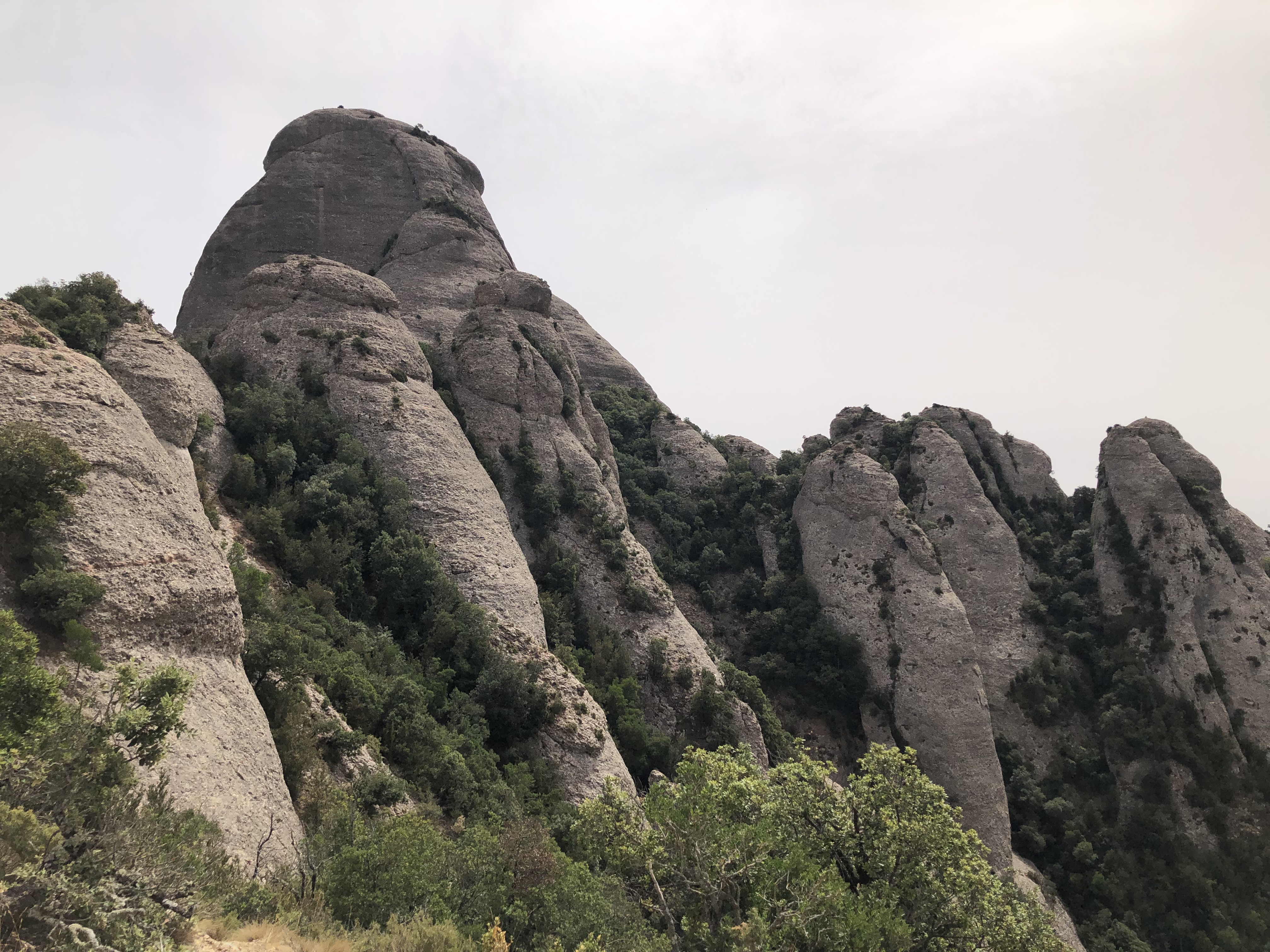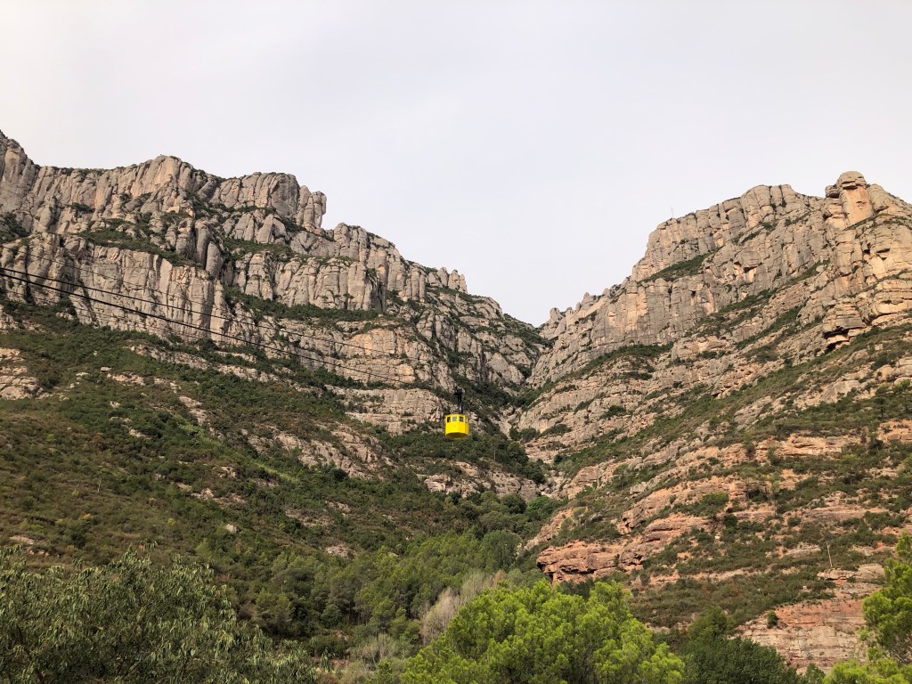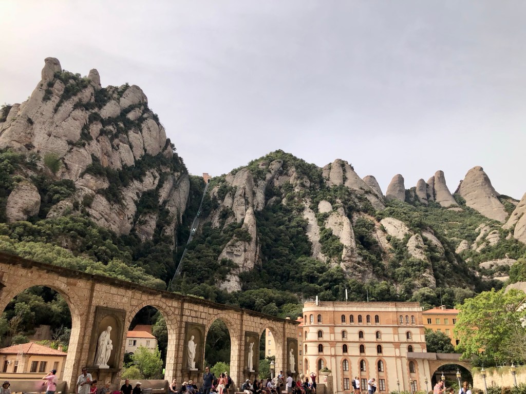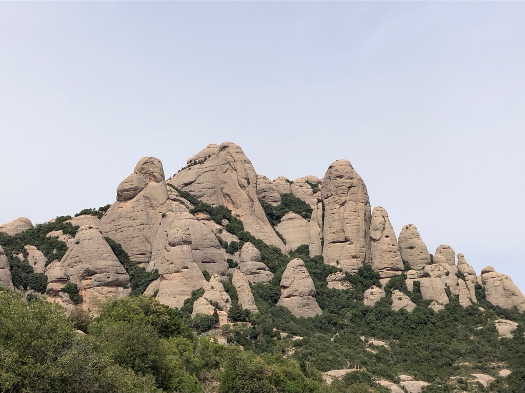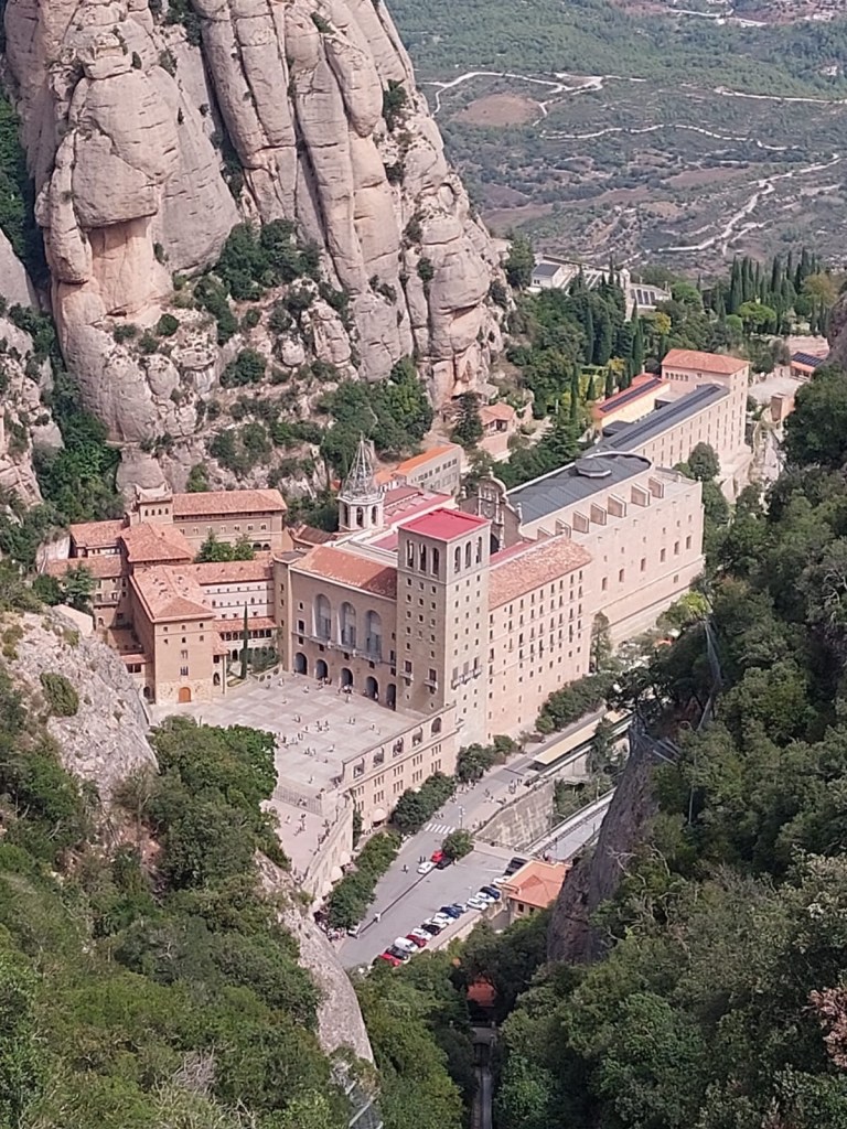 Wir machten es uns ganz bequem und quartierten uns in dem kleinen Ort Monistrol de Montserrat ein, direkt am Fusse des zersägten Berges (Deutsch) Montserrat (Spanisch). Somit sparten wir eine längere Anreise aus Barcelona. Die Seilbahn – der Aeri, war nach 3 Minuten erreicht und schon gondelten wir den Berg hoch, der riesigen monumentalen Klosteranlage Montserrat entgegen, die eingebettet zwischen zerklüfteten Felssäulen hoch oben thront. Das Gebirgsmassiv war vor 40 Millionen Jahren eine Flussmündung, wo massenhaft Geröll ins Meer gespült wurde. Zusätzlich erhielten die Bergformationen durch Wind und Regen ihre speziellen Formen. Mit Phantasie können verschiedene Motive in die Bergzacken hinein interpretiert werden. Wer genau hinsieht, kann sogar einen Elefanten erkennen.