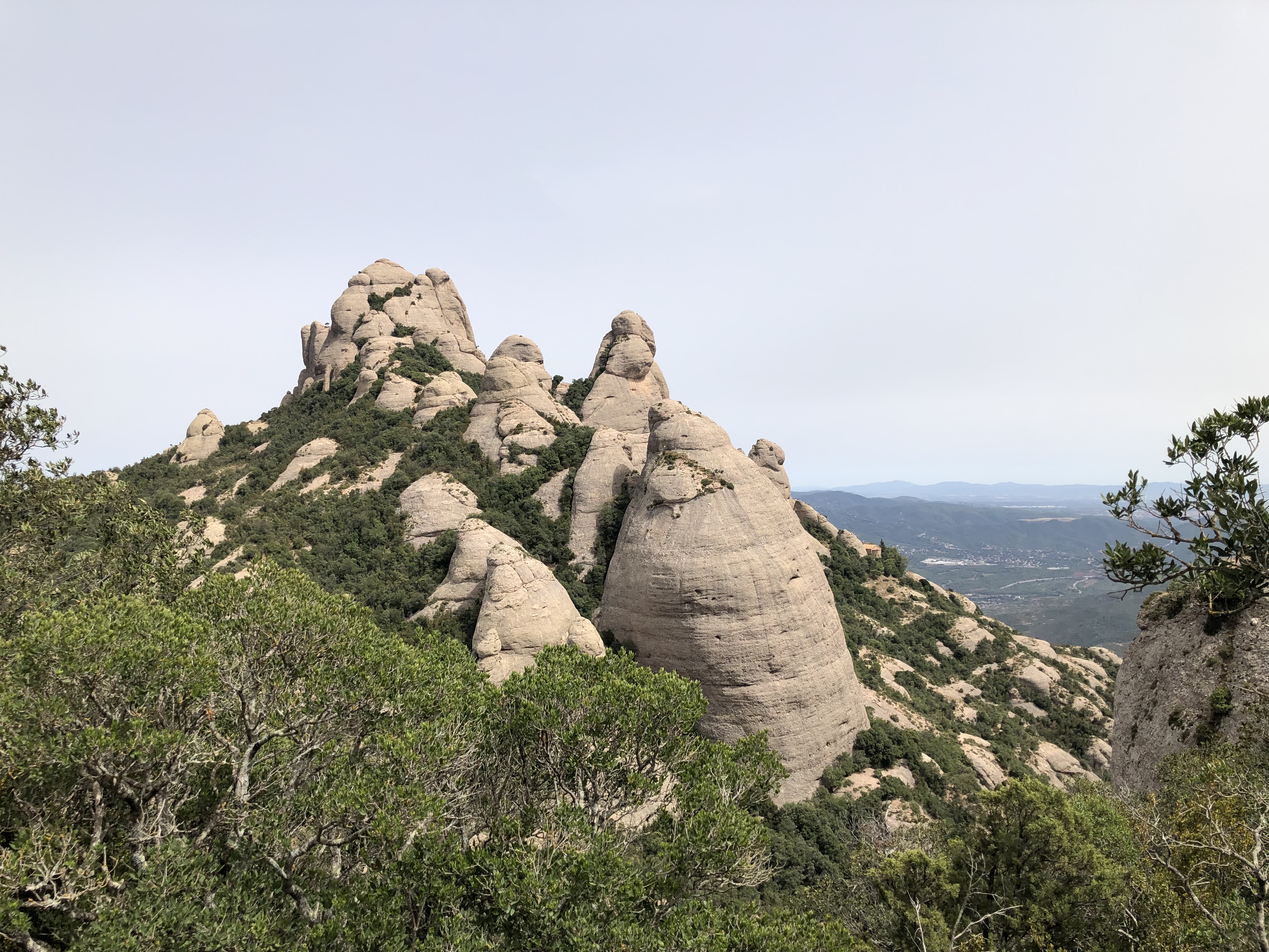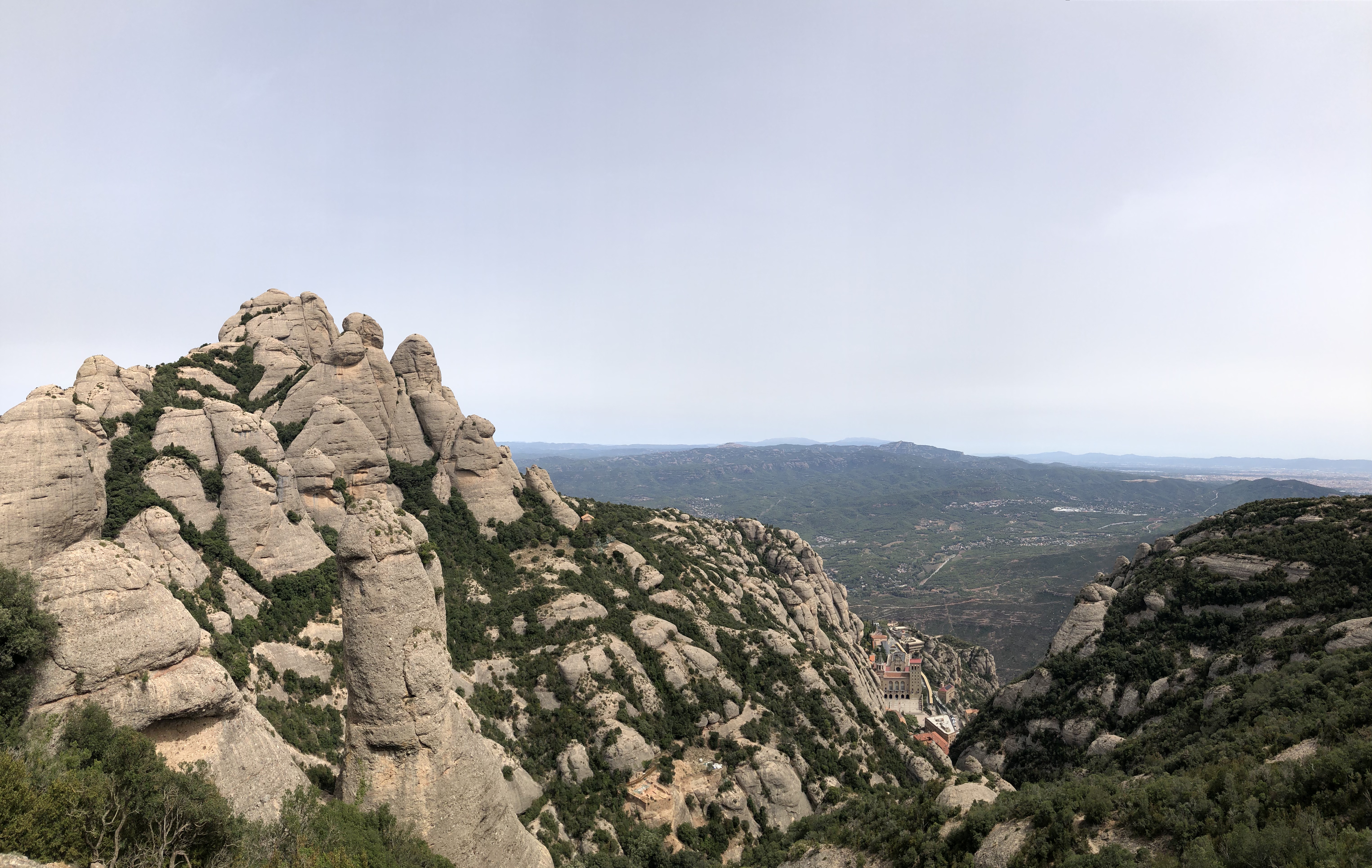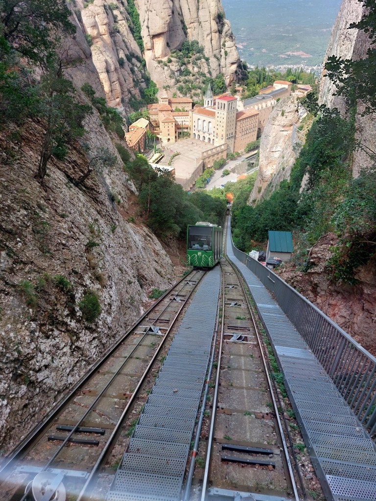 Wir machten es uns ganz bequem und quartierten uns in dem kleinen Ort Monistrol de Montserrat ein, direkt am Fusse des zersägten Berges (Deutsch) Montserrat (Spanisch). Somit sparten wir eine längere Anreise aus Barcelona. Die Seilbahn – der Aeri, war nach 3 Minuten erreicht und schon gondelten wir den Berg hoch, der riesigen monumentalen Klosteranlage Montserrat entgegen, die eingebettet zwischen zerklüfteten Felssäulen hoch oben thront. Das Gebirgsmassiv war vor 40 Millionen Jahren eine Flussmündung, wo massenhaft Geröll ins Meer gespült wurde. Zusätzlich erhielten die Bergformationen durch Wind und Regen ihre speziellen Formen. Mit Phantasie können verschiedene Motive in die Bergzacken hinein interpretiert werden. Wer genau hinsieht, kann sogar einen Elefanten erkennen.