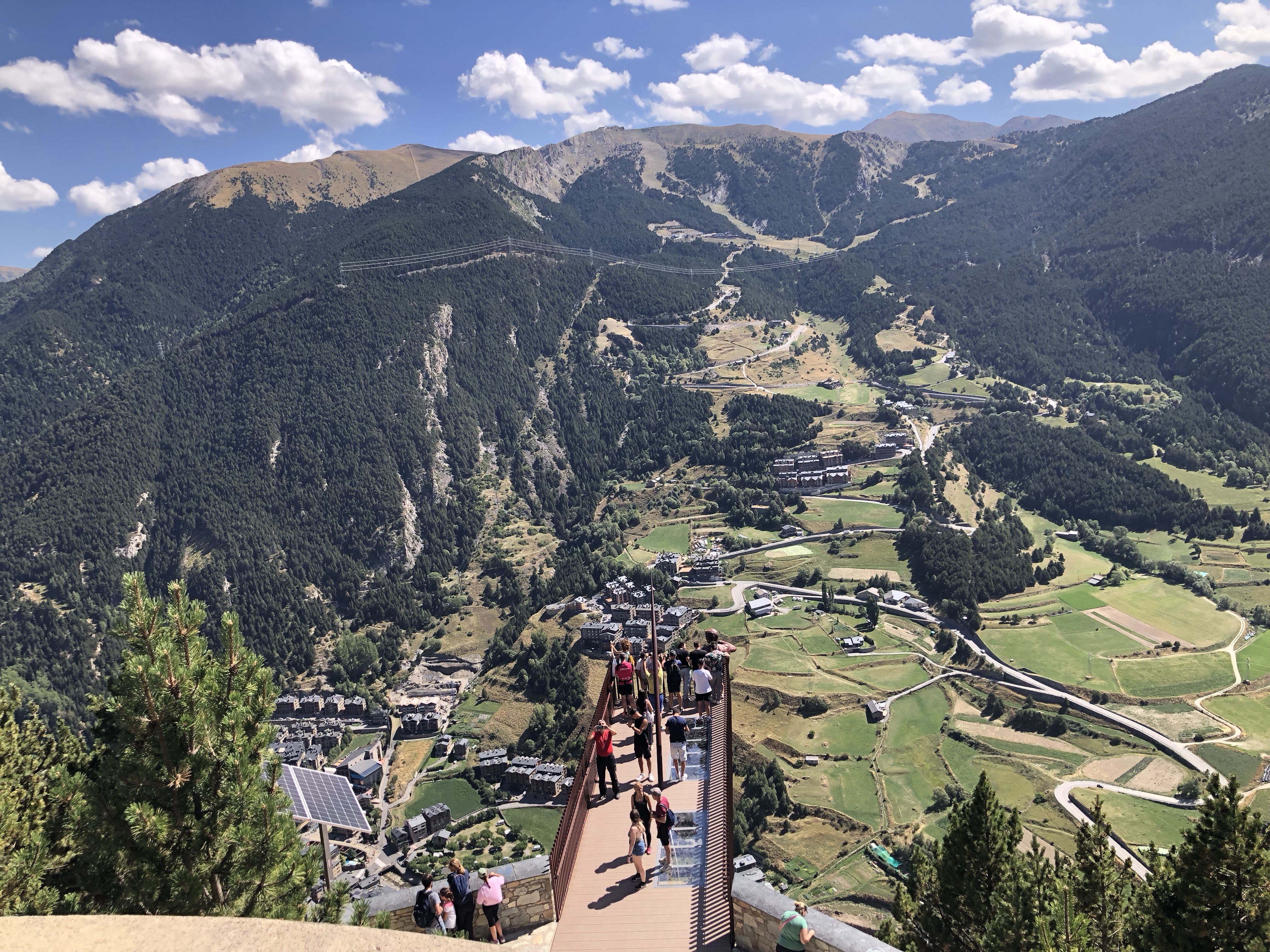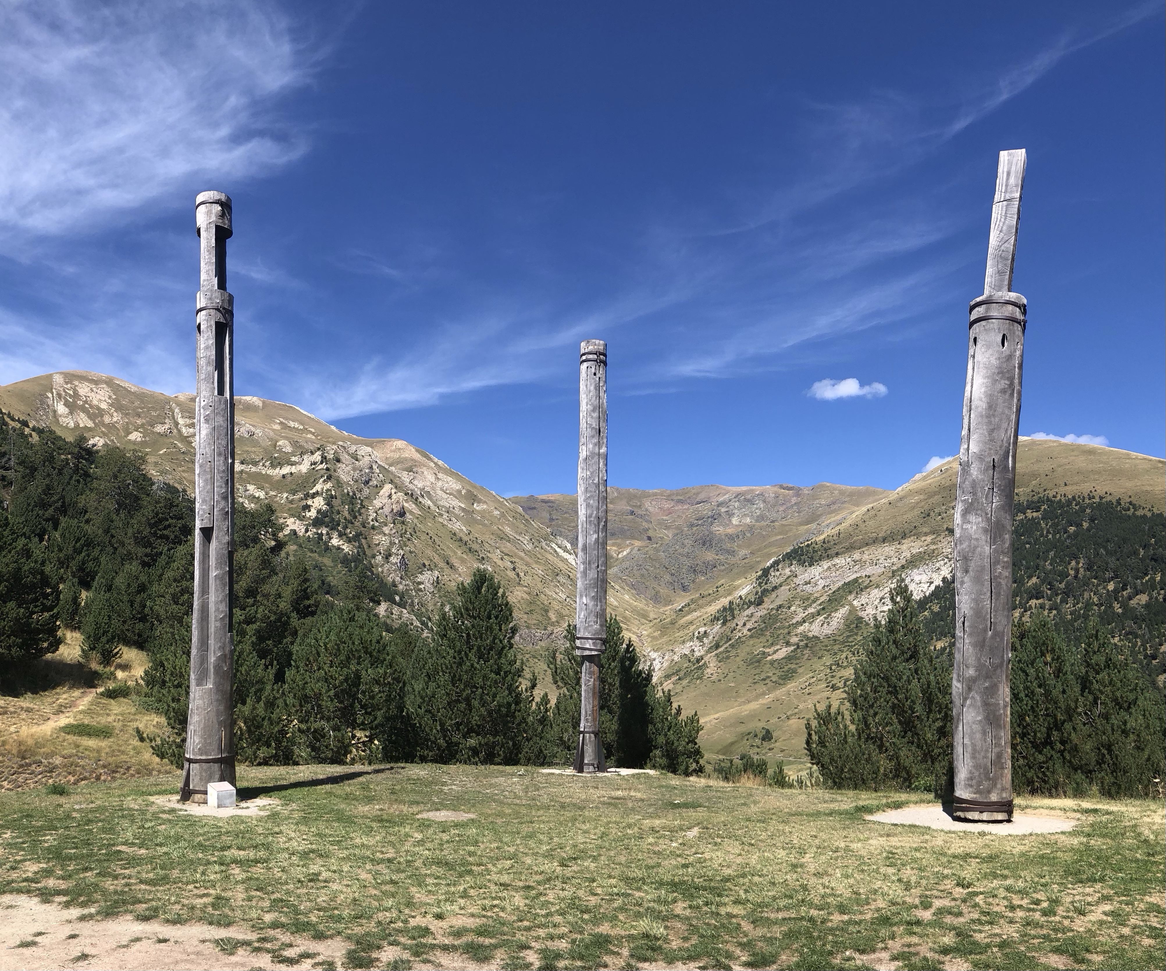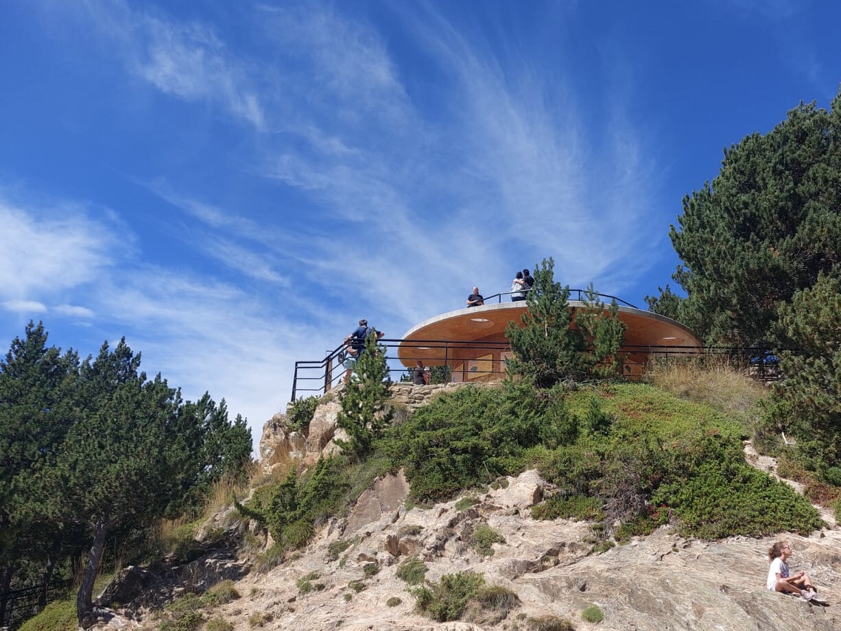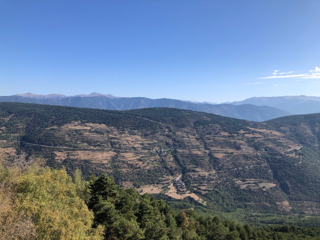 Die Einreise nach Andorra erfolgte ohne Grenzkontrolle. Dafür war das Verkehrsaufkommen etwas chaotischer. Leider gibt es in dem Tal kaum Ausweichmöglichkeiten. Erst nach Andorra la Vella, der Hauptstadt, konnten wir in die Berge rauf abzweigen. Die Straße faltet sich mit zahlreichen Spitzkehren zum Mirador Roc Del Quer hoch. Der Skywalk, der dort die vielen Sonntagsausflügler anlockt, bietet einen schönen Ausblick – eigentlich auf den ganzen Zwergstaat. Der Pflichteinkauf – ein Magnet und ein Fingerhut – wurde gleich im Cafe mit dem Baumskulpturen beim Parkplatz erledigt. Eine schöne Fahrstrecke führte noch weiter zum Coll d’Ordino auf knapp 1800 m Seehöhe. Da alle scheinbar grade beim Mittagstisch sassen, gehörte uns die Straße fast alleine. In Andorra la Vella stoppten wir noch bei einen Supermarkt, um uns mit den nötigsten Proviant für ein Picknick einzudecken. Und schon waren wir wieder über der Grenze in Spanien, in unserem Quartier im kleinen Dorf Adrall.