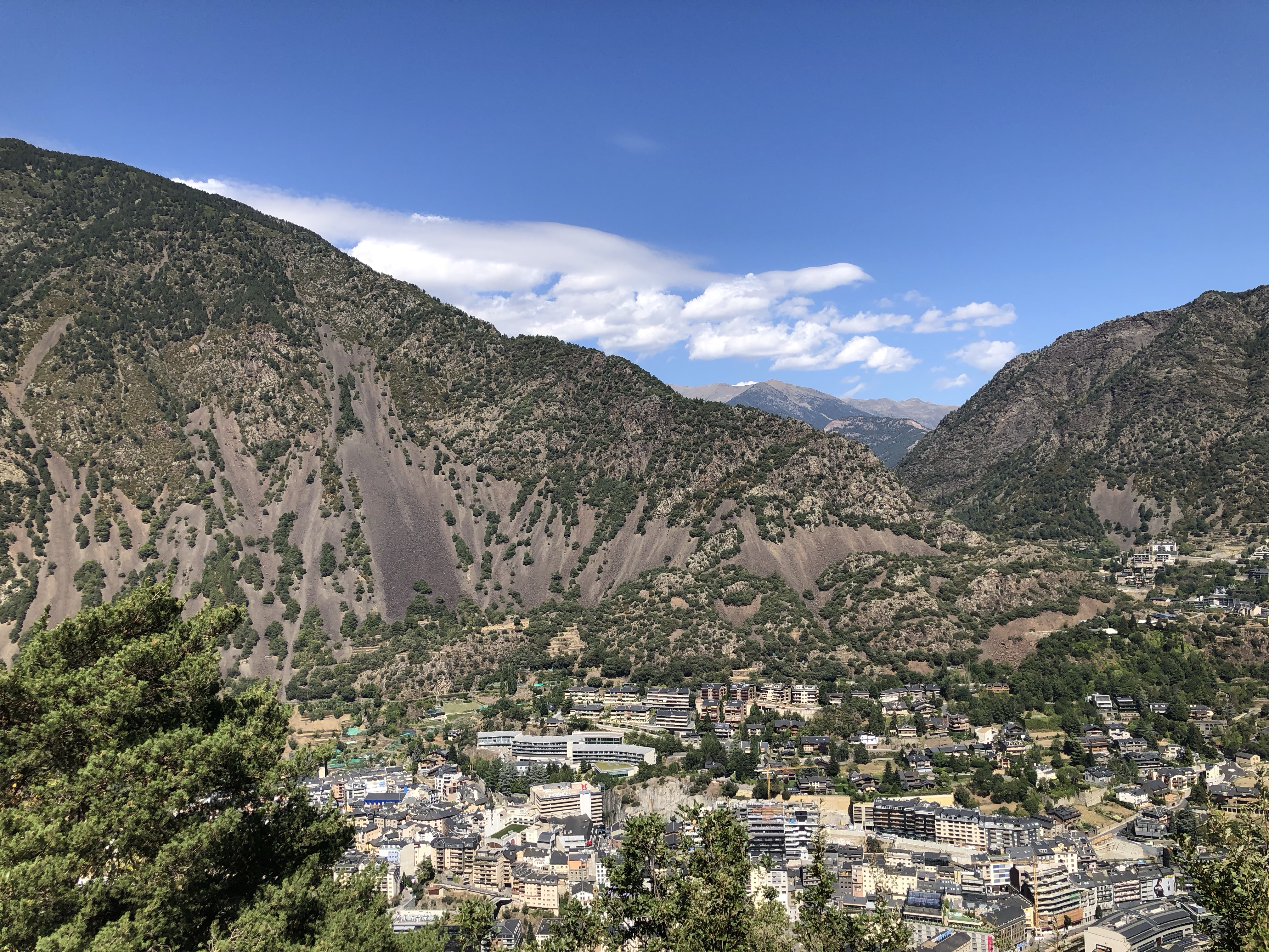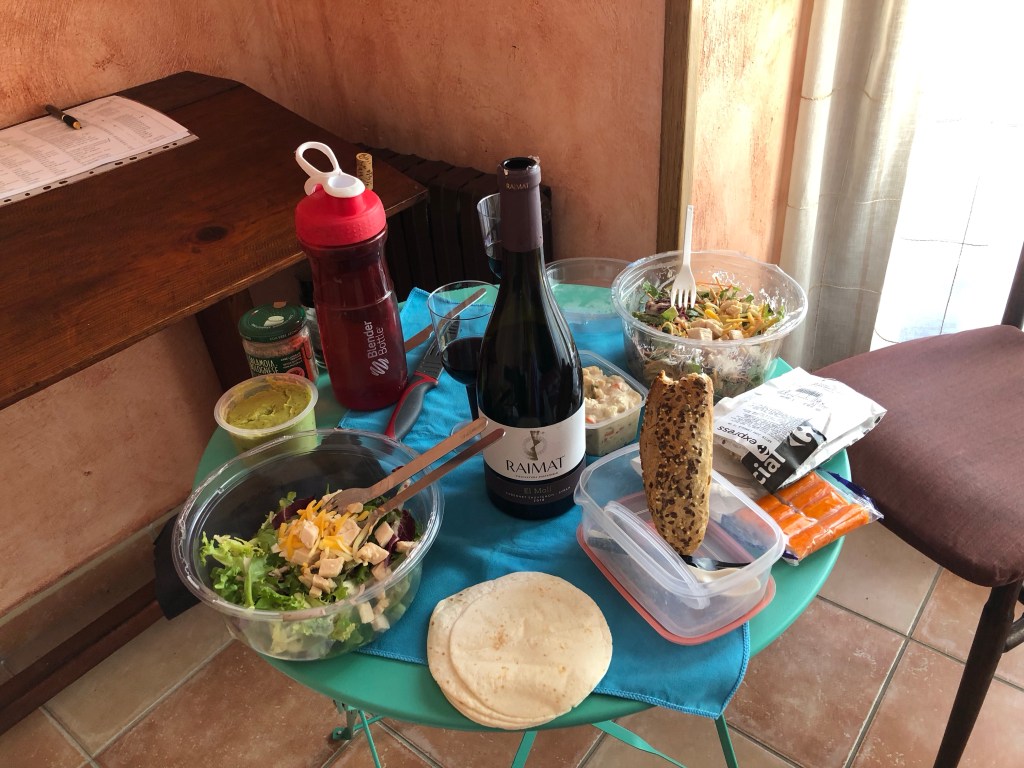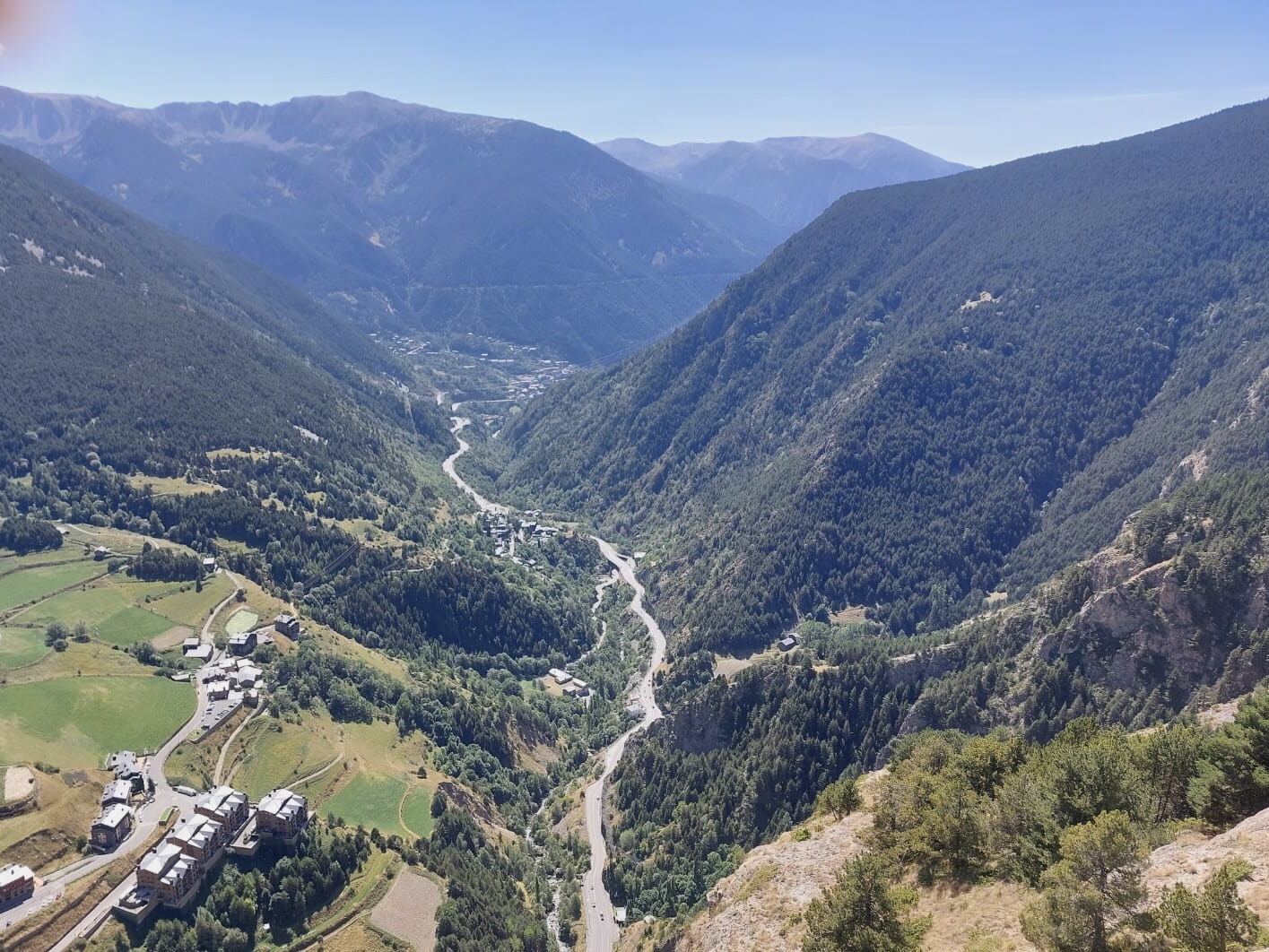 Nach diesen essenziellen Recherchen über Andorra machten wir uns über unser Picknick im kühlen Hotelzimmer her. Mangels Kühlmöglichkeit entschieden wir uns wieder für einen Rotwein. Tagestemperaturen lagen um die 31 Grad.