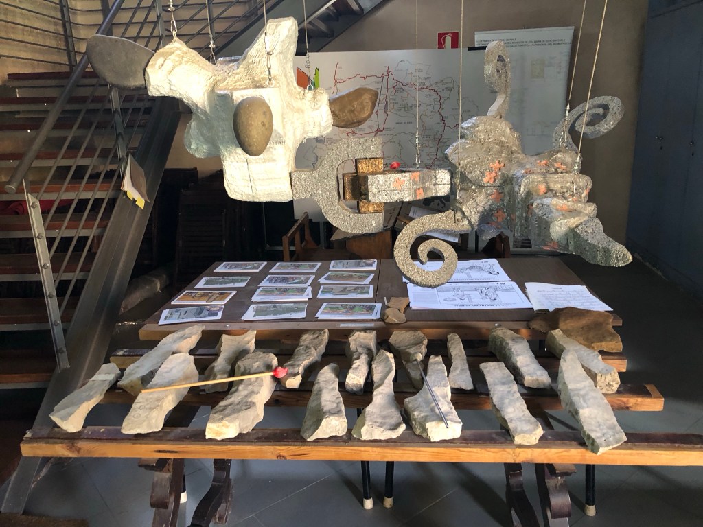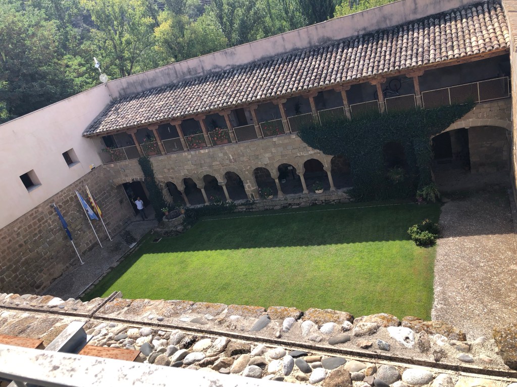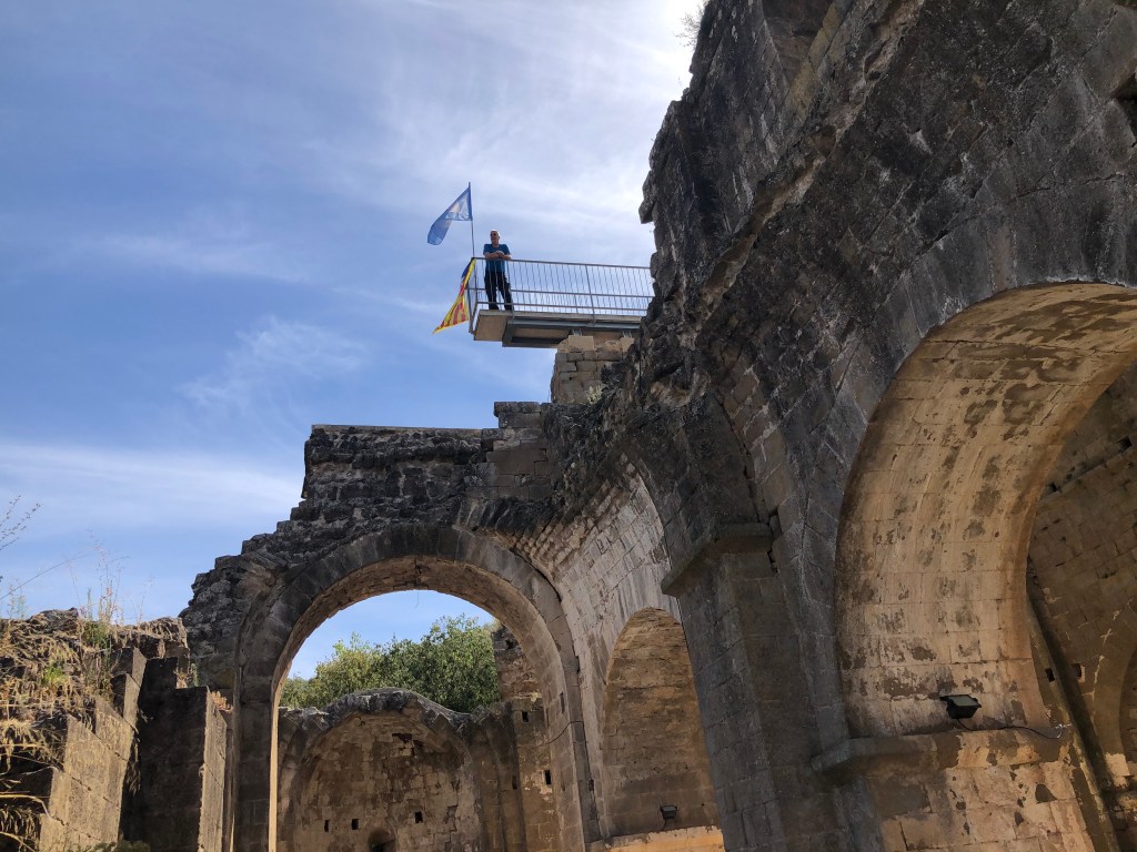 In der entlegenen Gegend im Kloster Santa Maria de Gualter freute sich der lokale Tourismusmanager im Informationsbüro über unseren Besuch. Endlich Kundschaft! Aufmerksam lauschten wir seine Ausführungen über die Klosteranlage aus dem 12. Jahrhundert. Während des spanischen Bürgerkriegs war in der Kirche ein Munitionslager der Partisanen untergebracht. Wums, ging es in die Luft und das Kirchendach flog davon, daher nur noch die Ruine. Geschickt haben sie einen Skywalk über die noch stehenden Gewölbe gebaut. Das gezeigte Werbevideo wurde von den Klängen des Donauwalzers begleitet, meiner Meinung nach völlig unpassend. Der Hüter des Tourismusbüros gab dazu folgende Begründung ab: Katalonien unterstützte im Spanischen Erbfolgekrieg 1700-1713 die Habsburger. 11.9.1714 (Nationalfeiertag der Katalanen) ergab sich das belagerte Barcelona den Franzosen und wurde dem spanischen Territorium, das unter bourbonischer Herrschaft war, eingegliedert. Die Kurzfassung: Donauwalzer = Habsburg-Treue! Etwas an den Haaren herbeigezogen, aber warum nicht.