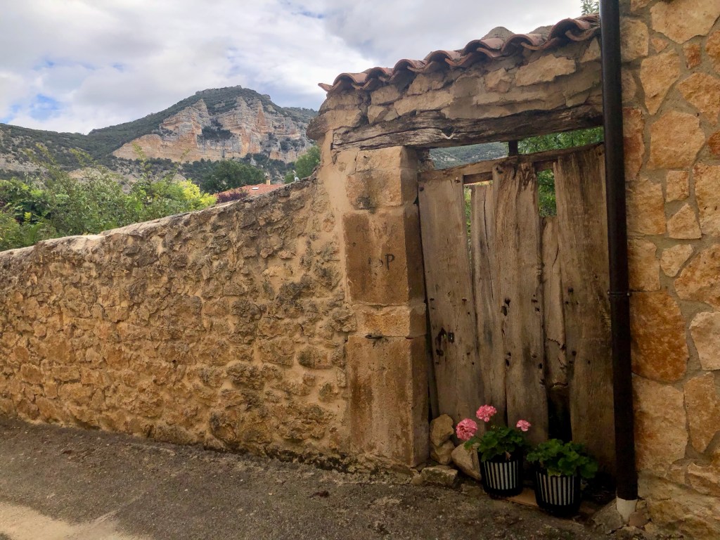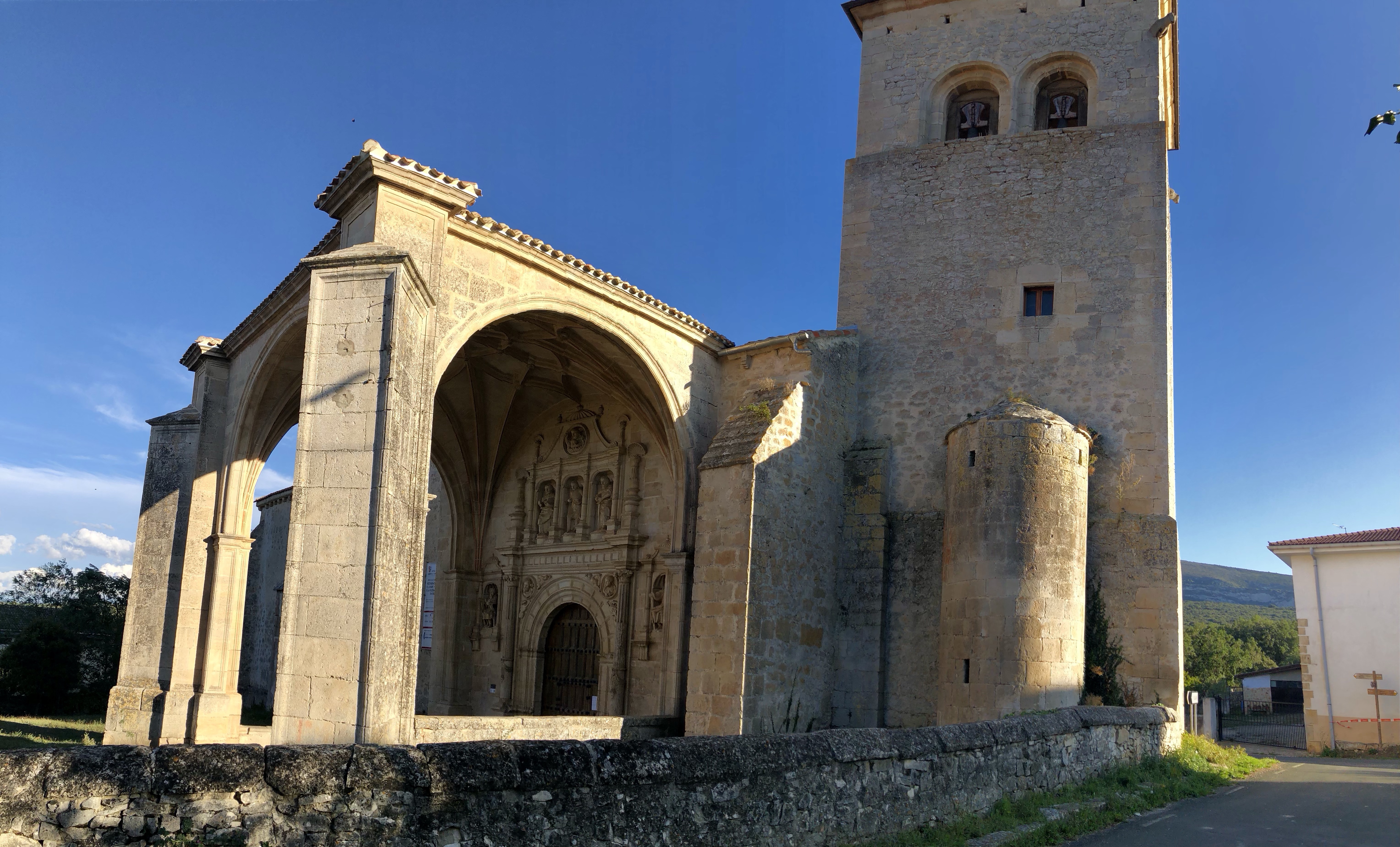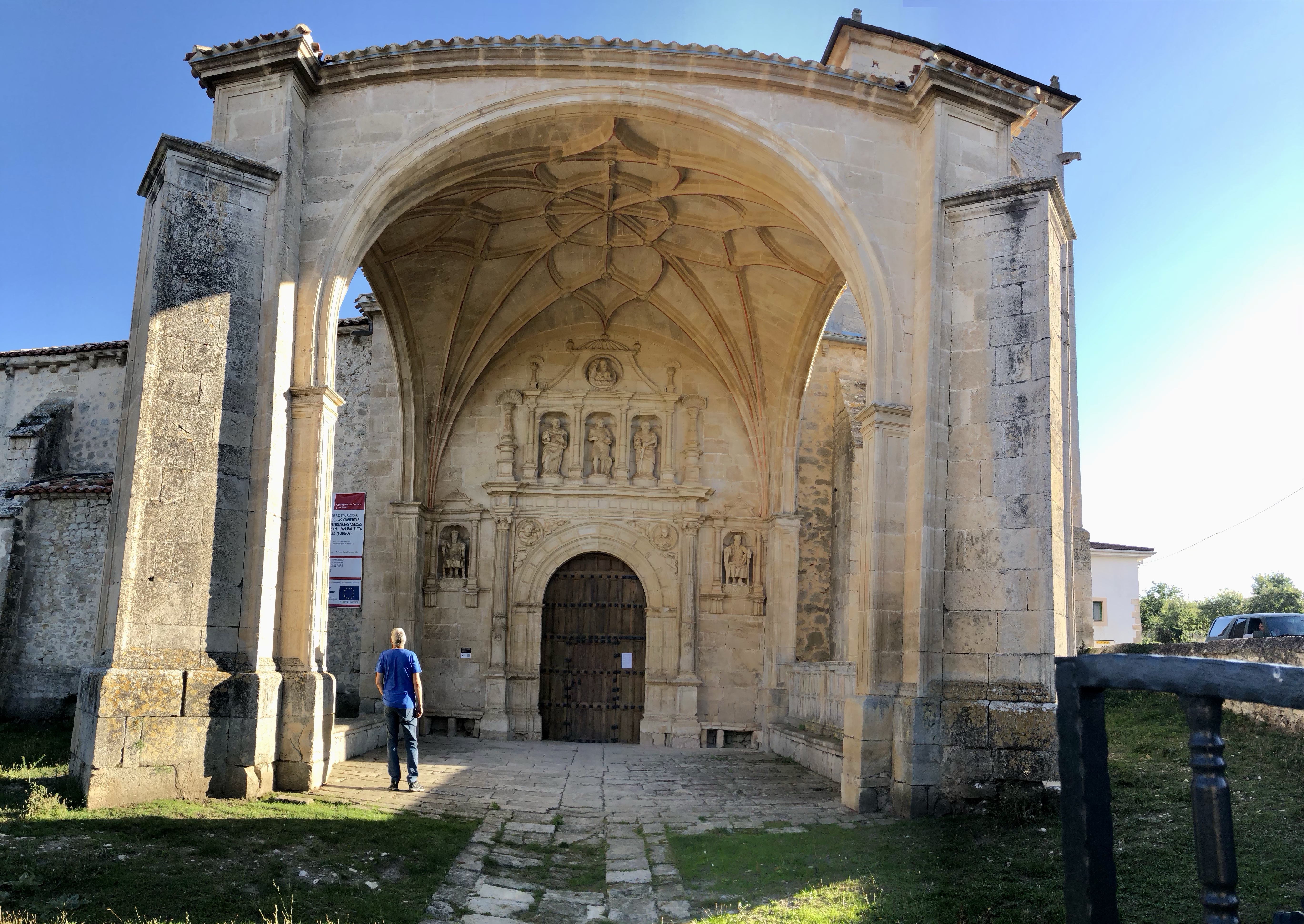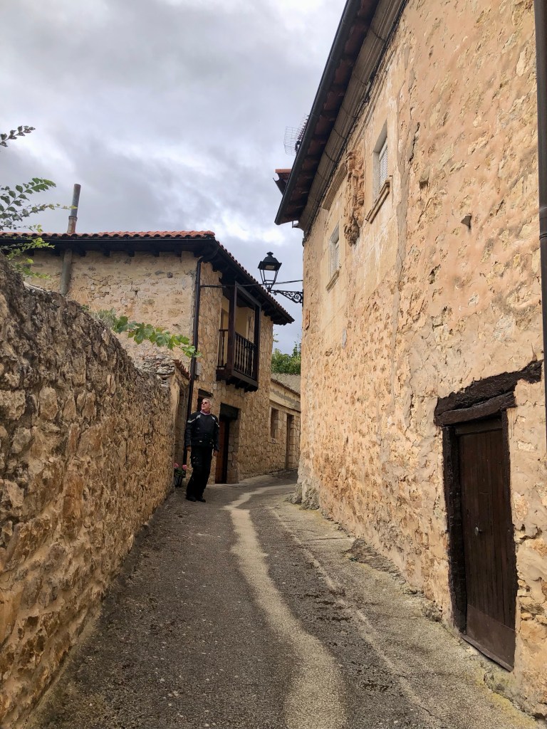 Letztendlich kamen wir bei Sonnenschein in Bisjuesces an. Noch nie gehört? wir kannten das kleine Dorf auch nicht. Wir hatten es nur ausgewählt, weil es dort ein passables Quartier, das unseren Preisvorstellungen entsprach gab und auf unserer weiteren Fahrstrecke lag. Nun die Übernachtung hatte sich gelohnt. Die Pension war in einem alten Torre untergebracht, sehr schön renoviert, gute Küche und extrem ruhige Lage. Ausserhalb der Sommermonate wohnen in Bisjuesces nur ca. 37 Personen, also wirklich kein Hotspot. Etliche Häuser stehen zum Verkauf, was nicht verwunderlich ist. Was macht man in so einer verlassenen Gegend? Vielleicht Homeoffice, aber sonst, eventuell Viehzucht, Gemüseanbau wird bei der anhaltenden Trockenheit schon etwas schwieriger. Aber es gibt doch etwas interessantes über den Ort zu berichten, war er einst die erste Hauptstadt von Kastilien. Die örtliche Kirche Johannes des Täufers – die sogenannte „Richterkirche“ – zeugt von der Macht und der Bedeutung im 9. Jahrhundert. Laut der Überlieferung gab es damals zwei eigenständige kastilische Richter, um den Gang zum Gericht nach Leon zu vermeiden. In der prächtigen Vorhalle, aus dem 16. Jahrhundert, sind die beiden Figuren der Richter abgebildet. Angeblich gab es auch ein Bankhaus in der Stadt. Glanz und Glorie sind längst verblasst. Heute freut man sich, wenn sich doch der eine oder andere Tourist dort hin verirrt.