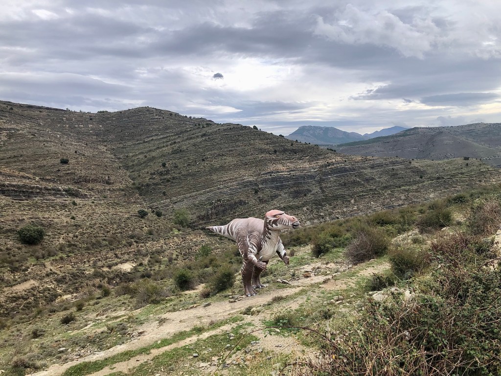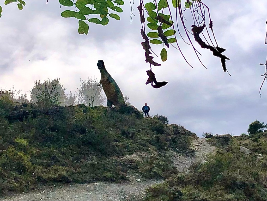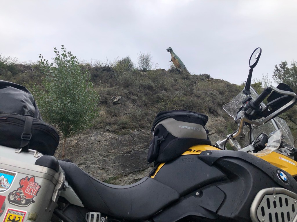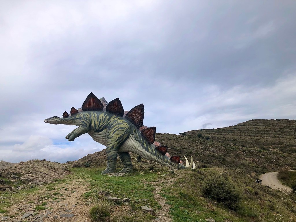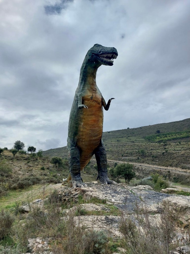 In Nordspanien wurden viele versteinerte Spuren von echten Dinos gefunden. Viele Fundorte liegen entlang dem Fluss Cidacos (ein 82 km langer Nebenfluß des Ebro). Auch wenn diese Giganten der Urzeiten vor 120 Millionen Jahren hier gelebt haben, faszinieren sie noch immer Groß und Klein. So begegnet man auf der ganzen Strecke immer wieder lebensgroßen Nachbildungen, die aus den Büschen lugen, neben der Schotterpiste lauern oder in windiger Höhe in die Talschluchten hinunter schauen. In Eniciso befindet sich ein Forschungszentrum für diese prähistorischen Lebewesen. Die Fahrt auf der Dino-Route war ziemlich entspannt, kleine Landstraßen, leichte Schotterpisten und ein gepflegtes Straßennetz durchzieht die Landschaft. Gelegentlich versuchte eine schwarze Regenwolke uns zu erwischen, aber nur mit mäßigem Erfolg.