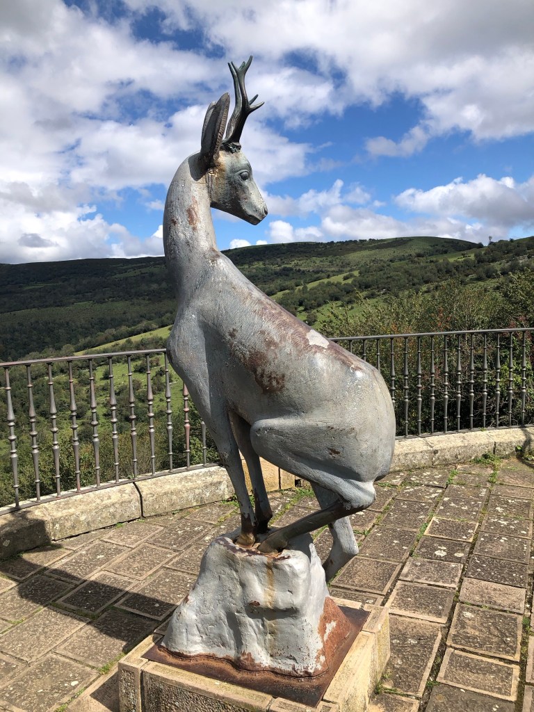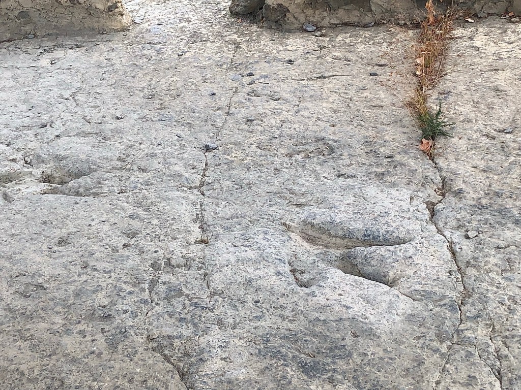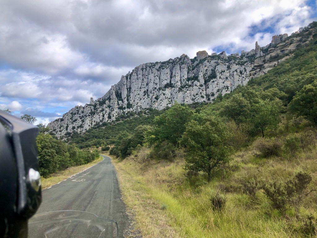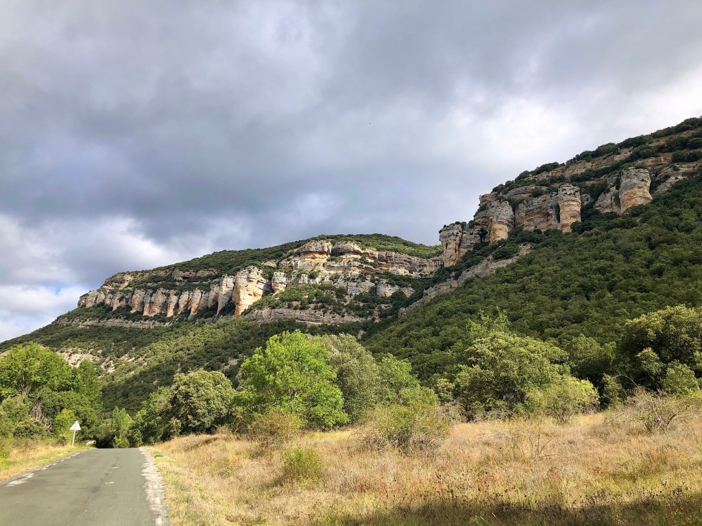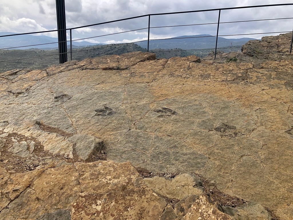In Nordspanien wurden viele versteinerte Spuren von echten Dinos gefunden. Viele Fundorte liegen entlang dem Fluss Cidacos (ein 82 km langer Nebenfluß des Ebro). Auch wenn diese Giganten der Urzeiten vor 120 Millionen Jahren hier gelebt haben, faszinieren sie noch immer Groß und Klein. So begegnet man auf der ganzen Strecke immer wieder lebensgroßen Nachbildungen, die aus den Büschen lugen, neben der Schotterpiste lauern oder in windiger Höhe in die Talschluchten hinunter schauen. In Eniciso befindet sich ein Forschungszentrum für diese prähistorischen Lebewesen. Die Fahrt auf der Dino-Route war ziemlich entspannt, kleine Landstraßen, leichte Schotterpisten und ein gepflegtes Straßennetz durchzieht die Landschaft. Gelegentlich versuchte eine schwarze Regenwolke uns zu erwischen, aber nur mit mäßigem Erfolg.