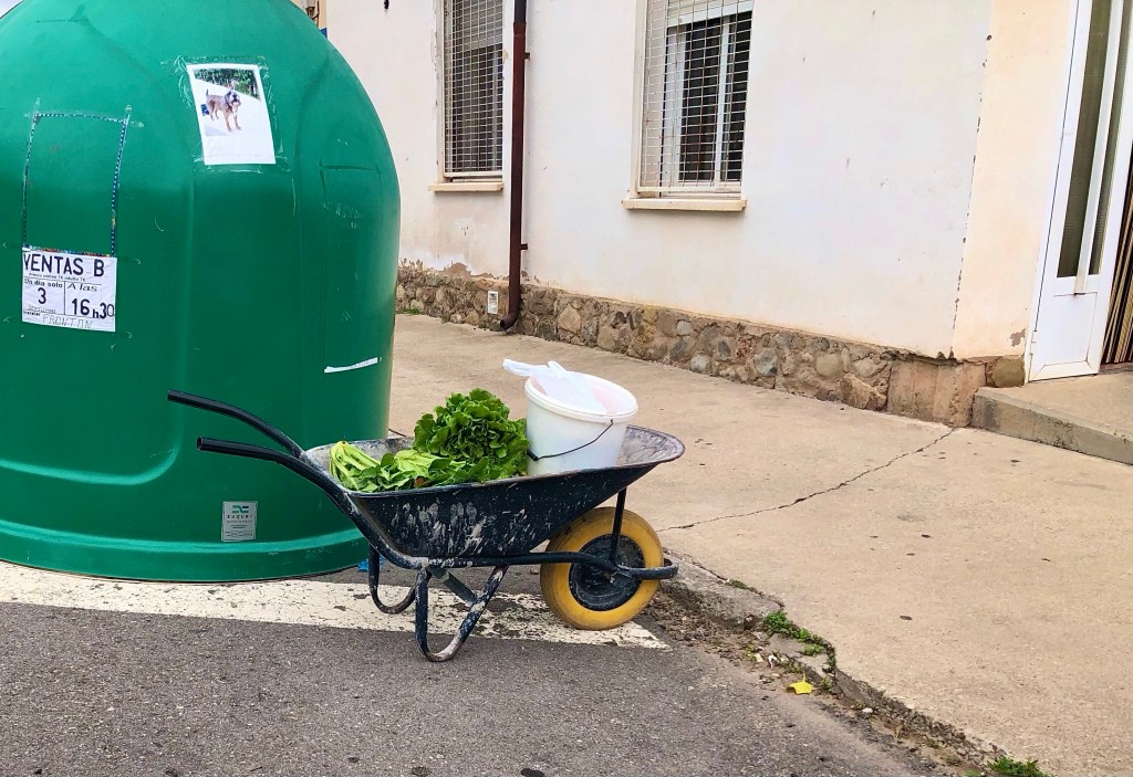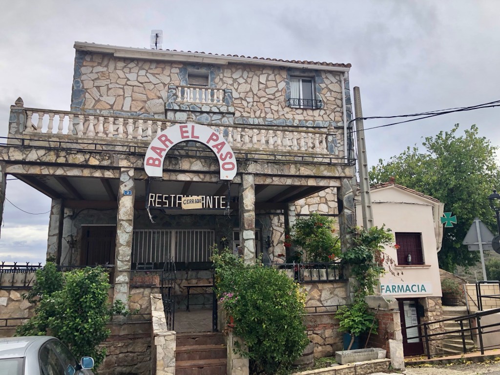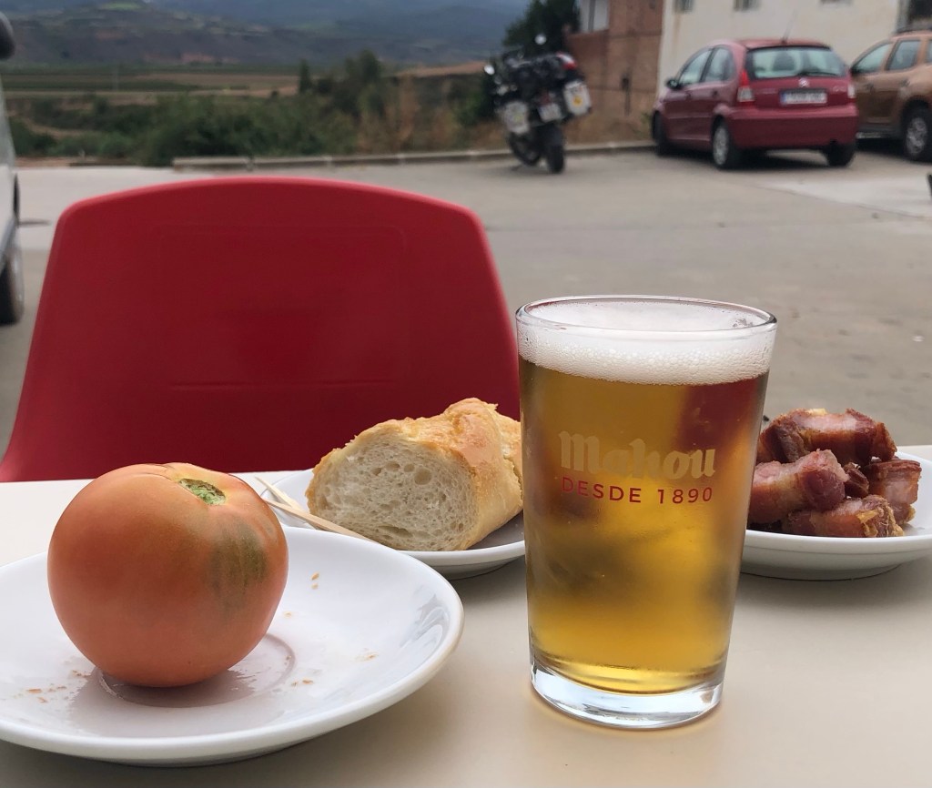 Von dem kleinen beschaulichen Örtchen aus setzten wir unsere Pilgerfahrt fort. Gerne machen wir Pause in kleinen Orten, die nicht in den Touristenprospekten auftauchen. Neben der zum Verkauf stehenden Bar El Paso in Ventos Blancos (oder so?) stand eine Scheibtruhe mit frischem Gemüse zum freien entnehmen. Der Bauer war bereits in der benachbarten Bar und freute sich über Bezahlung in Naturalien – Bier oder Wein. Nicht schlecht, das ist auch ein probates Geschäftsmodell! Während wir unseren frittierten Schweinebauch verschmausten, brauste ein Auto mit einem Anhänger voll mit geernteten Mandeln vorbei. Die Buben bestaunten unser Motorrad und warteten, dass wir wieder los fuhren, um mit dem Fahrrad ein Stück mit zu radeln. Wir winkten „Adios“. Langsam und gemächlich durchstreiften wir weiter die Landschaft, passierten interessante kleine Orte, kauften ein Los der Spanischen Weihnachtslotterie und kamen am Abend in Pechon am Campingplatz am Meer an.