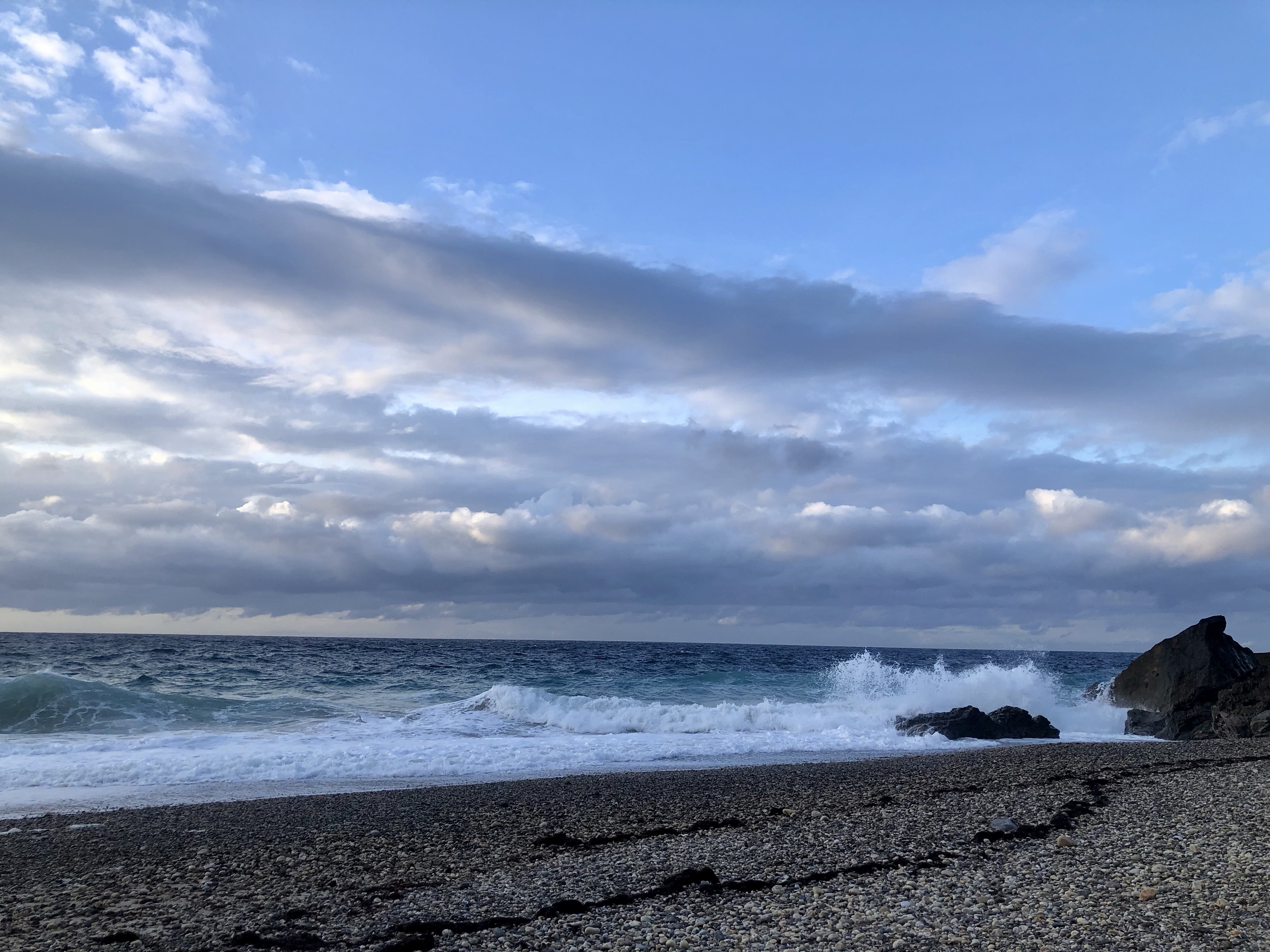 Nachdem unsere Taschen verstaut waren, also einfach rein gestellt waren, suchten wir den kleinen Supermarkt auf. Als echter Camper ist man ja Selbstversorger. Wurst, Brot und Käse hatten wir schon in einem kleinen Dorf am Weg gekauft. Bier, Wasser, Obst, Tomaten, Jogurt, Rotwein und ein Russischen Salat landete in der Einkaufstasche. Wir machten es uns auf der Heurigengarnitur bequem, soweit das auf den Holzbänken möglich ist und verschmausten unsere Köstlichkeiten mit Blick auf das blaue Meer. Danach spazierten wir durch die Campinganlage, vorbei an den zahlreichen unvermieteten Zelten, die scheinbar alle einen Defekt haben. Wir gingen runter zum Meer und genossen die schöne Abendstimmung.