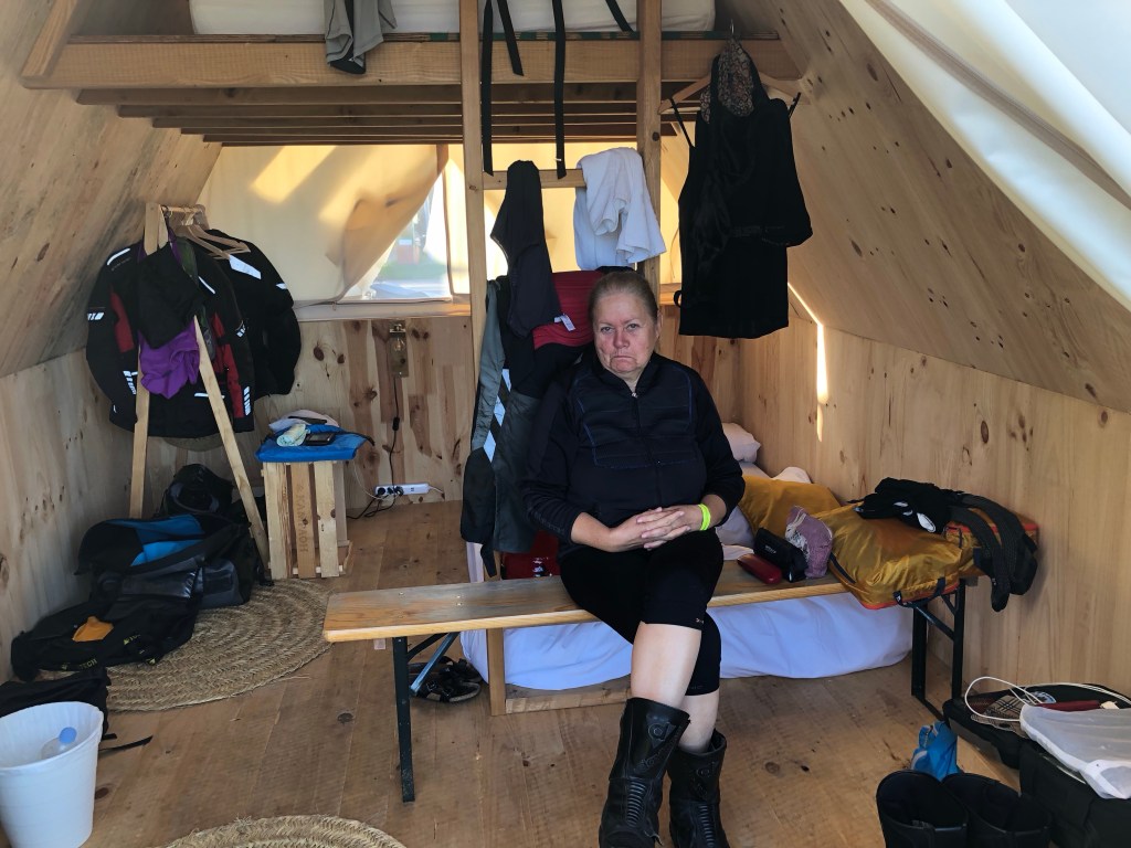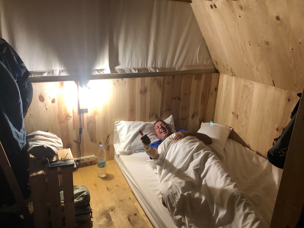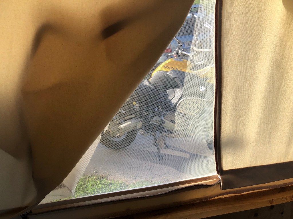 Die Ernüchterung erfolgte gleich bei der Registrierung in der Rezeption. Angeblich gab es irgendeinen Defekt bei unserem Zelt, was genau war nicht heraus zu finden. Ein vermeintliches Upgrade auf eine kleine Hütte oder das Hütten-Zelt-Kombi-Ding wäre natürlich schon vorbereitet. Alles recht komisch, denn zu sehen waren ziemlich viele Zelte und keine Leute. Das alles vergeben ist, glaubten wir nicht. Aber was soll´s! Skeptisch schauten wir uns die beiden Modelle vor Ort an. Die Hütte war ein Witz, kaum größer wie eine Schuhschachtel mit einem riesigen Fenster, einfach aus Bauholz billigst zusammengezimmert. Das Hüttel-Zelt-Kombi-Ding war da schon flächenmäßig etwas großzügiger. Ausserdem konnte man mit dem Bock direkt ran fahren und auch dort parken. Die Sanitäranlagen waren ebenfalls näher, was sich als ein großer Vorteil herausstellen sollte. Als Sitzmöglichkeit gab es eine Heurigengarnitur vor der Behausung. Drinnen war alles ganz schlicht, ein wackeliger Kleiderständer, den wir mit einer Schnur an einen Pfosten fest machten, damit er nicht gleich zusammenbricht, wenn wir unsere Motorradkleidung aufhängen. Die weiteren Ablagemöglichkeiten waren zwei Obstkisten. Die Küchenutensilien bestanden aus zwei Tellern, Essbesteck und zwei Gläsern, Geschirrspülmittel und einem halben Schwämmchen, Aber es gab einen kleinen Kühlschrank, einige Steckdosen und eine Glühbirne. Das Bette war eine Matratze am Boden, wenigstens mit frischem Bettzeug bezogen und frische Handtücher lagen darauf. In der Hütte war noch ein Zwischenboden für ein drittes Bett eingezogen, das über eine robuste fix montierte Leiter erklettert werden konnte. Viel Platz war nicht da oben, das war für uns eh egal, weil wir es nicht brauchten. Ich bin ja nicht so groß, aber der Bock-Chef hatte sich bei der Zwischendecke mehrmals den Kopf angeschlagen, die war einfach zu niedrig. Die Campingfreuden waren vorerst etwas getrübt.