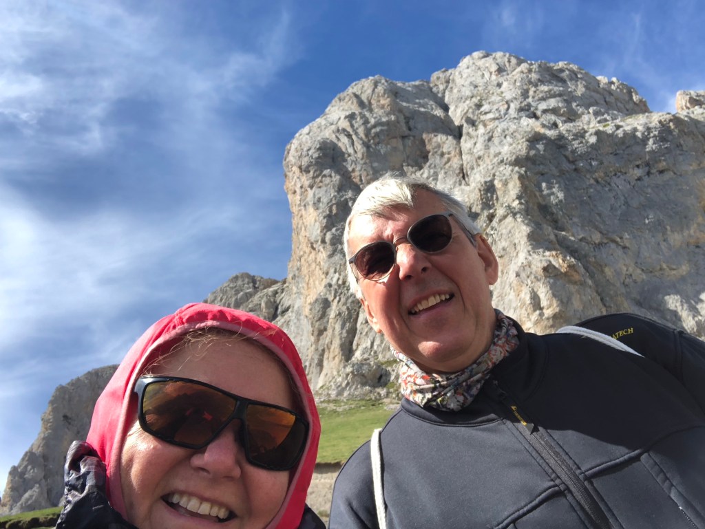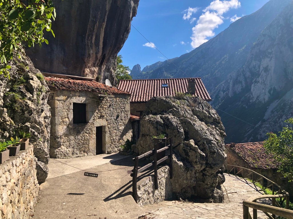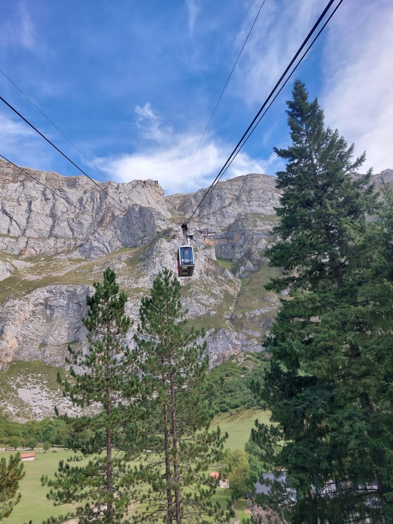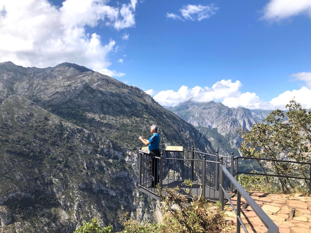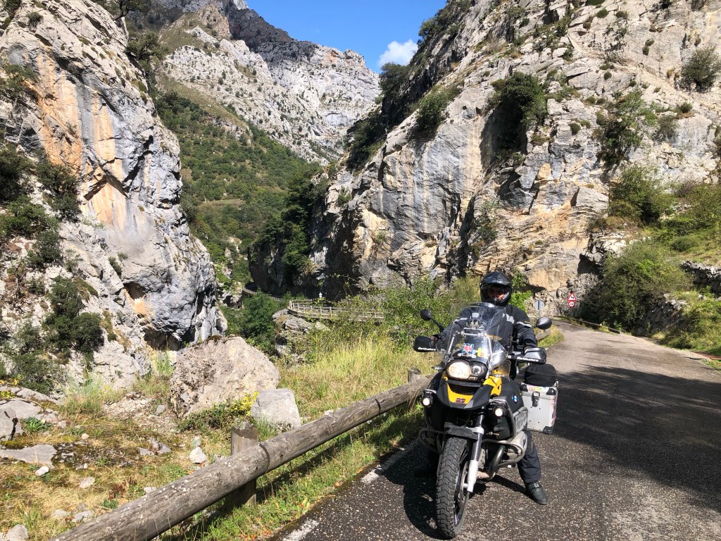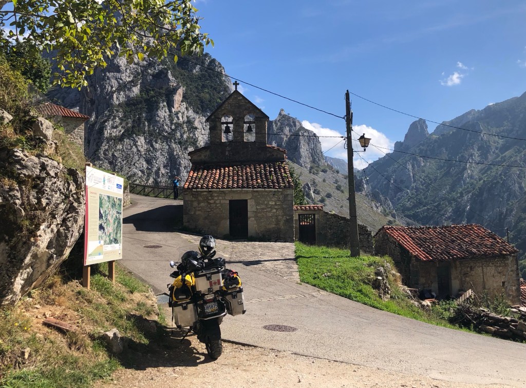 Tibet ist umgeben von den höchsten Bergen der Welt. Eine Inspiration nach weiteren hohen Bergen in Spanien zu suchen. Die Pyrenäen hatten wir zwischenzeitlich schon hinter uns gelassen. Auf unserem Weg nach Santiago de Compostela war die Suche nicht wirklich schwer, denn ein beeindruckendes Bergmassiv lag direkt vor uns. Zwar erreichen die Bergriesen hier nur eine Höhe von rd. 2600 m, aber auch bei den „Gipfeln Europas“ – Picos de Europa in Kantabrien – sind an die zweihundert 2000-er Berggipfel aufgefädelt nebeneinander. Das Gebirge liegt nahe der Küste, was es so aussergewöhnlich macht. Die Entstehungsgeschichte liegt Millionen von Jahre zurück als die Afrikanische Platte auf die Europäischen Platte traf. Wir näherten uns den Picos quasi von allen Seiten. Mehrere Tage umrundeten wir mit dem Motorrad diese Giganten, durchstachen Schluchten und erklommen die Höhen, so weit das für nicht Wanderfexe gut möglich war. In Fuente De stellten wir uns brav in die Warteschlange bei der Gondelbahn. Den Ansturm hatten wir wochentags nicht erwartet, aber scheinbar hatten alle ihre Wetter-App befragt, um den brillianten Tag für den Aufstieg zu nutzen. Die Seilbahn befördert die Kabinen über ein frei schwebendes 1400 langes Stahlseil auf eine Höhe von 1800m. Puh, ganz schön hoch schwebten wir da hinauf. Es gibt zahlreiche gut beschilderte Wanderrouten, von denen man die Bergpanoramen aus den verschiedensten Perspektiven bestaunen konnte. Bergab ging’s dann ganz rasant, in nur vier Minuten waren wir mit dem Teleferic wieder unten.
