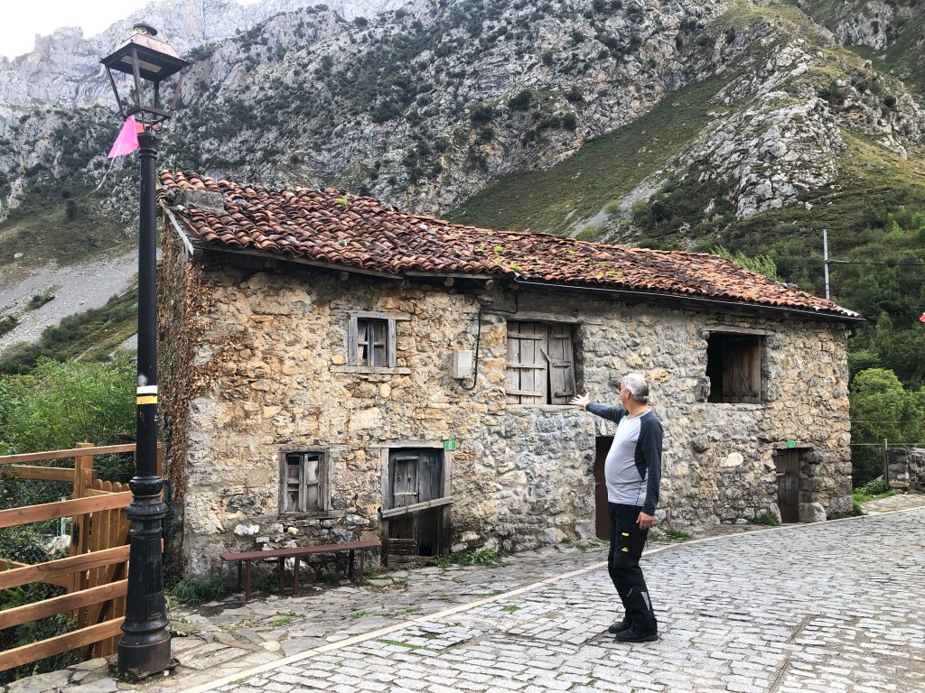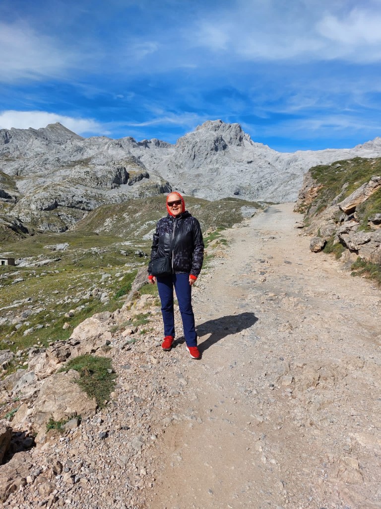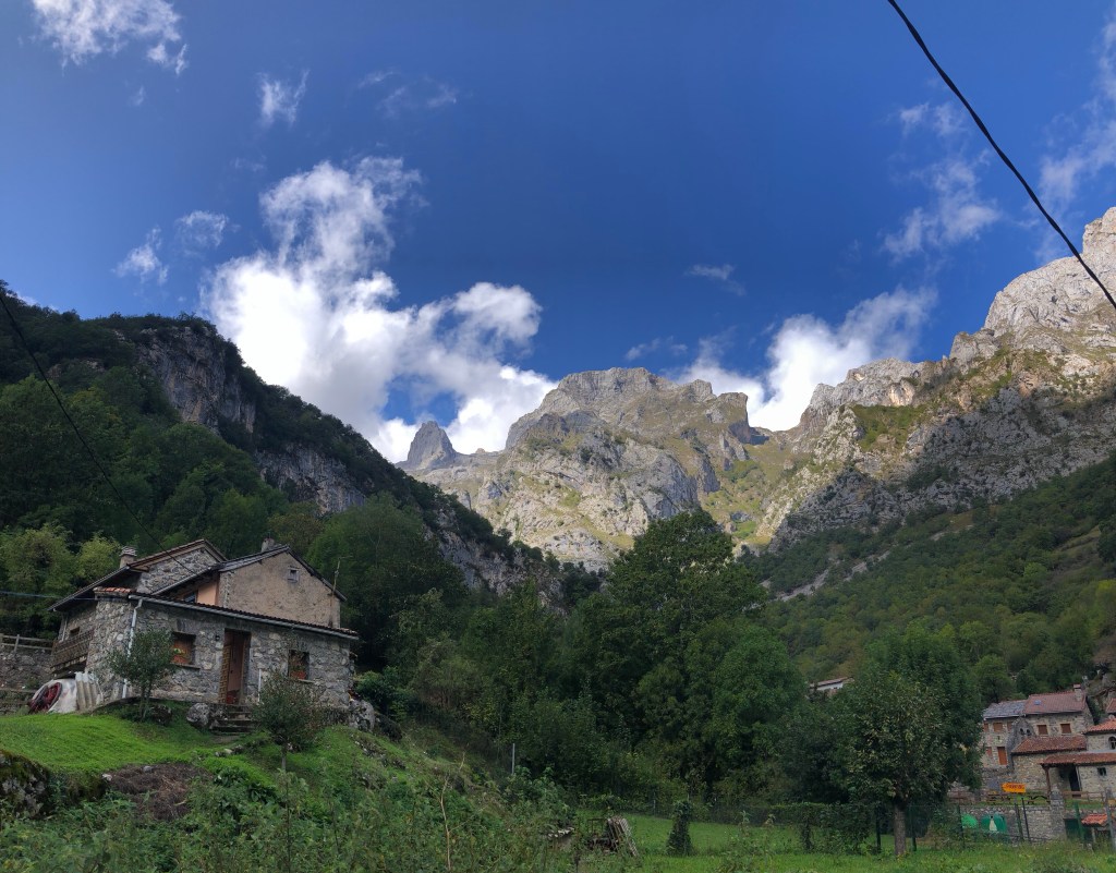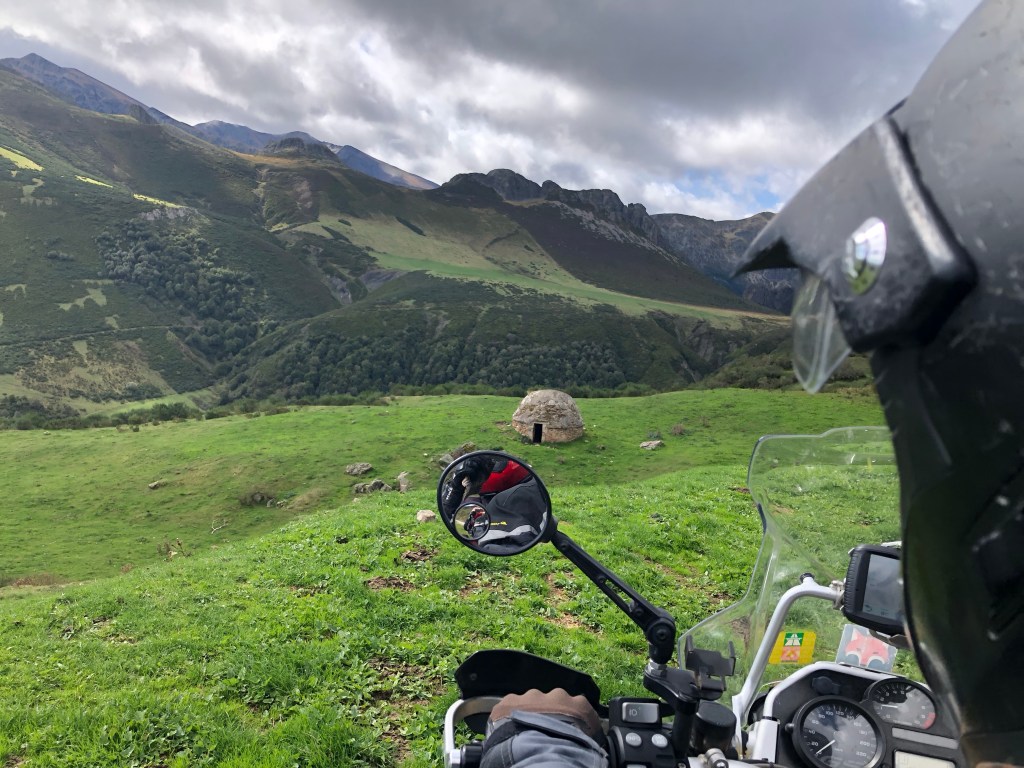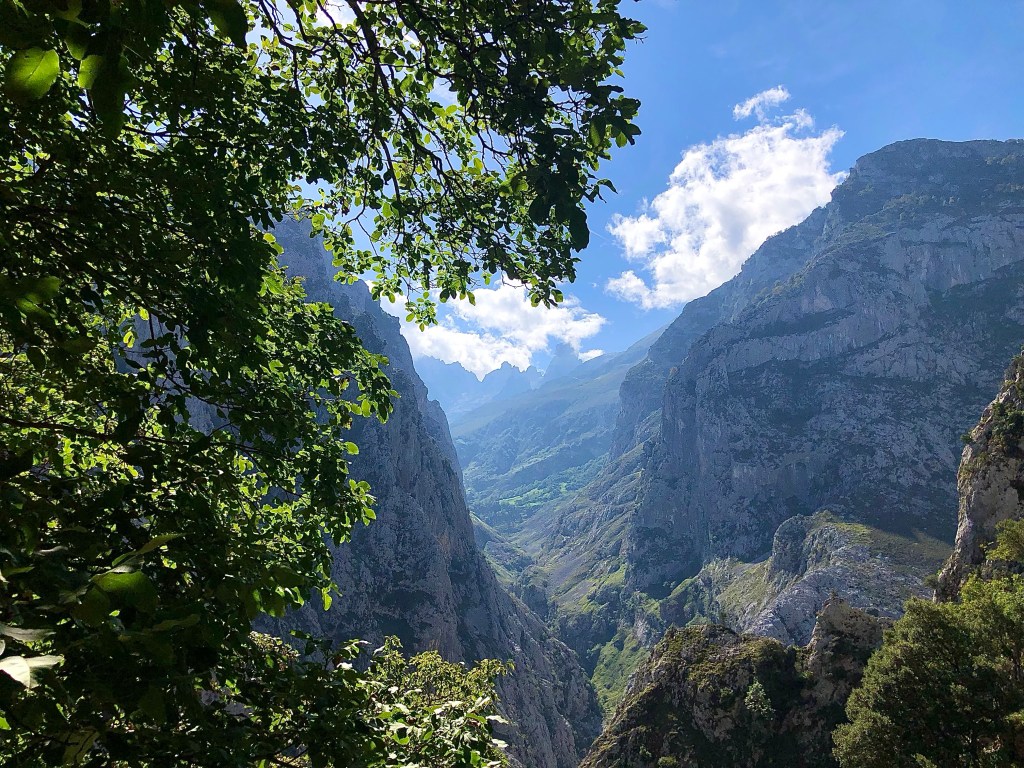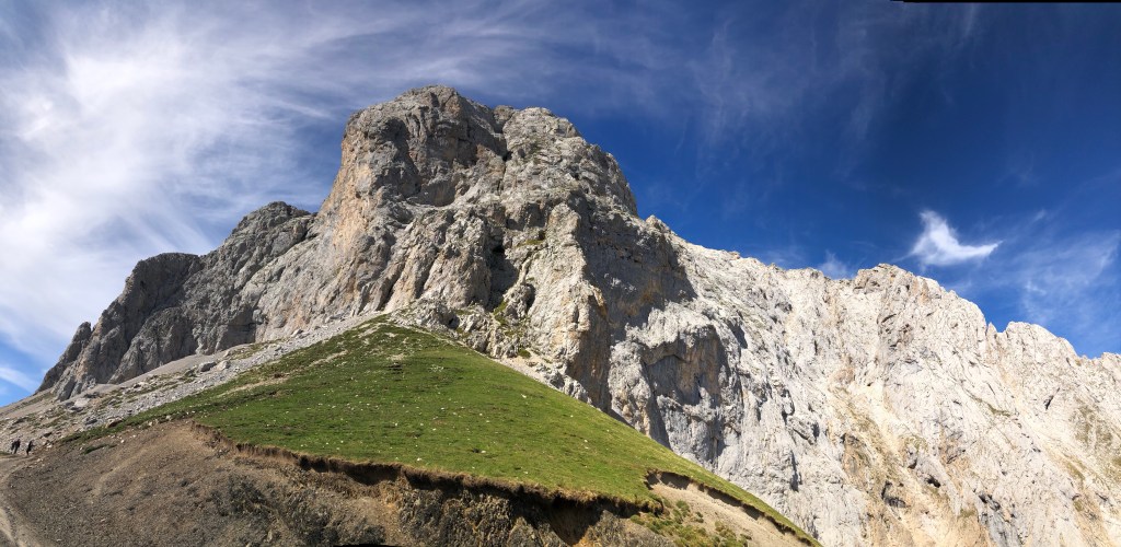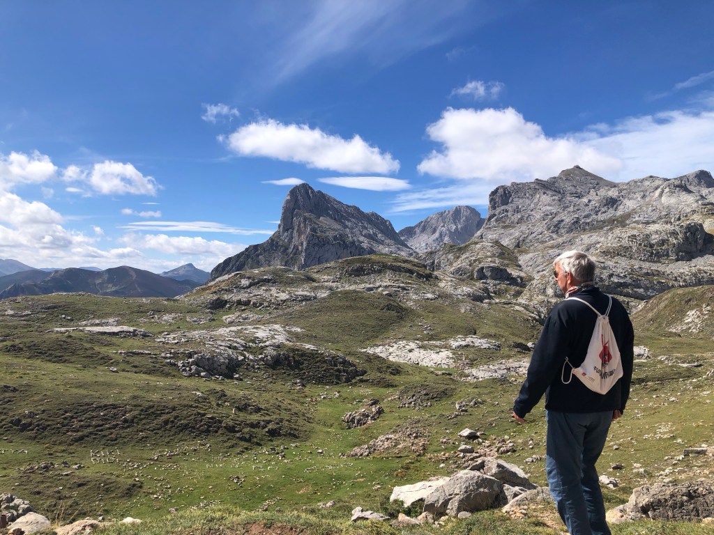 Tibet ist umgeben von den höchsten Bergen der Welt. Eine Inspiration nach weiteren hohen Bergen in Spanien zu suchen. Die Pyrenäen hatten wir zwischenzeitlich schon hinter uns gelassen. Auf unserem Weg nach Santiago de Compostela war die Suche nicht wirklich schwer, denn ein beeindruckendes Bergmassiv lag direkt vor uns. Zwar erreichen die Bergriesen hier nur eine Höhe von rd. 2600 m, aber auch bei den „Gipfeln Europas“ – Picos de Europa in Kantabrien – sind an die zweihundert 2000-er Berggipfel aufgefädelt nebeneinander. Das Gebirge liegt nahe der Küste, was es so aussergewöhnlich macht. Die Entstehungsgeschichte liegt Millionen von Jahre zurück als die Afrikanische Platte auf die Europäischen Platte traf. Wir näherten uns den Picos quasi von allen Seiten. Mehrere Tage umrundeten wir mit dem Motorrad diese Giganten, durchstachen Schluchten und erklommen die Höhen, so weit das für nicht Wanderfexe gut möglich war. In Fuente De stellten wir uns brav in die Warteschlange bei der Gondelbahn. Den Ansturm hatten wir wochentags nicht erwartet, aber scheinbar hatten alle ihre Wetter-App befragt, um den brillianten Tag für den Aufstieg zu nutzen. Die Seilbahn befördert die Kabinen über ein frei schwebendes 1400 langes Stahlseil auf eine Höhe von 1800m. Puh, ganz schön hoch schwebten wir da hinauf. Es gibt zahlreiche gut beschilderte Wanderrouten, von denen man die Bergpanoramen aus den verschiedensten Perspektiven bestaunen konnte. Bergab ging’s dann ganz rasant, in nur vier Minuten waren wir mit dem Teleferic wieder unten.