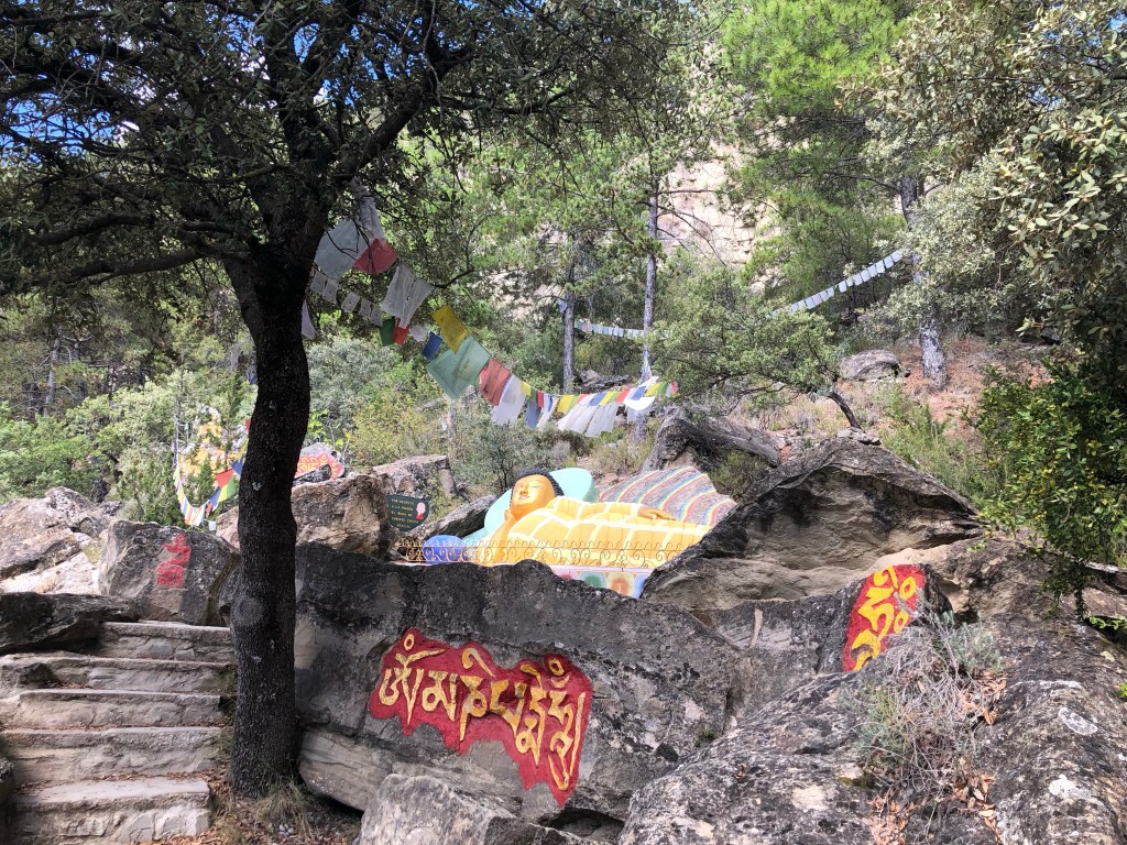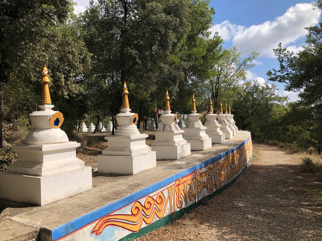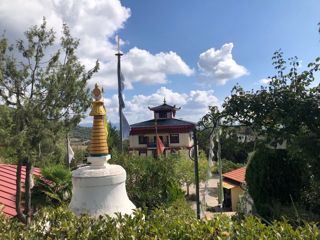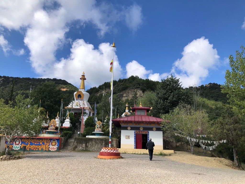 Hier in Nordspanien ist es uns so ergangen. Wir fuhren so dahin und plötzlich leuchteten uns in der Ferne aus den Wäldern goldene Kuppeln entgegen. Den Lenker scharf nach rechts eingeschlagen und schon standen wir in Dag Shang Kagyü – mitten in Tibet. Gleich beim Eingang zum buddhistische Zentrum in den spanischen Pyrenäen liegt ein großer goldener Buddha umgeben von Gebetsfahnen und Inschriften auf den umliegenden Steinen. Die aufwändig bemalten Stupen, ein großer Schrein mit Gebetsmühlen, ein Gästehaus mit einem Versammlungsraum und die „Wege der Erkenntnis“ versetzten uns in eine ganz andere Welt. Der Dalai Lama lächelte uns von einem Bild auf Augenhöhe entgegen. Meditative Klänge aus einem Tempel und die ausgestrahlte Ruhe, die der Ort vermittelte, ließ auch uns innehalten. Ein schönes Gefühl, denn ein weiter Weg liegt auf dieser Reise noch vor uns.