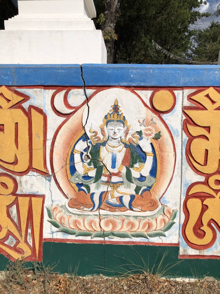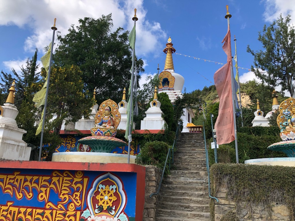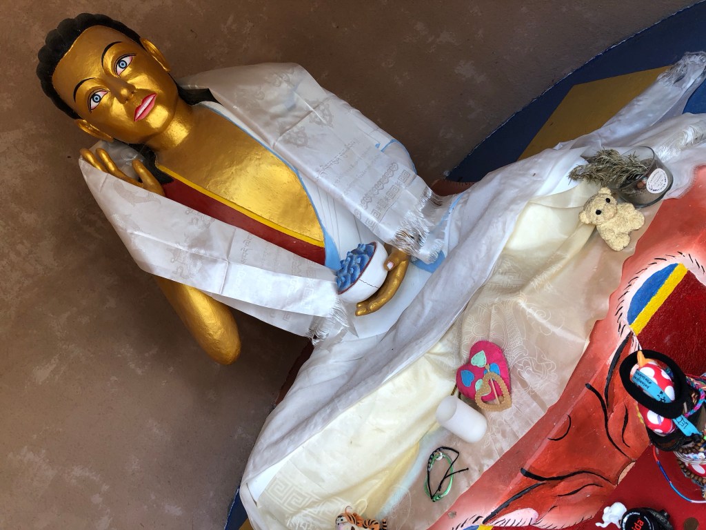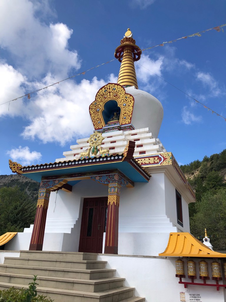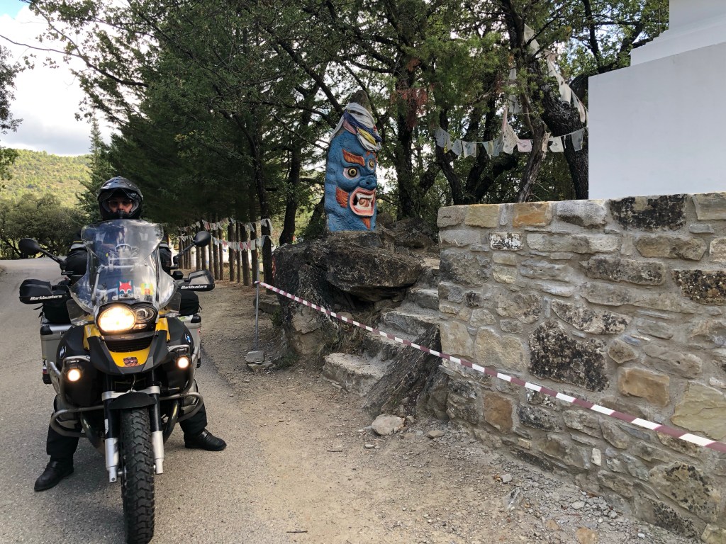 Hier in Nordspanien ist es uns so ergangen. Wir fuhren so dahin und plötzlich leuchteten uns in der Ferne aus den Wäldern goldene Kuppeln entgegen. Den Lenker scharf nach rechts eingeschlagen und schon standen wir in Dag Shang Kagyü – mitten in Tibet. Gleich beim Eingang zum buddhistische Zentrum in den spanischen Pyrenäen liegt ein großer goldener Buddha umgeben von Gebetsfahnen und Inschriften auf den umliegenden Steinen. Die aufwändig bemalten Stupen, ein großer Schrein mit Gebetsmühlen, ein Gästehaus mit einem Versammlungsraum und die „Wege der Erkenntnis“ versetzten uns in eine ganz andere Welt. Der Dalai Lama lächelte uns von einem Bild auf Augenhöhe entgegen. Meditative Klänge aus einem Tempel und die ausgestrahlte Ruhe, die der Ort vermittelte, ließ auch uns innehalten. Ein schönes Gefühl, denn ein weiter Weg liegt auf dieser Reise noch vor uns.